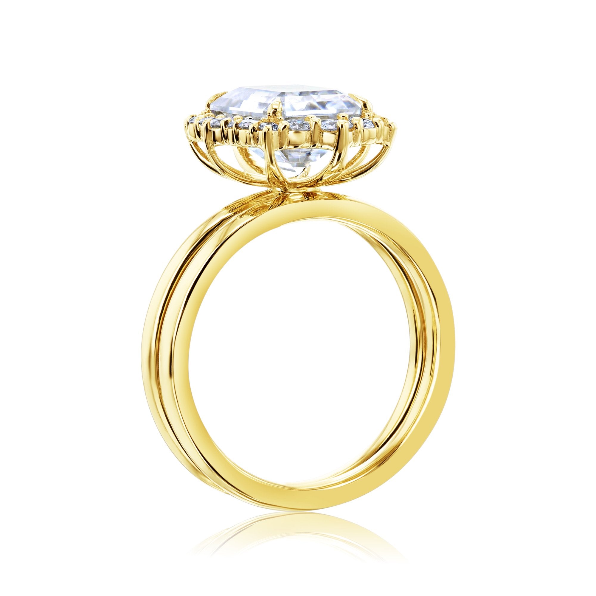 The Elizabeth Bridal Set is one of the six bridal wedding sets from our vintage styled collection, The August. It features an engagement ring with a 9x7 mm emerald moissanite gemstone illuminated with a halo of 20 round lab-grown diamonds prong-set in a stunning 14-karat solid gold metal with a high polish finish. It comes with a separate matching solid gold wedding band also crafted in solid 14-karat gold.
