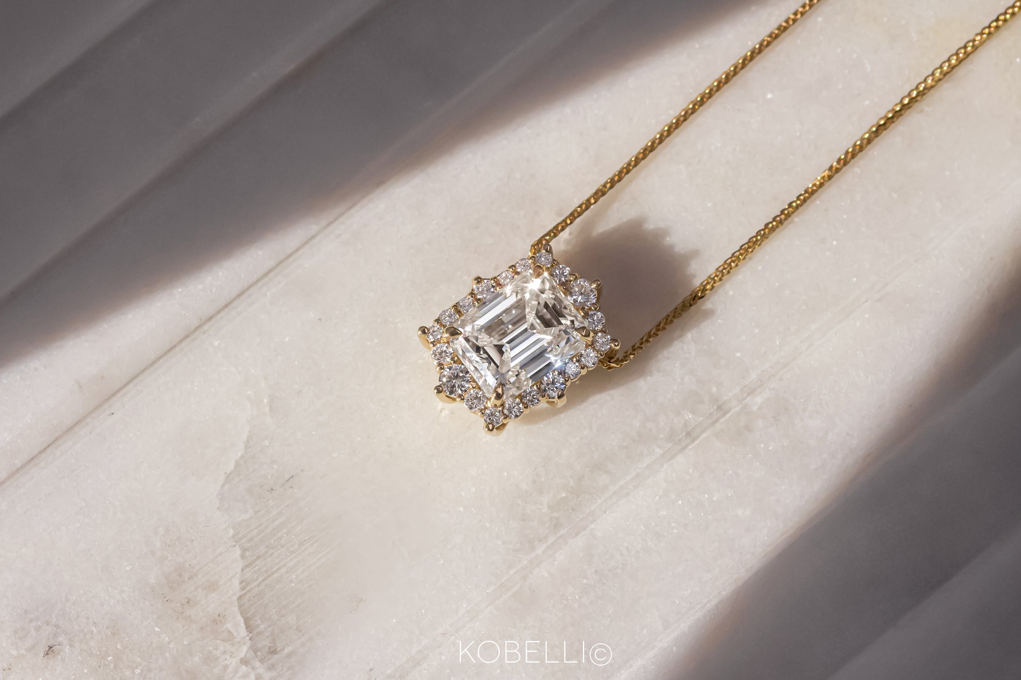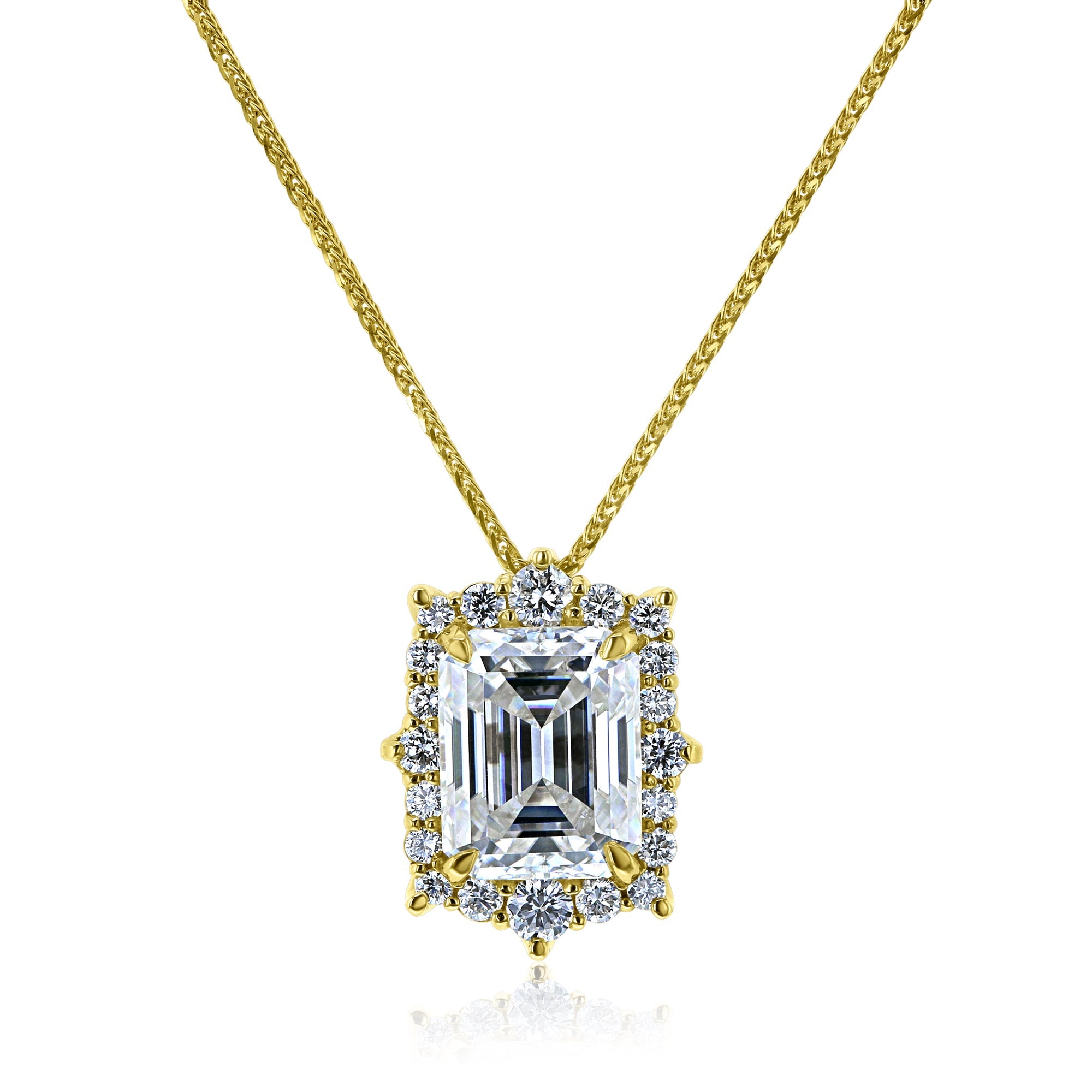 Elizabeth Necklace - 4ct.tw Emerald Moissanite with Lab Grown Diamond Halo Pendant and Chain