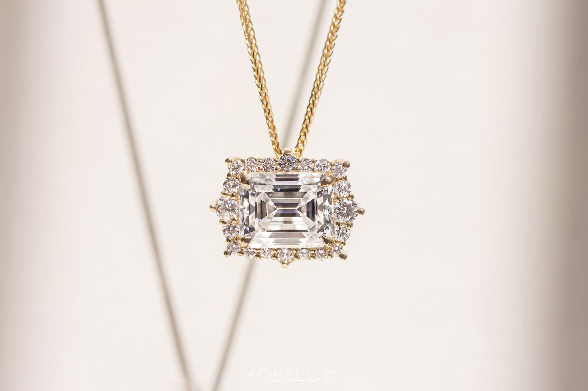Our Elizabeth Necklace comes strung to a fully adjustable gold chain, extending up to 22 inches, making it a ​versatile accessory matching to any ensemble. A graduating halo comprised of genuine lab-grown white diamonds frames the beautiful 10x8 mm emerald-cut moissanite center stone. The stones are set in 14-karat gold metal and are finished with a high polish. Caging arches of solid gold streamers bind the backside of the pendant in a simple yet antique fashion flare.
