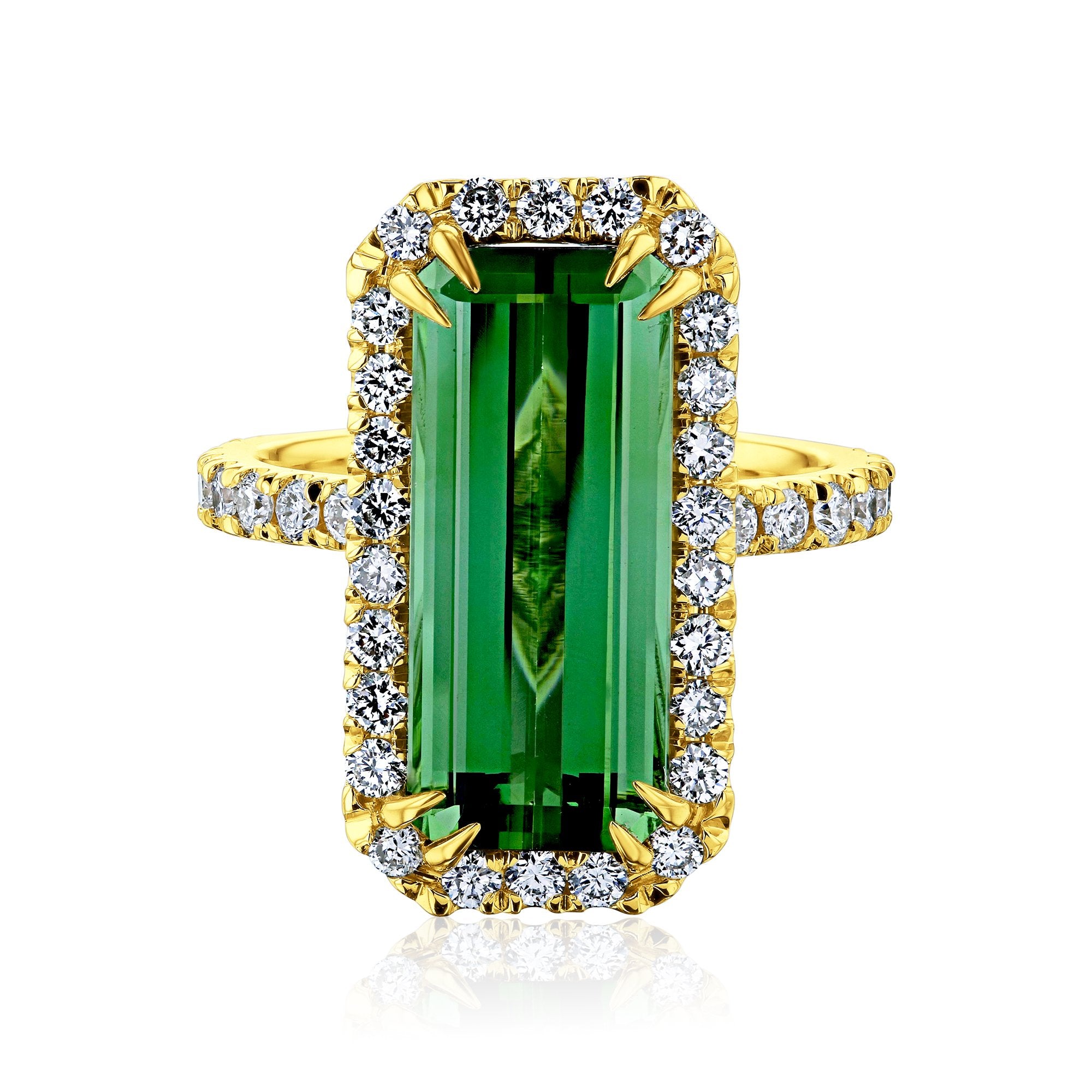 Elongated Double-Prong Green Tourmaline Ring with Lab-Grown Diamond Halo (part of our latest Color Collection)