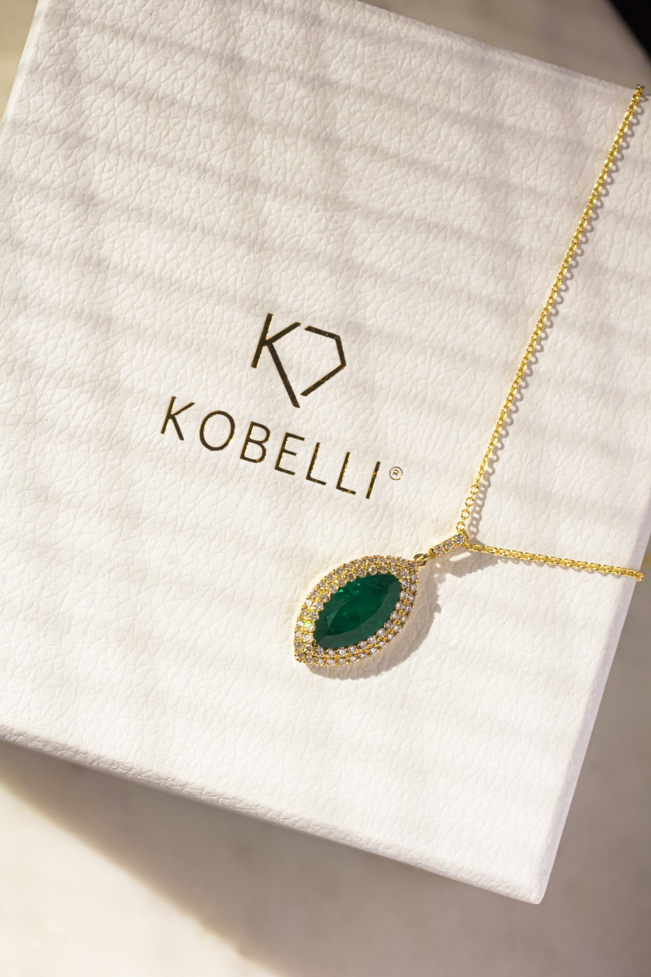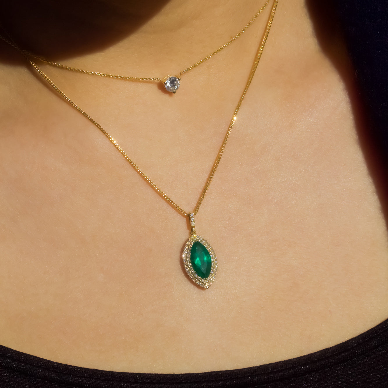 The simple charms of a basic design has the power to bring out the perfect accents to your color coordinated garments. Known as, The Jewel of Kings, green emerald symbolizes wisdom as well as foresight. A boat-shaped marquise-cut green emerald centers around a shimmering double halo of genuine white diamonds. Fitting to the upscale materials of the precious gemstones is the solid 18-karat yellow gold metal for which both the pendant and chain have been crafted from.
