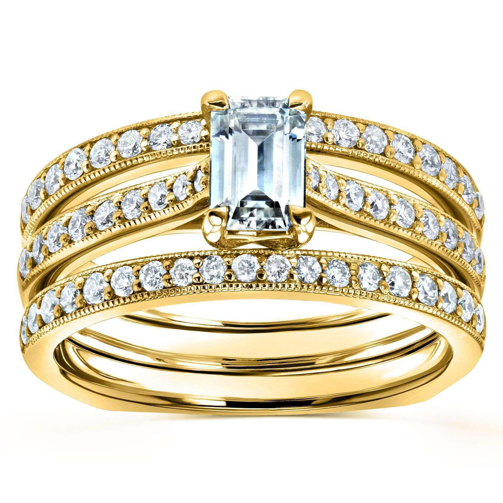 An emerald-cut moissanite is held with an x-prong trellis setting over fourteen-karat gold and pave-set side diamonds. The diamonds are all genuine stones harvested from the earth from conflict-free sources. The center moissanite gemstone is a lab-created perfected stone made to uphold the strength of a diamond while sparkling even greater than one with its famed fire power. The moissanite selected here is of colorless DEF color grade meaning it carries absolute bright white undertones for a more glamorous look. The bands on these three rings are decorated with vintage style milgrain edges which instantly enhances the dazzling diamonds with a dynamic of textures and a captivating appearance fit for royalty. The smart design of this wedding set features a square shank known as a European shank to help prevent the rings from spinning off center as you wear it.