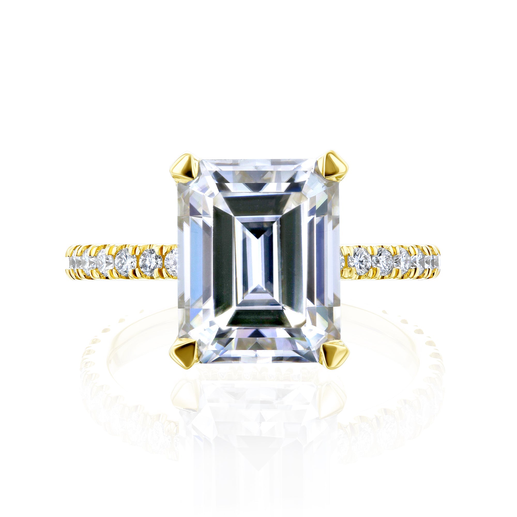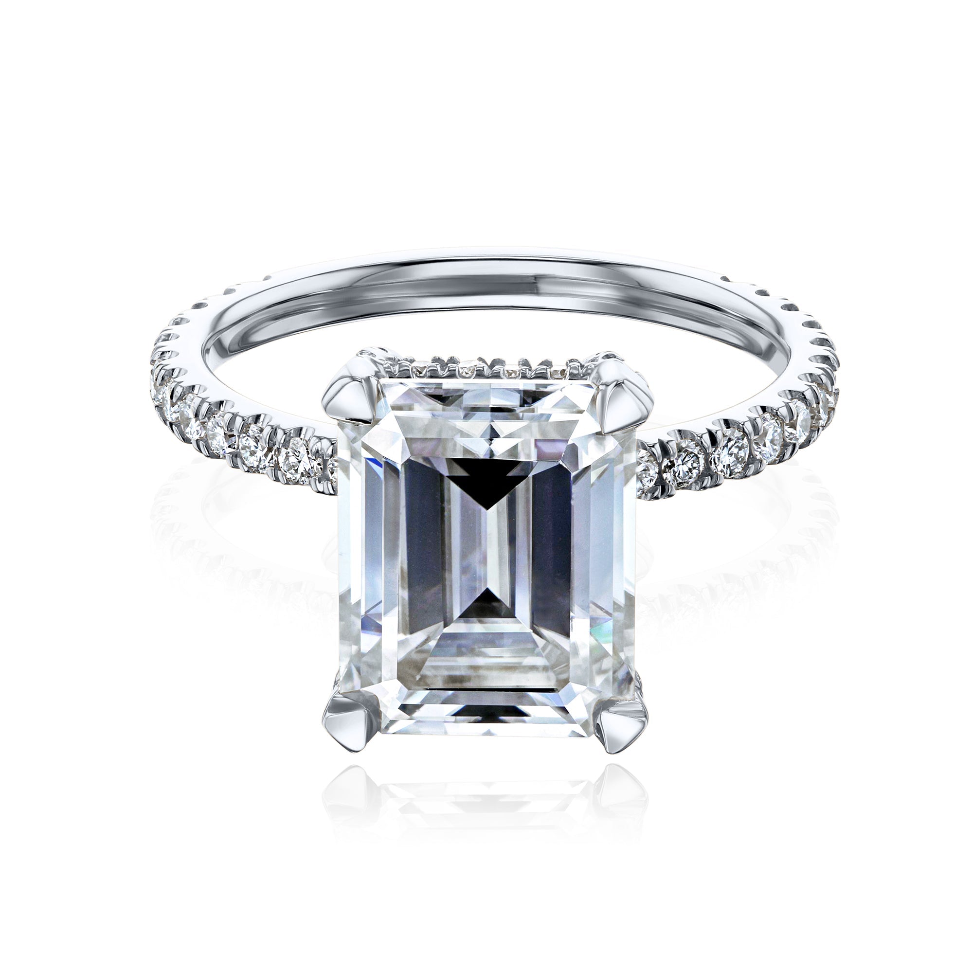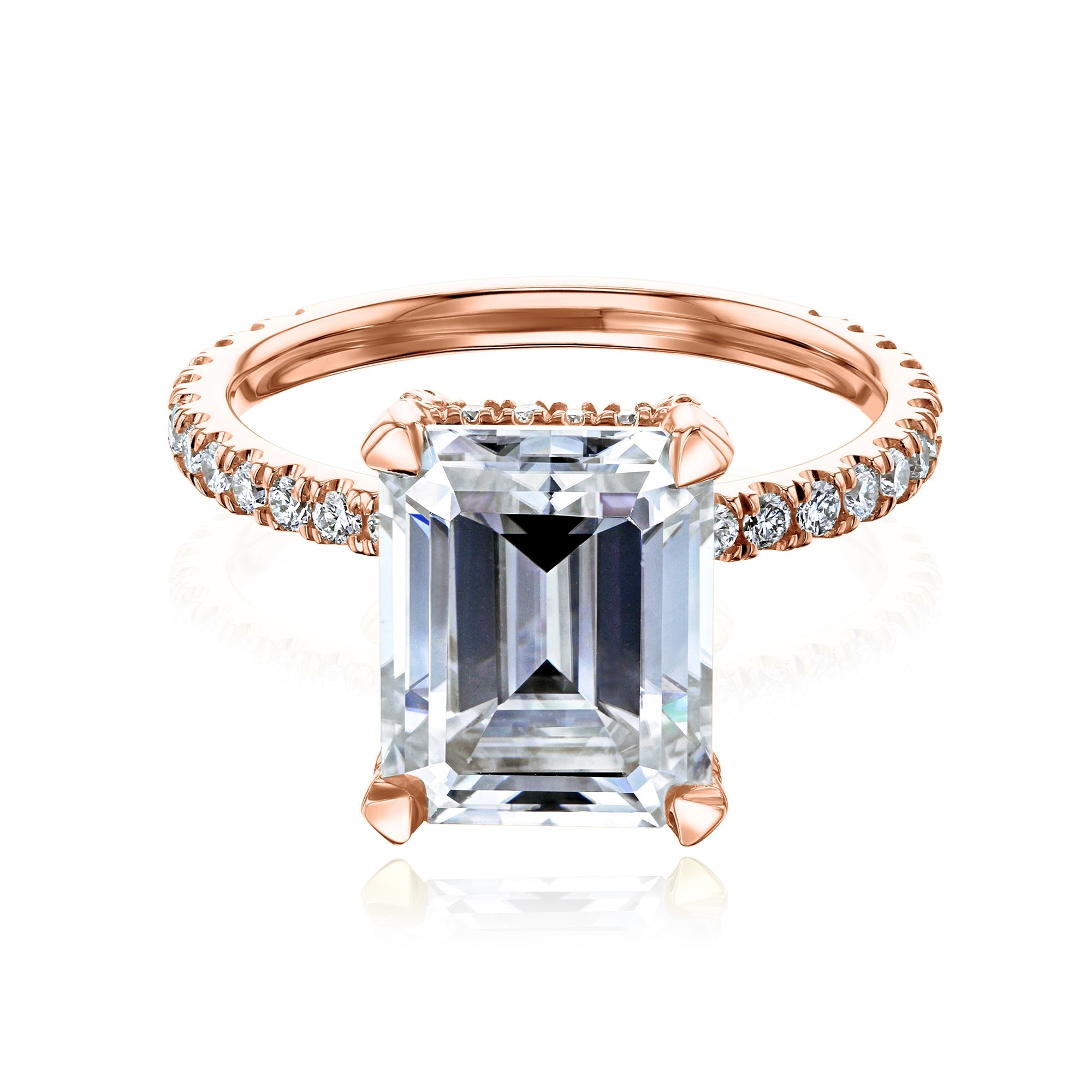 The Eri 10x8 engagement ring features a 10x8 mm (3.5 carats diamond equivalent weight) emerald moissanite center stone with a hidden halo of lab-grown diamonds in a slim basket setting. The basket and shank are illuminated with pavé lab-grown diamonds in a semi-eternity fashion.
