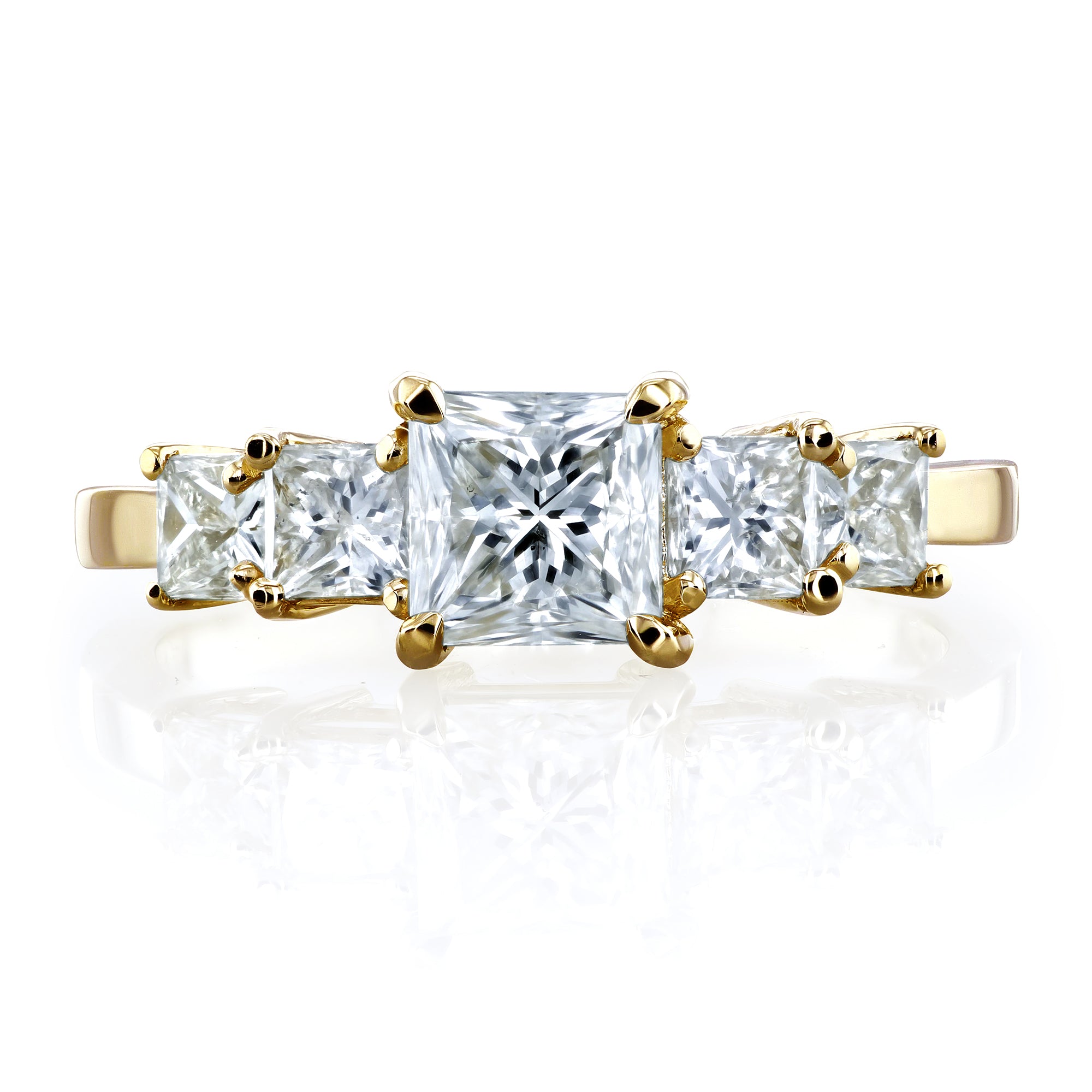 Five diamonds are prong-set to this 14 karat yellow gold engagement ring. The center EGL certified diamond is H color with VS2 clarity while the other diamonds are SI clarity.