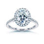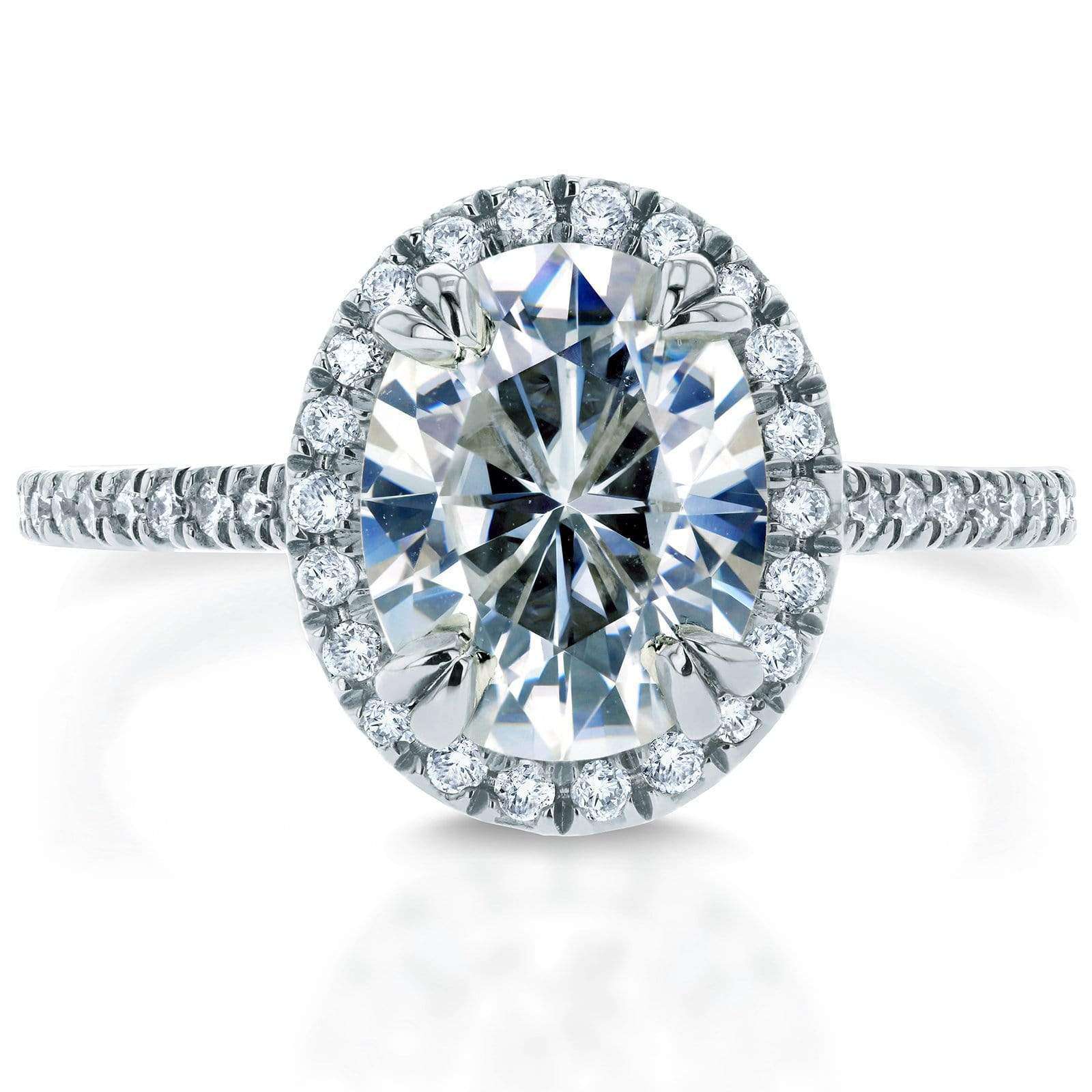 An oval 9X7mm moissanite is set on the center of this halo diamond engagement ring in 14-karat gold. The ring is finished with a high polish.