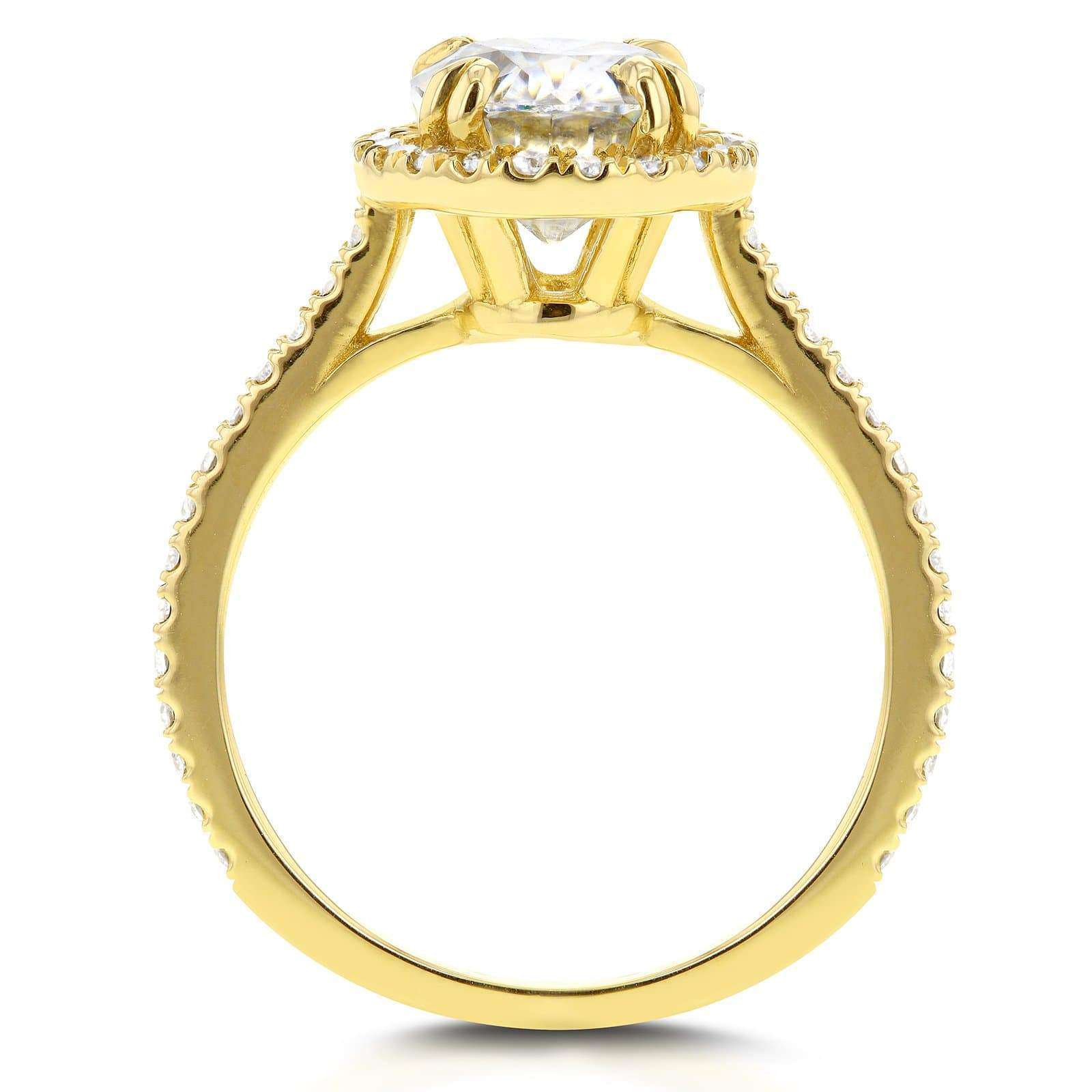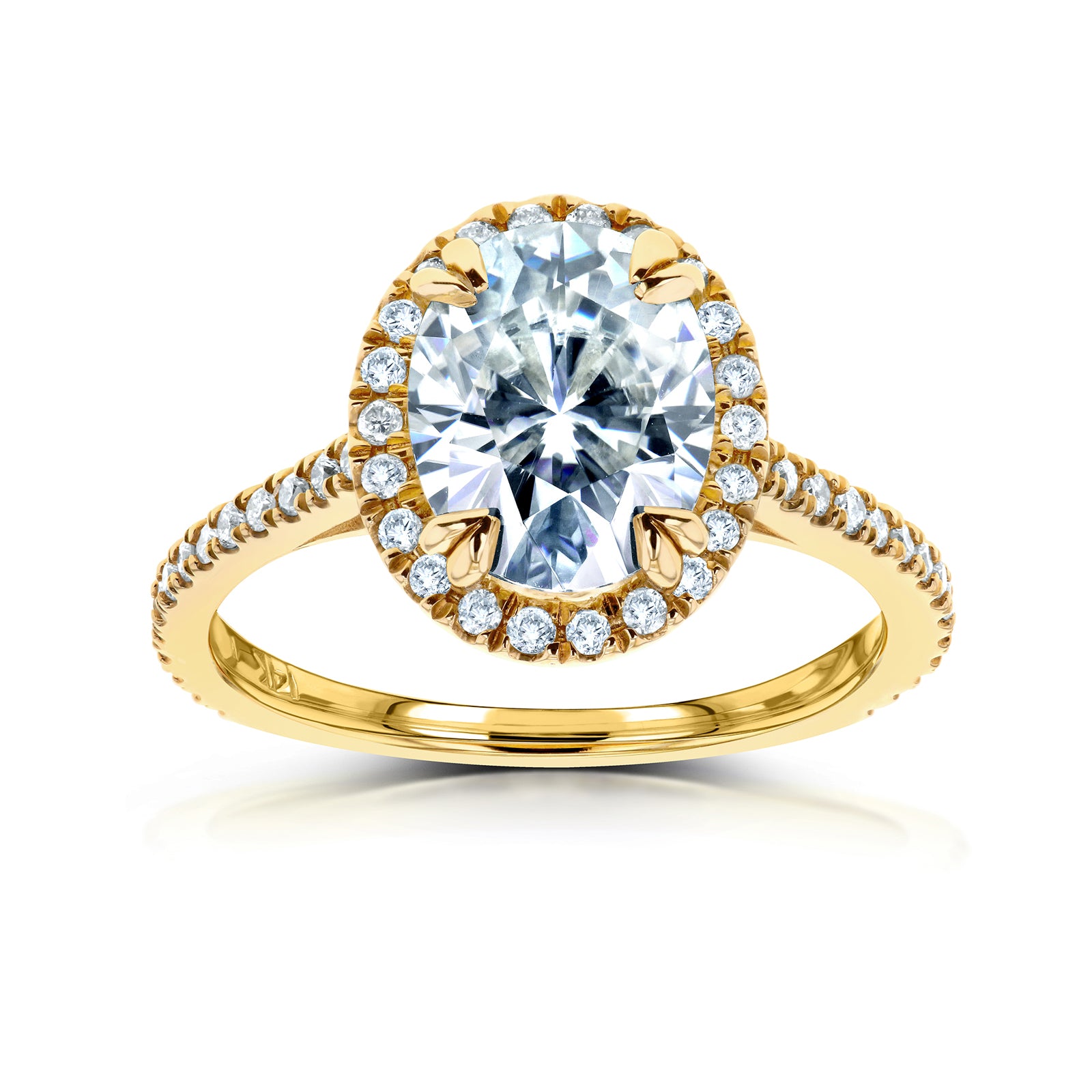 An oval 9X7mm moissanite is set on the center of this halo diamond engagement ring in 14-karat gold. The ring is finished with a high polish.