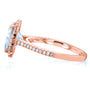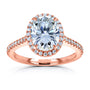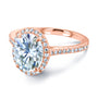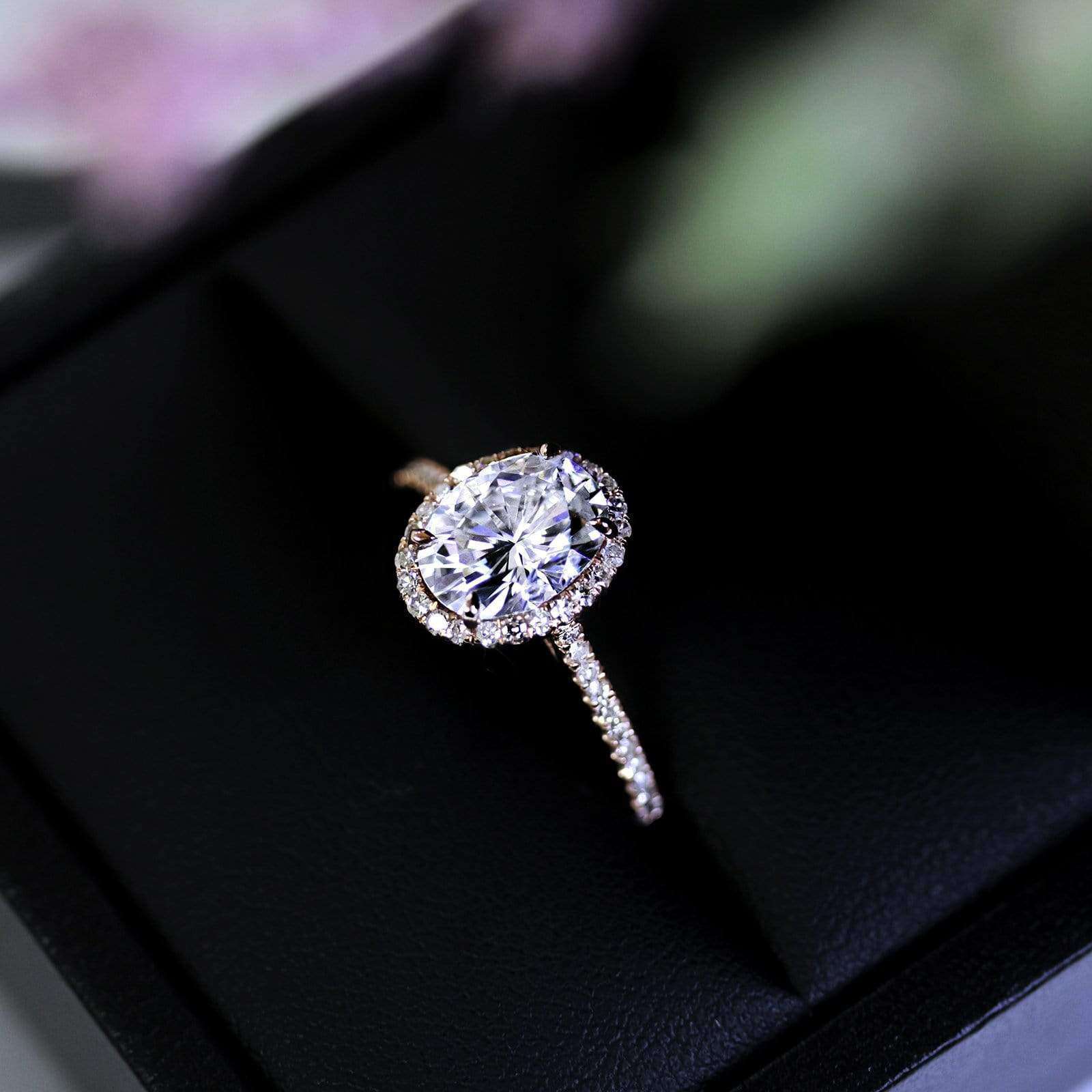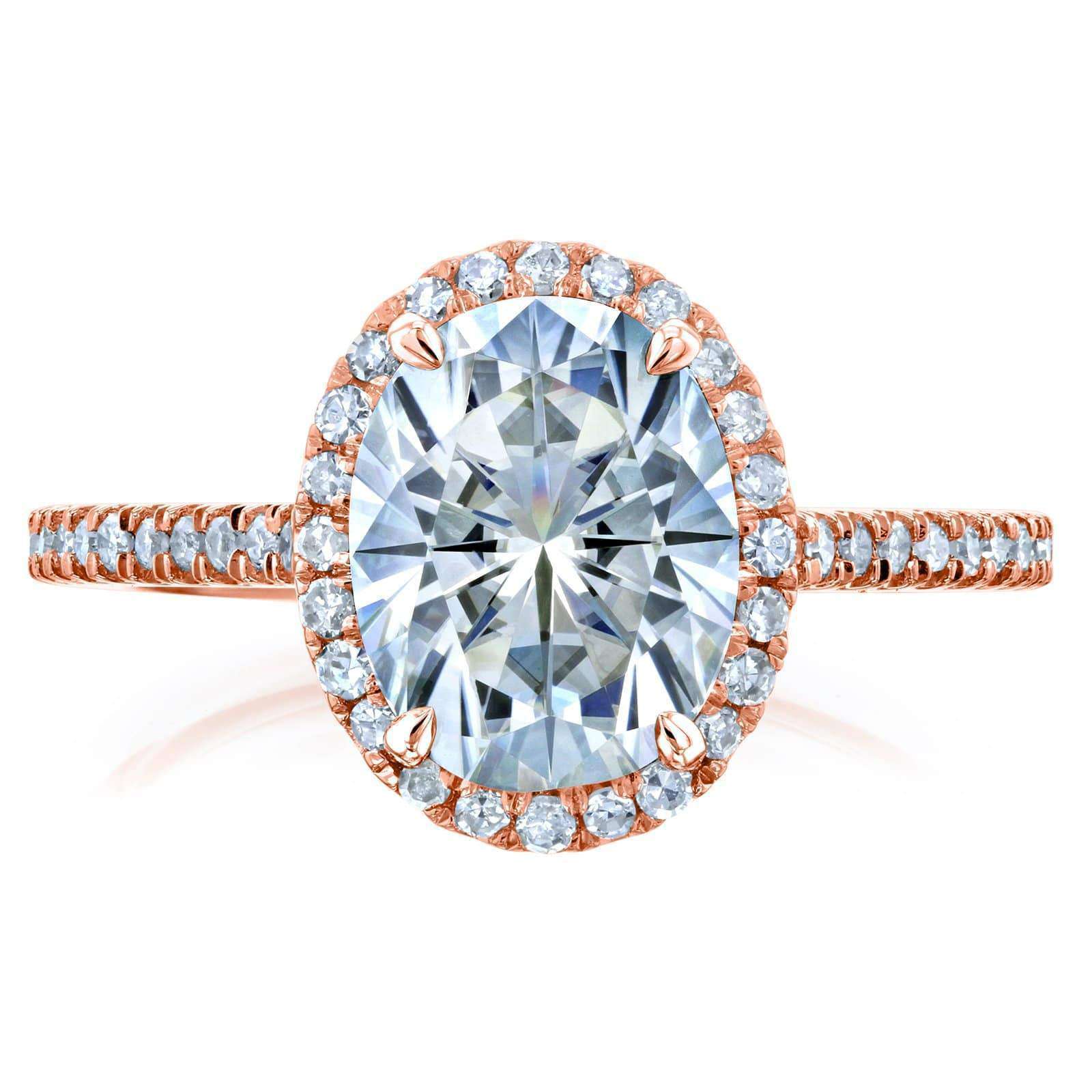 A two carat oval-cut moissanite captures the most brilliant of sparkles over this diamond and gold engagement ring. Decorating this moissanite center stone are entirely natural earth mined diamonds for a perfect mix of contemporary and tradition. The moissanite showcases pristine clarity whereas the diamonds showcase shimmering luxury. The ring is made with 14-karat rose gold and is finished with a beautiful high polish.