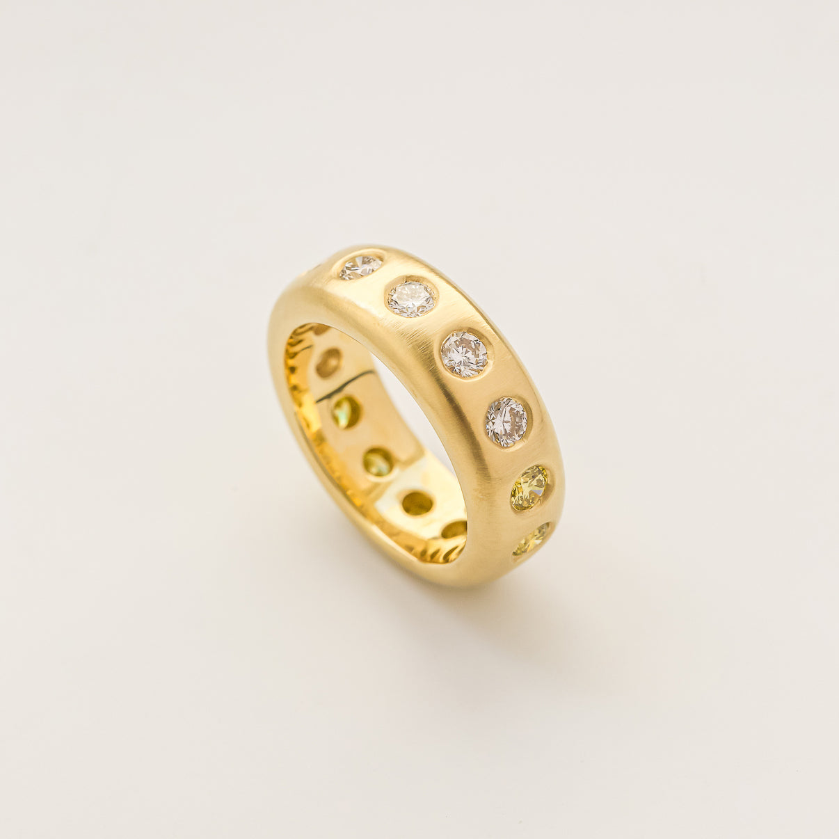 For the trendsetters, consider a half lemon diamond, half white diamond combo across an 18k yellow gold band.