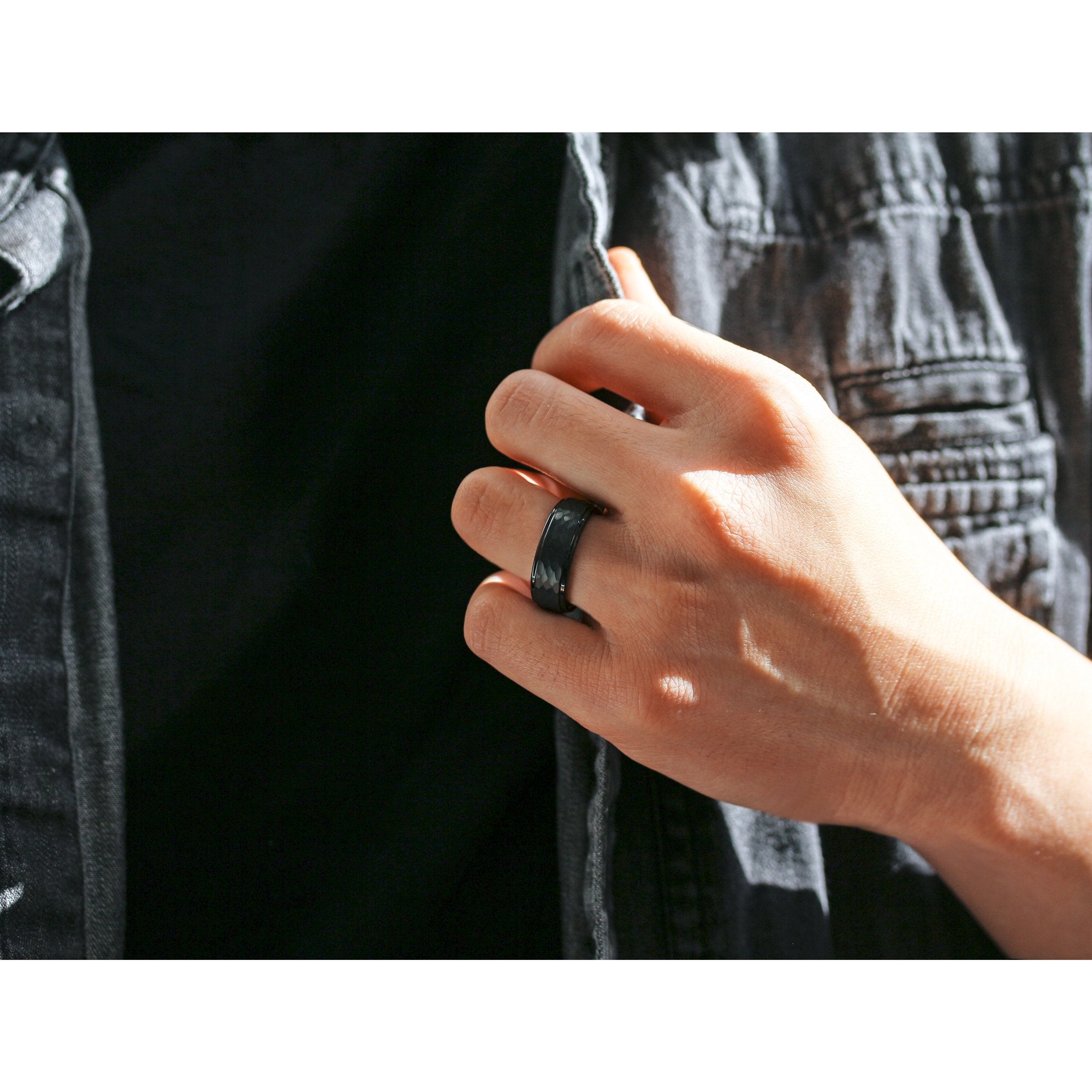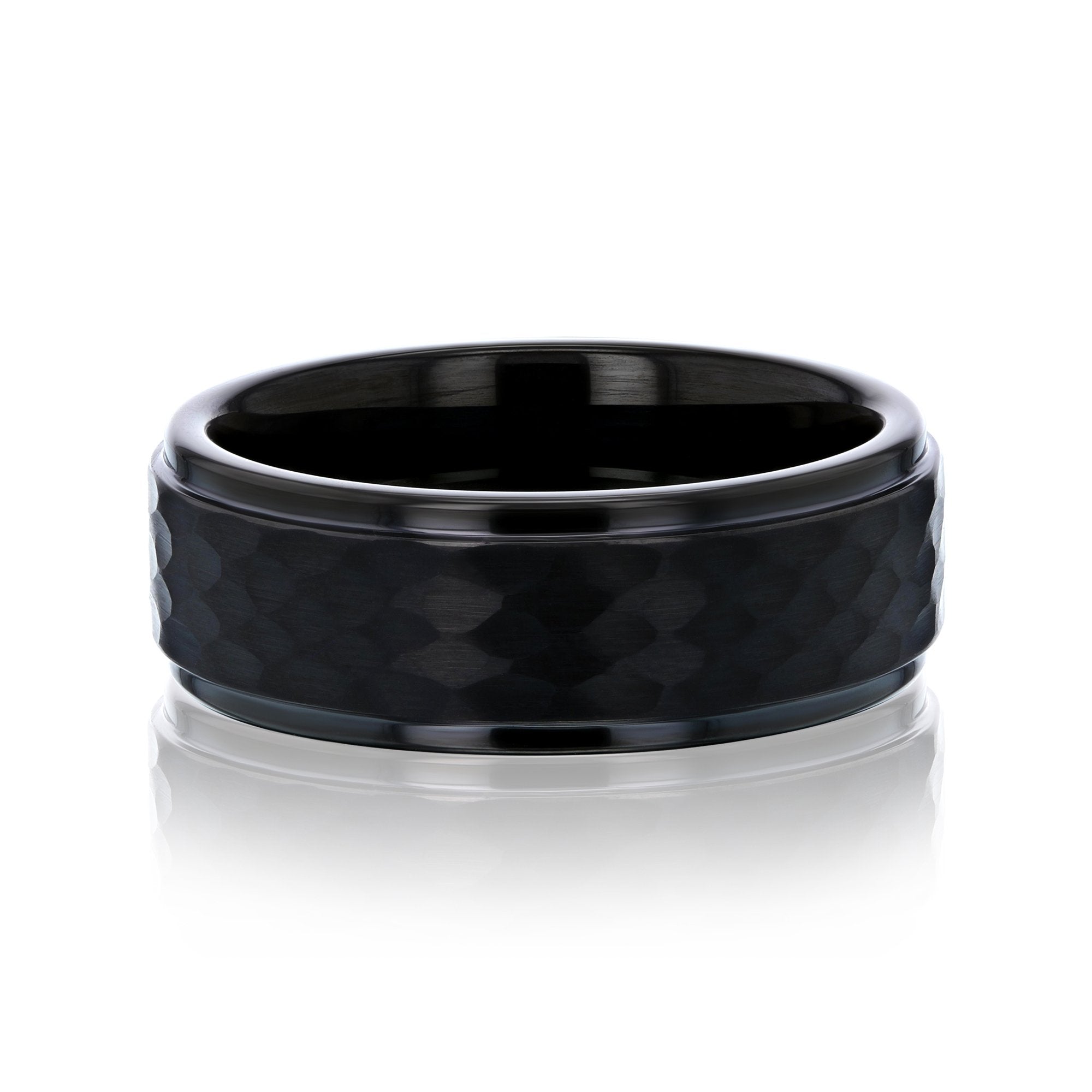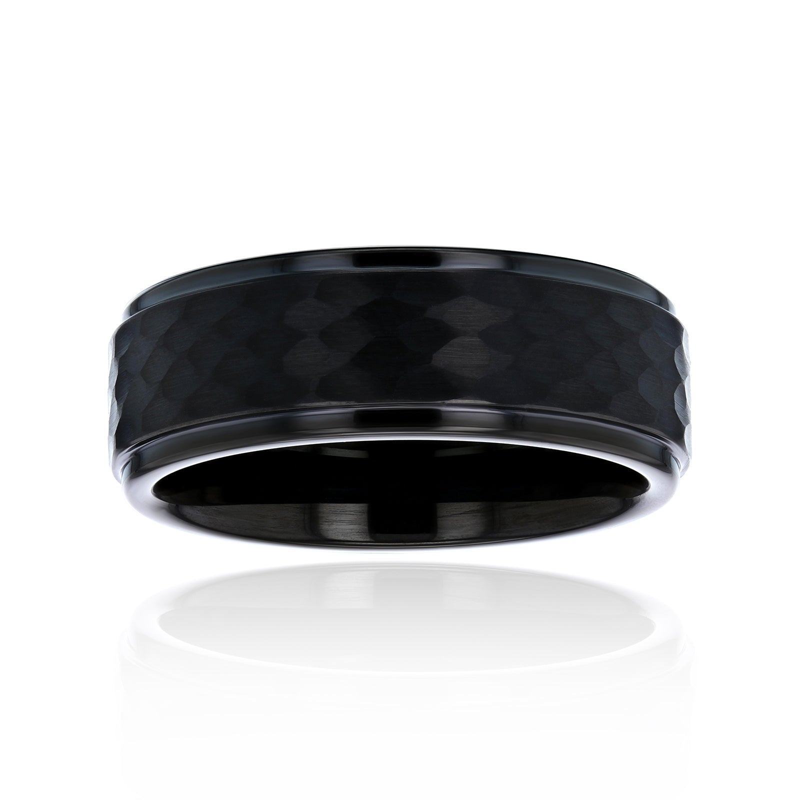 This 8mm band features a black ion-plated, hammered center with stepped edge design. This scratch resistant ring is highly durable and made to last a lifetime.