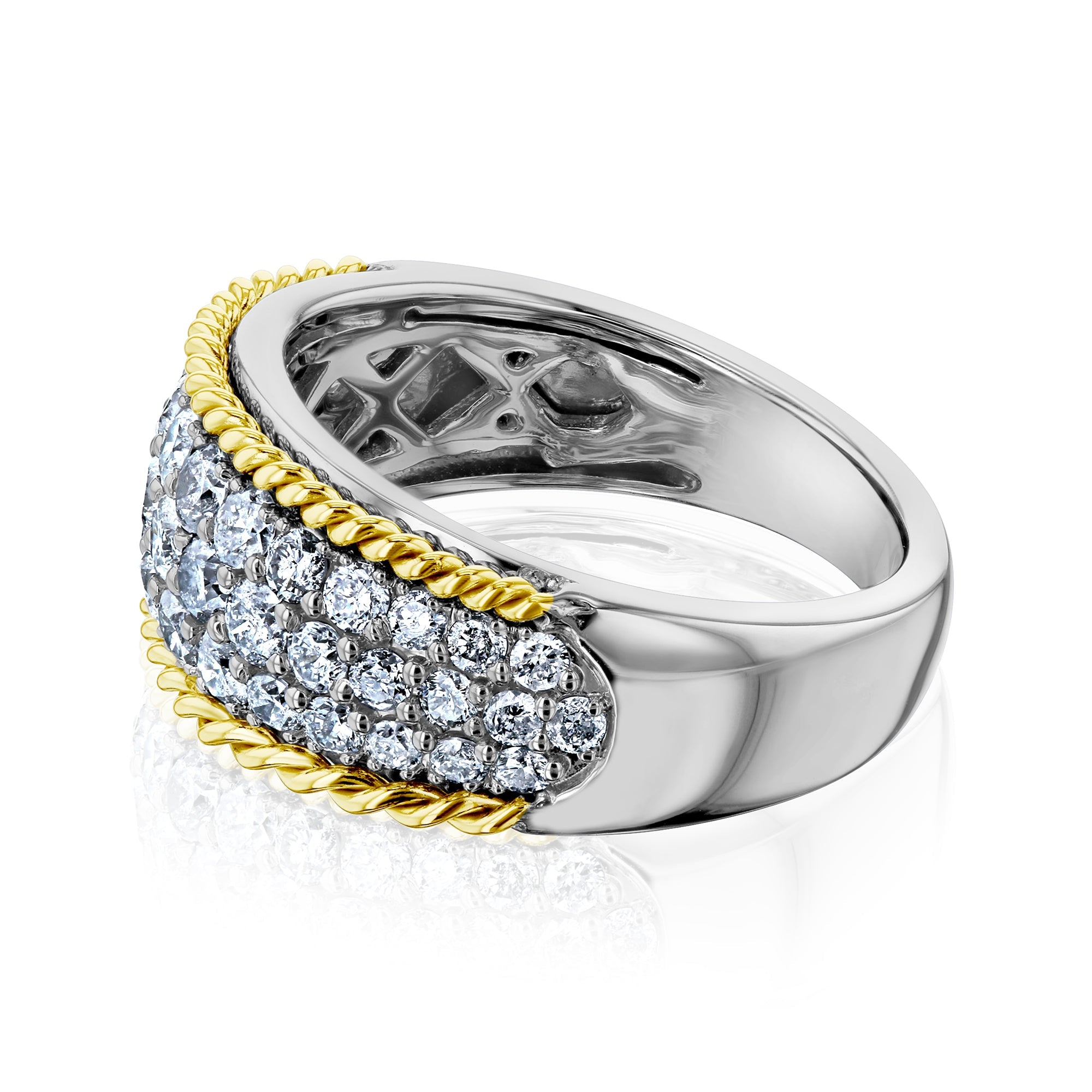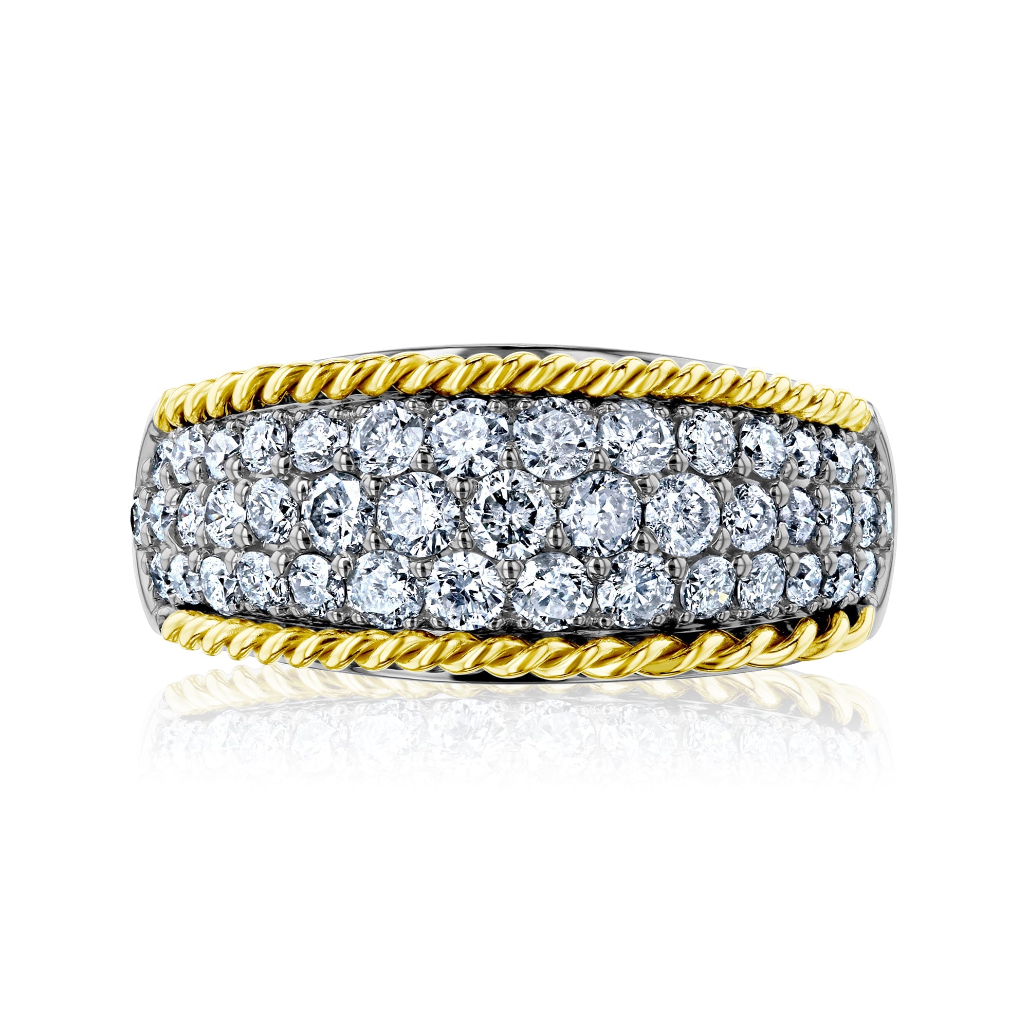 Dozens of genuine Earth-mined diamonds coat this gold ring in an illuminating honeycomb pavé setting. Sandwiched by two twists of yellow gold, the beautiful setting is complete with a frame of stunning artistry.