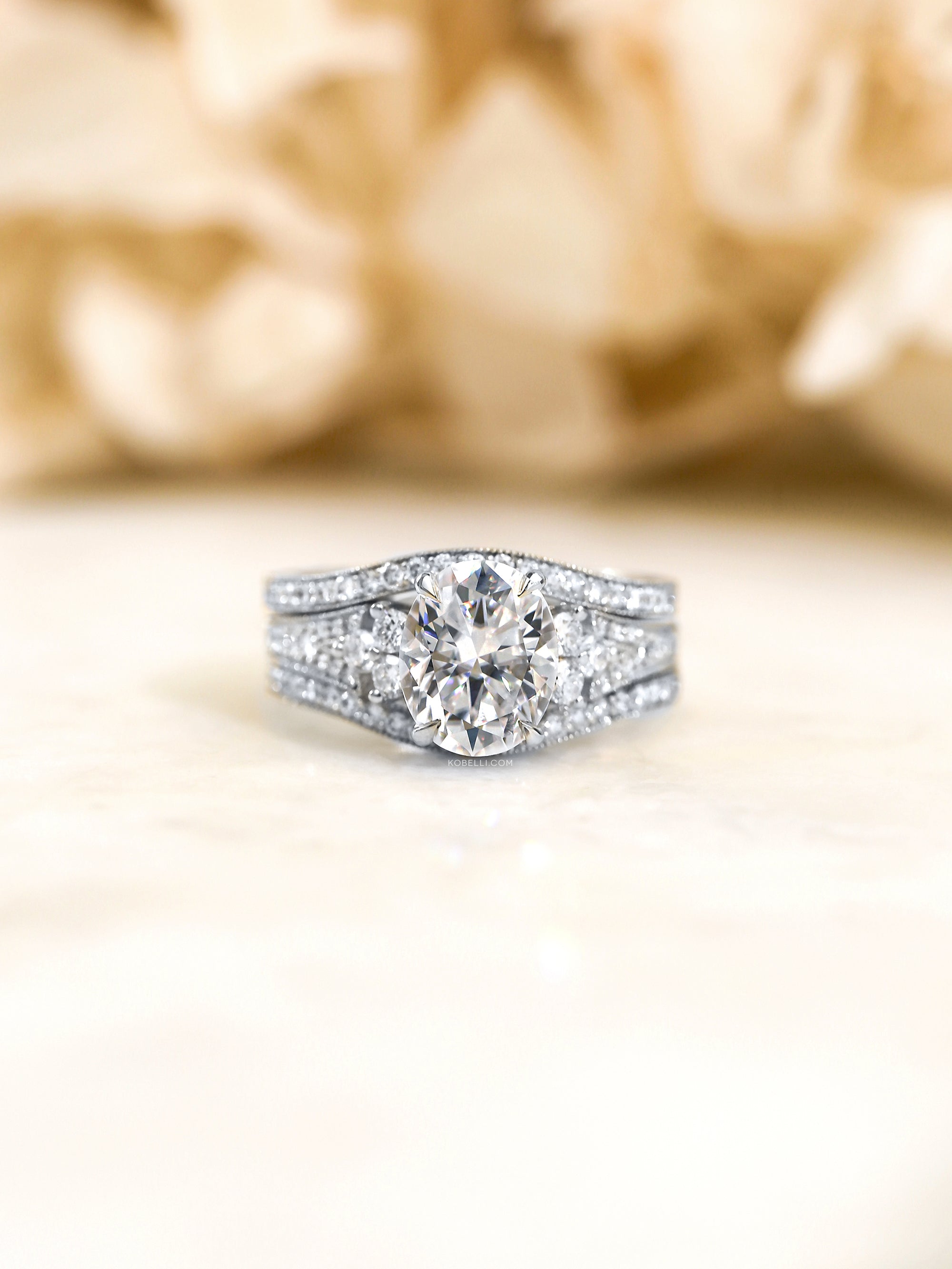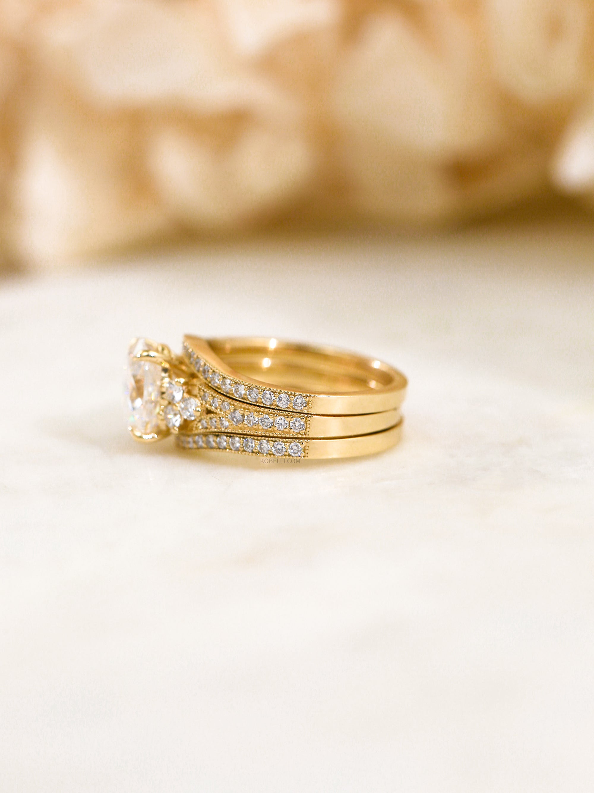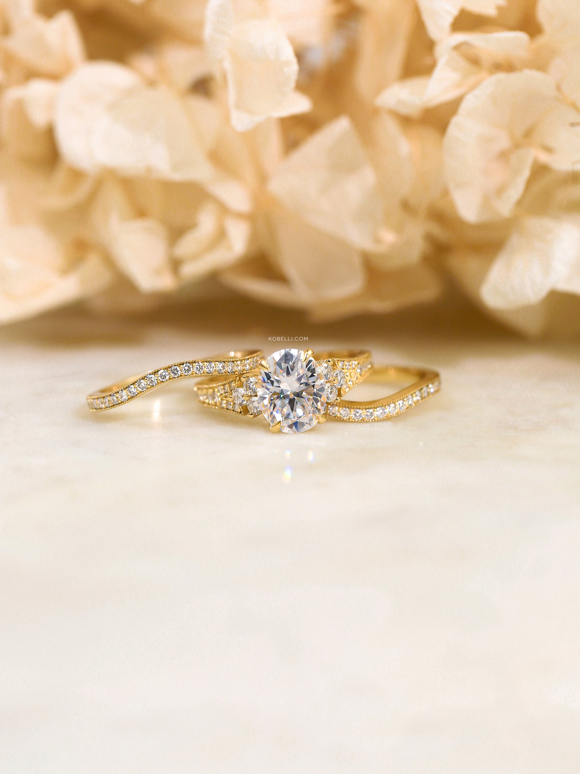 Accompanying this breathtaking engagement ring are two curved wedding bands, stacking on both sides into a perfect frame.