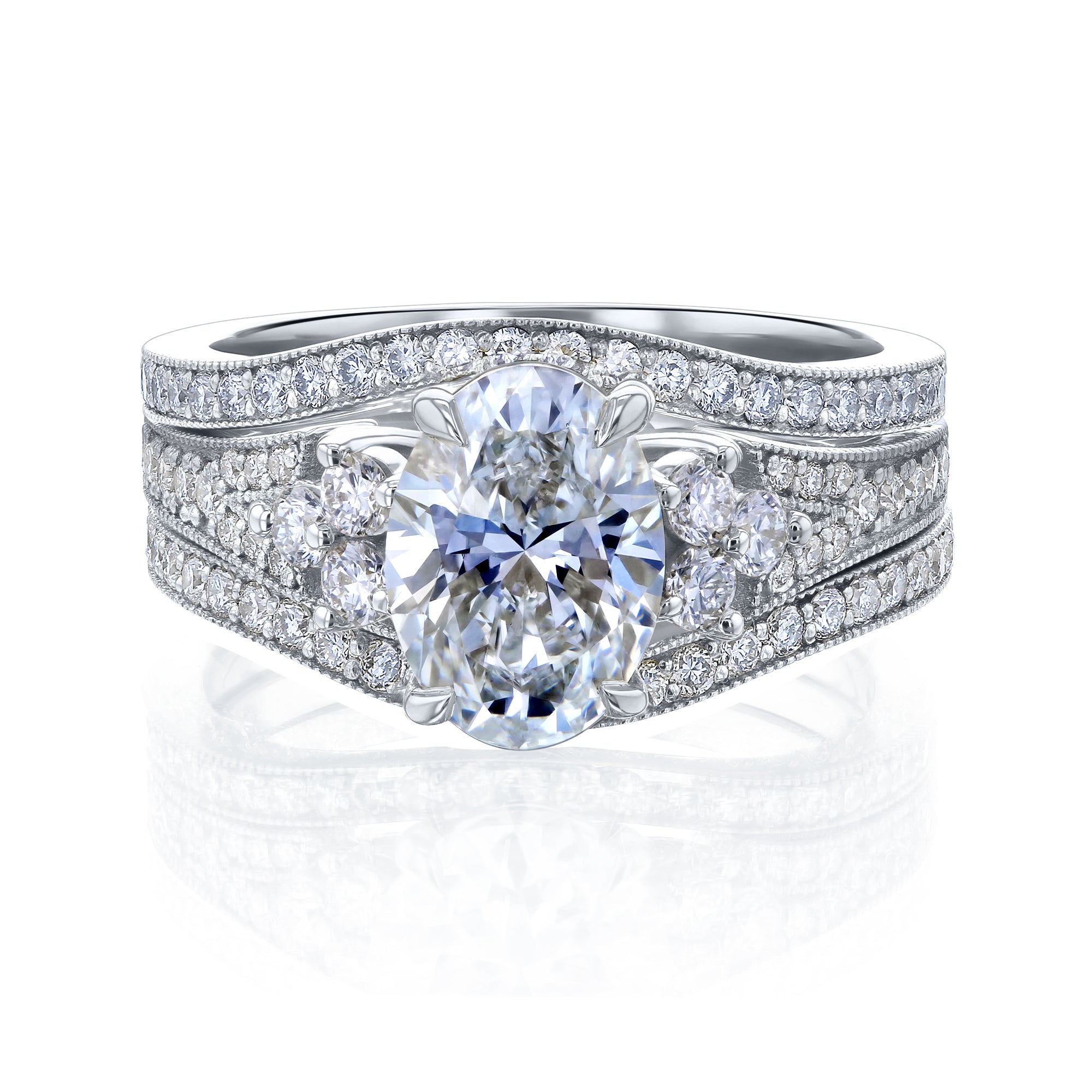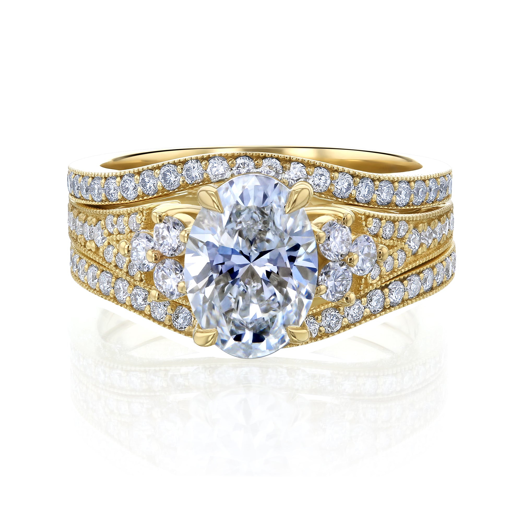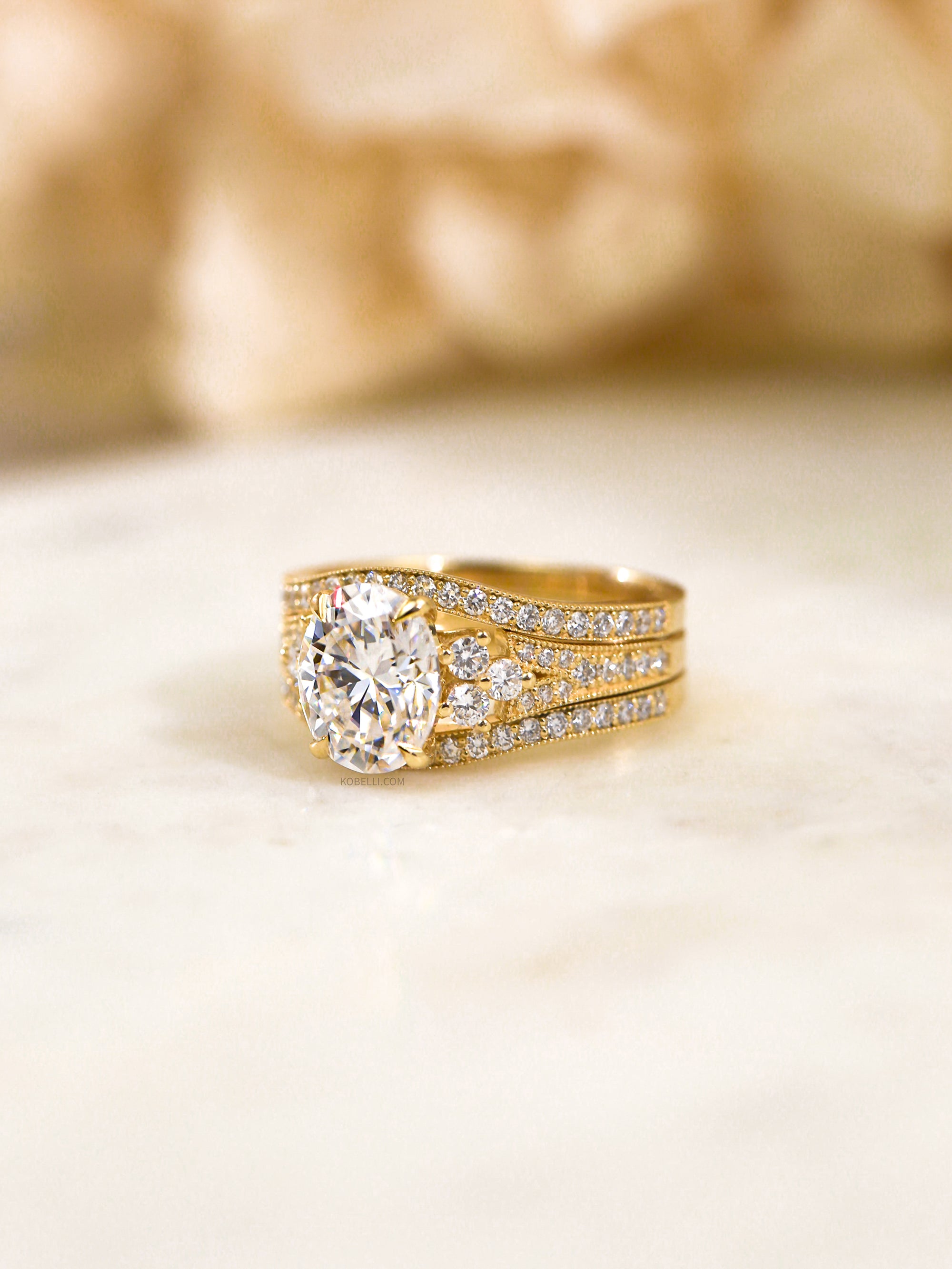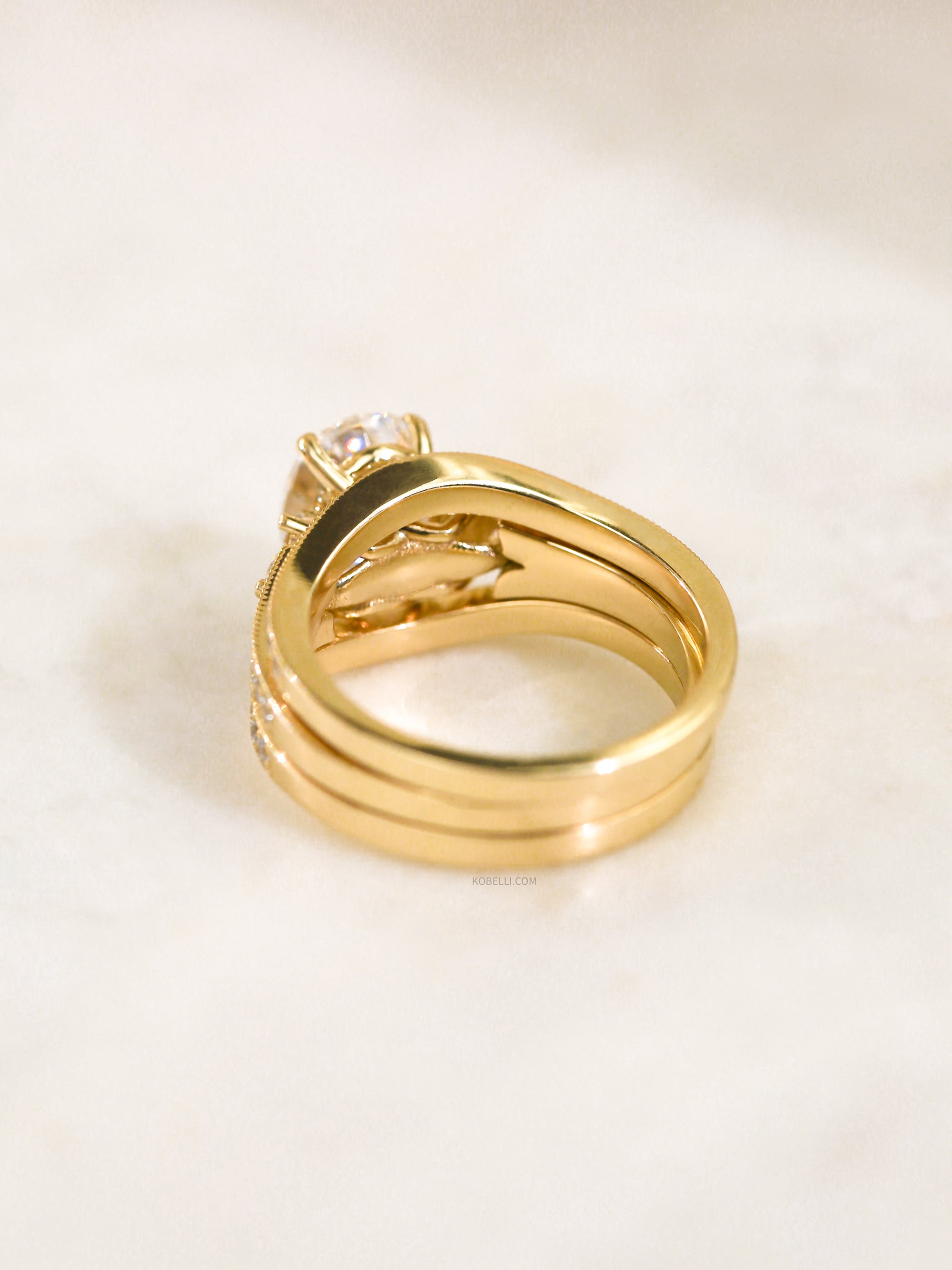 Accompanying this breathtaking engagement ring are two curved wedding bands, stacking on both sides into a perfect frame.