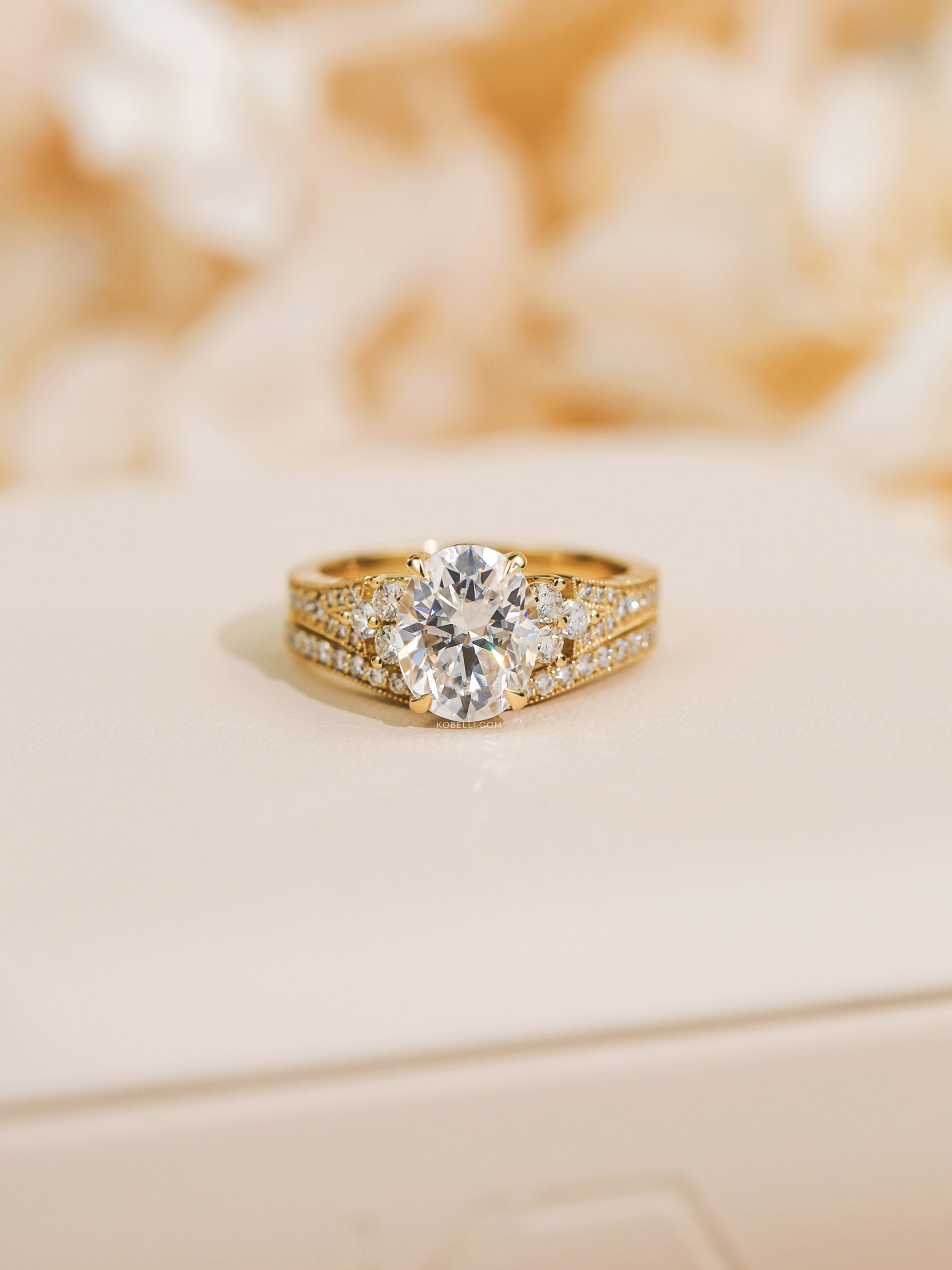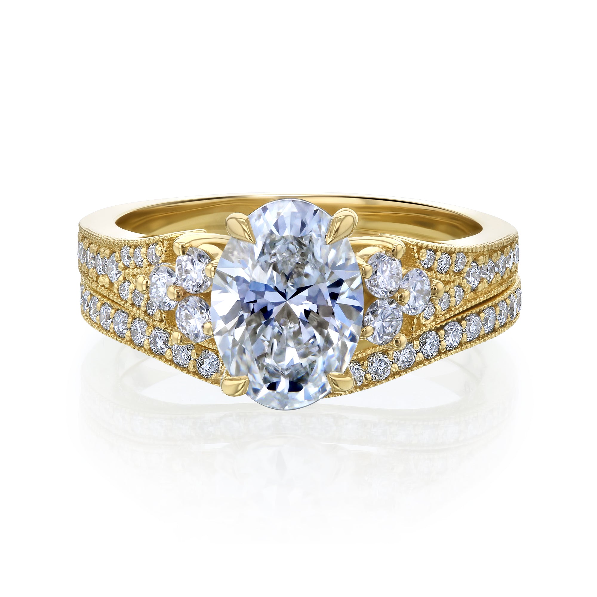 A collective of brilliant-cut white diamonds are carefully placed across this solid 14-karat gold canvas. The center features an elongated oval-cut diamond with a tapering trail of accent diamonds beside it leading into a split shank band.
