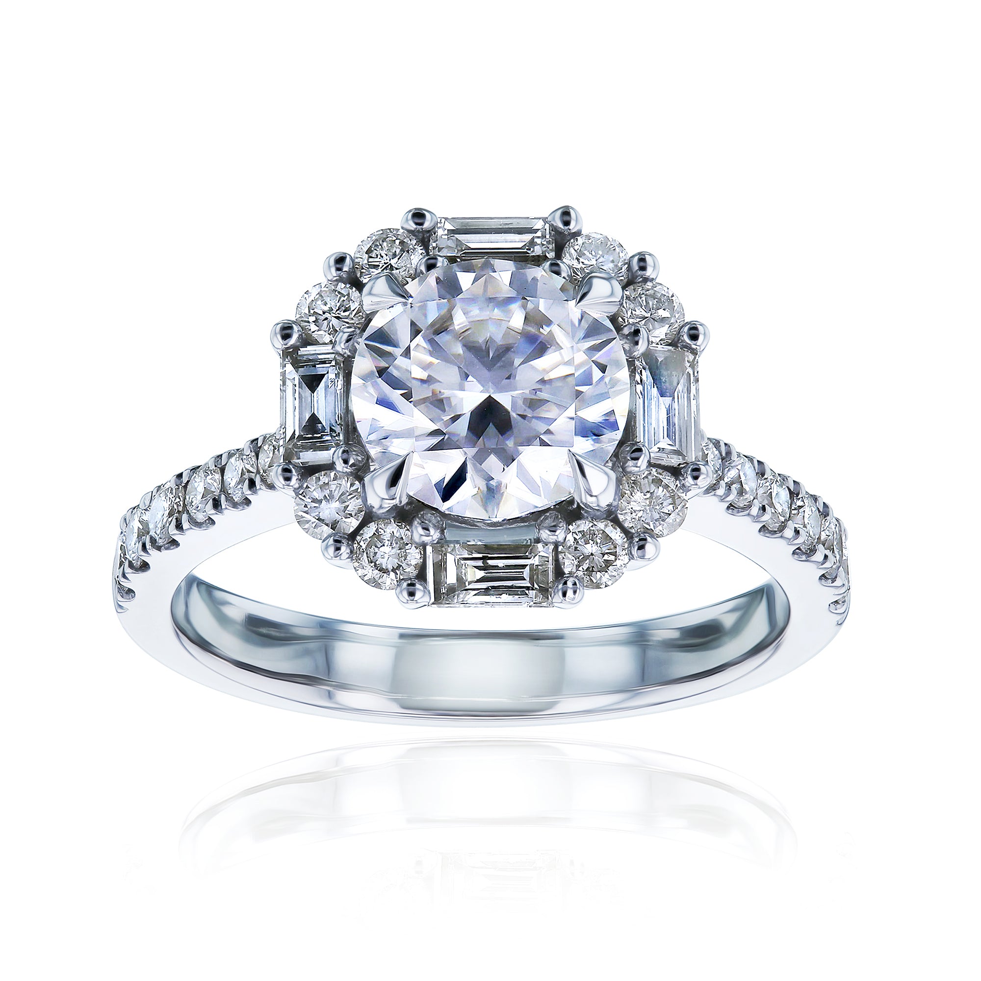 An impressive 1.50 carat moissanite gemstone centers this beautiful diamond mounting in 14-karat white gold. Baguette and round diamonds create an octagonal pattern around the halo while smaller round diamonds line the band, halfway down ring.