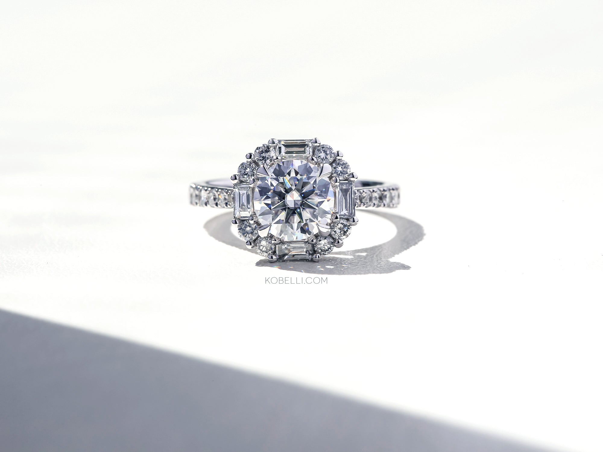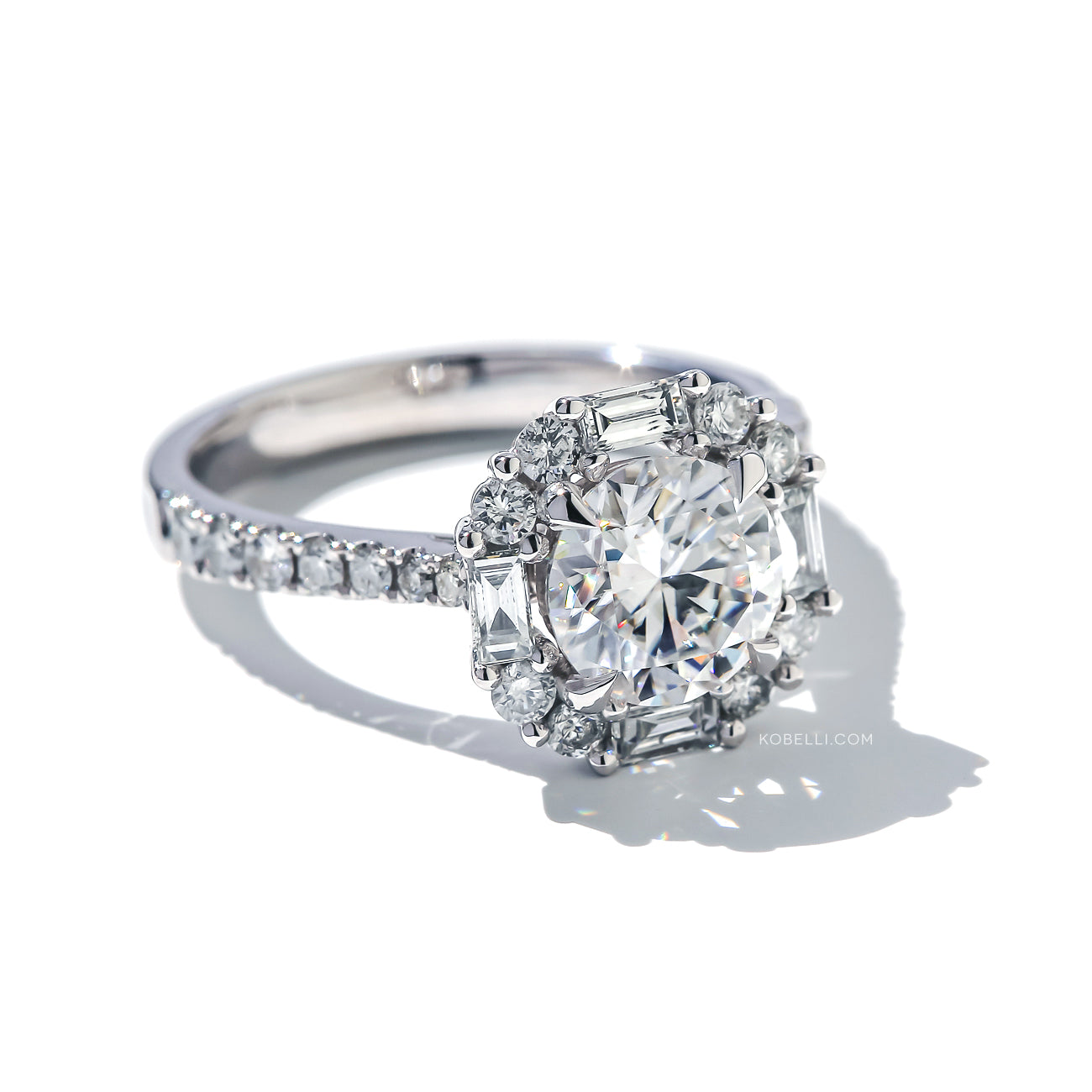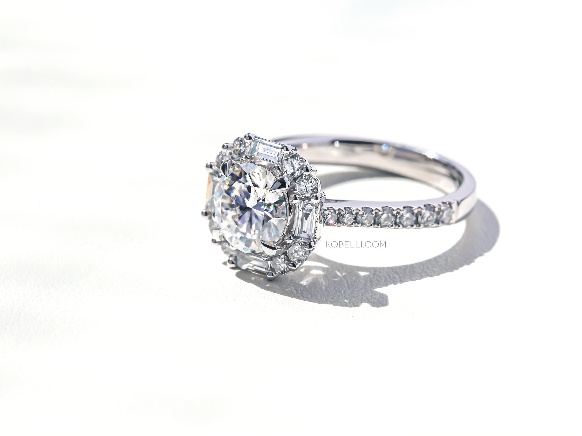 • 7.5 mm Kobelli Moissanite Center Stone (1.50 Carats DEW, GH/VS)