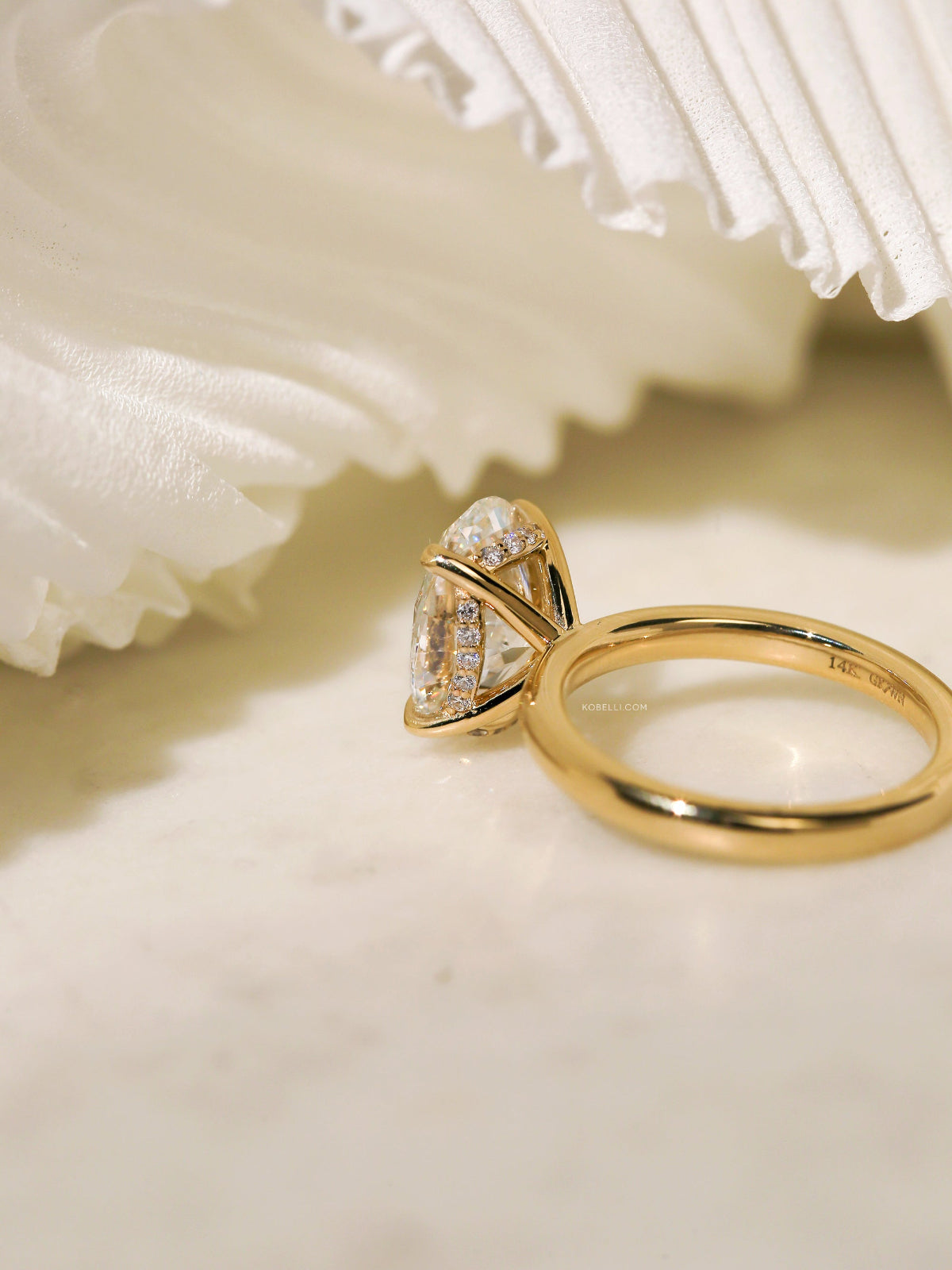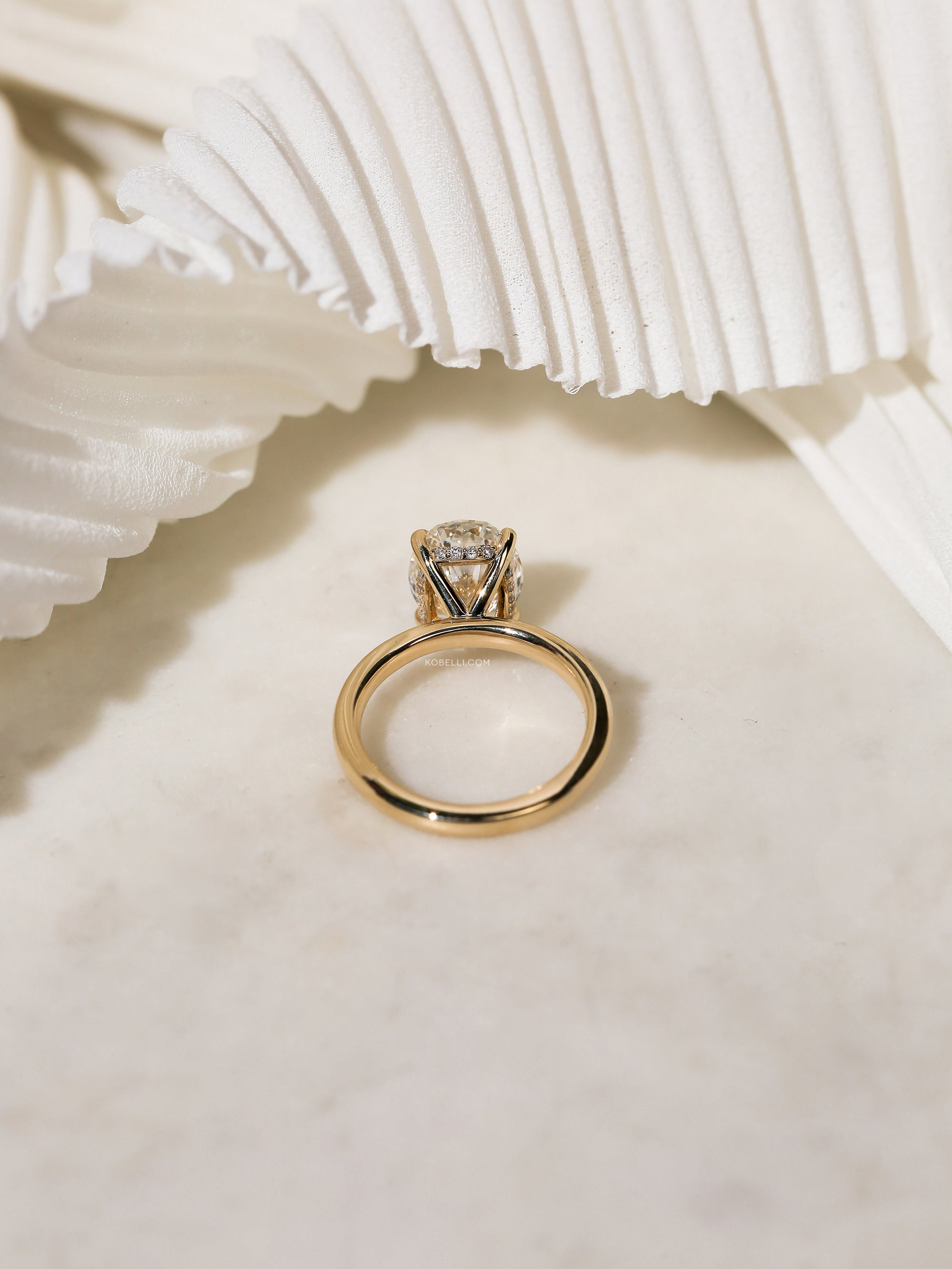The Jovie Ring features a large oval brilliant-cut diamond center over a drape halo in a floating ring setting. The "floating" feature is carried over a solid plain gold or platinum band with a rounded comfort fit sleeve for all-day wear.
