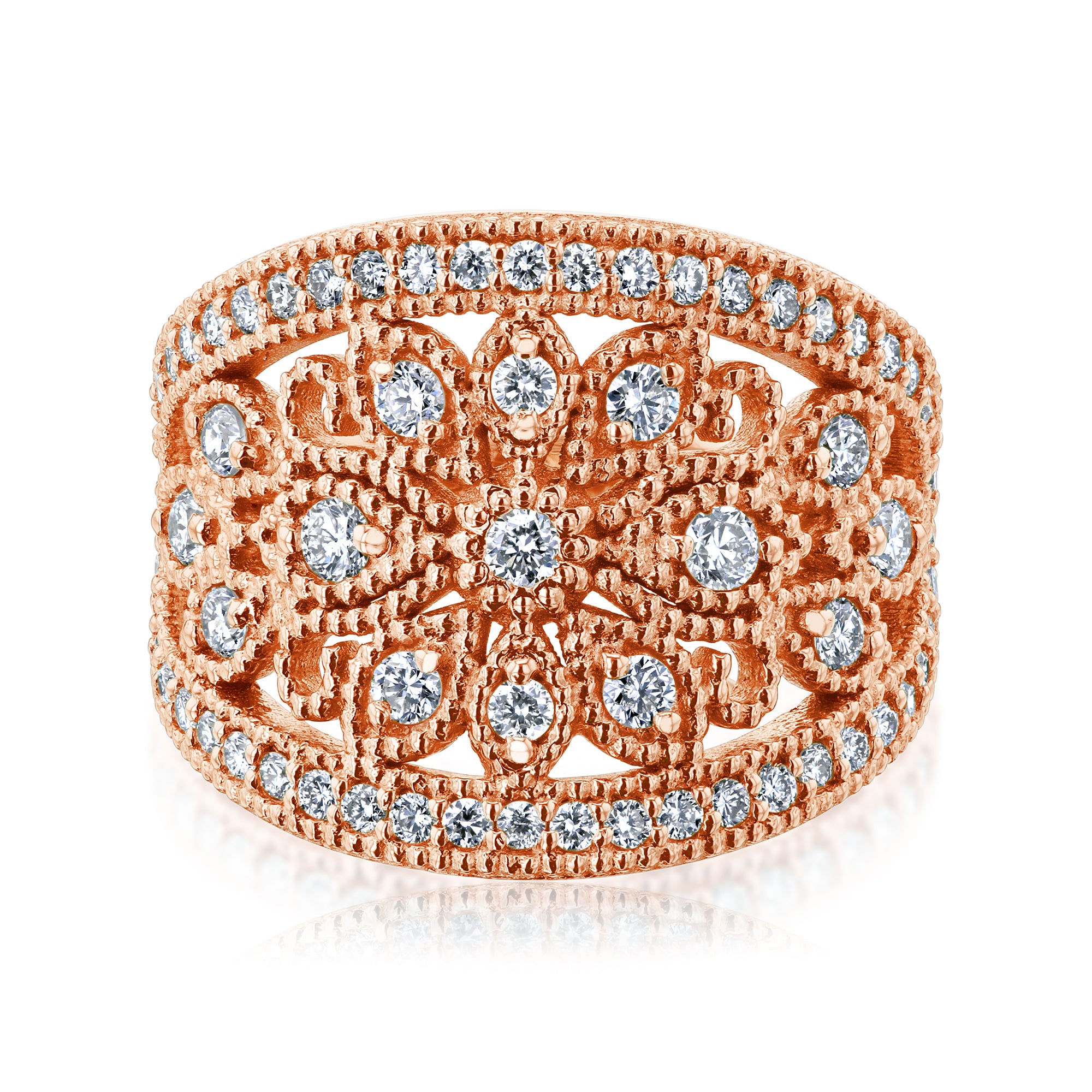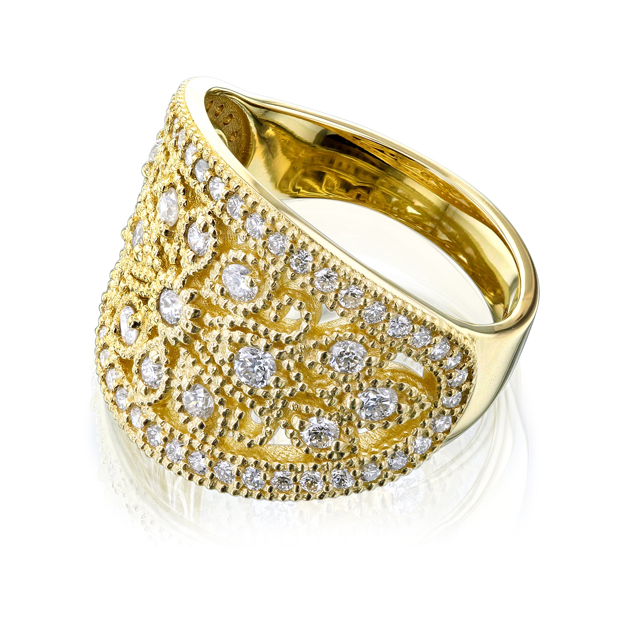 Solid 14 karat gold and lab grown diamonds arranged in a stunning floral motif are exquisitely set in this gorgeous fashion ring. Outlined with gold beaded milgrain edges, this masterpiece is a display of art to be worn as a statement piece. Pair it with your office attire to brighten the outfit or with a formal gown to stand out from the crowd.