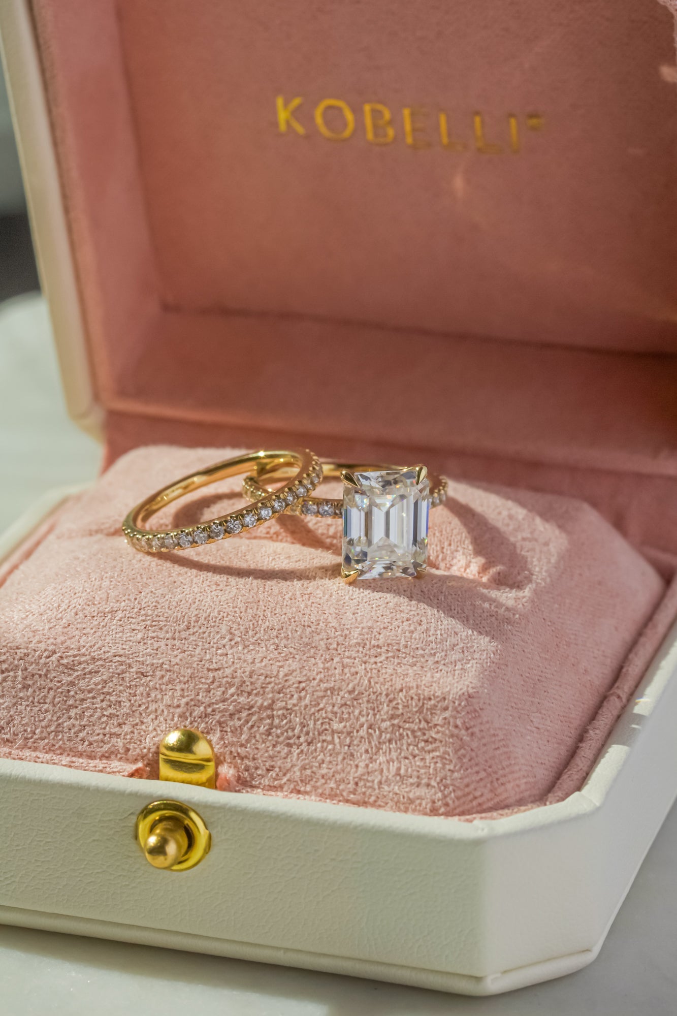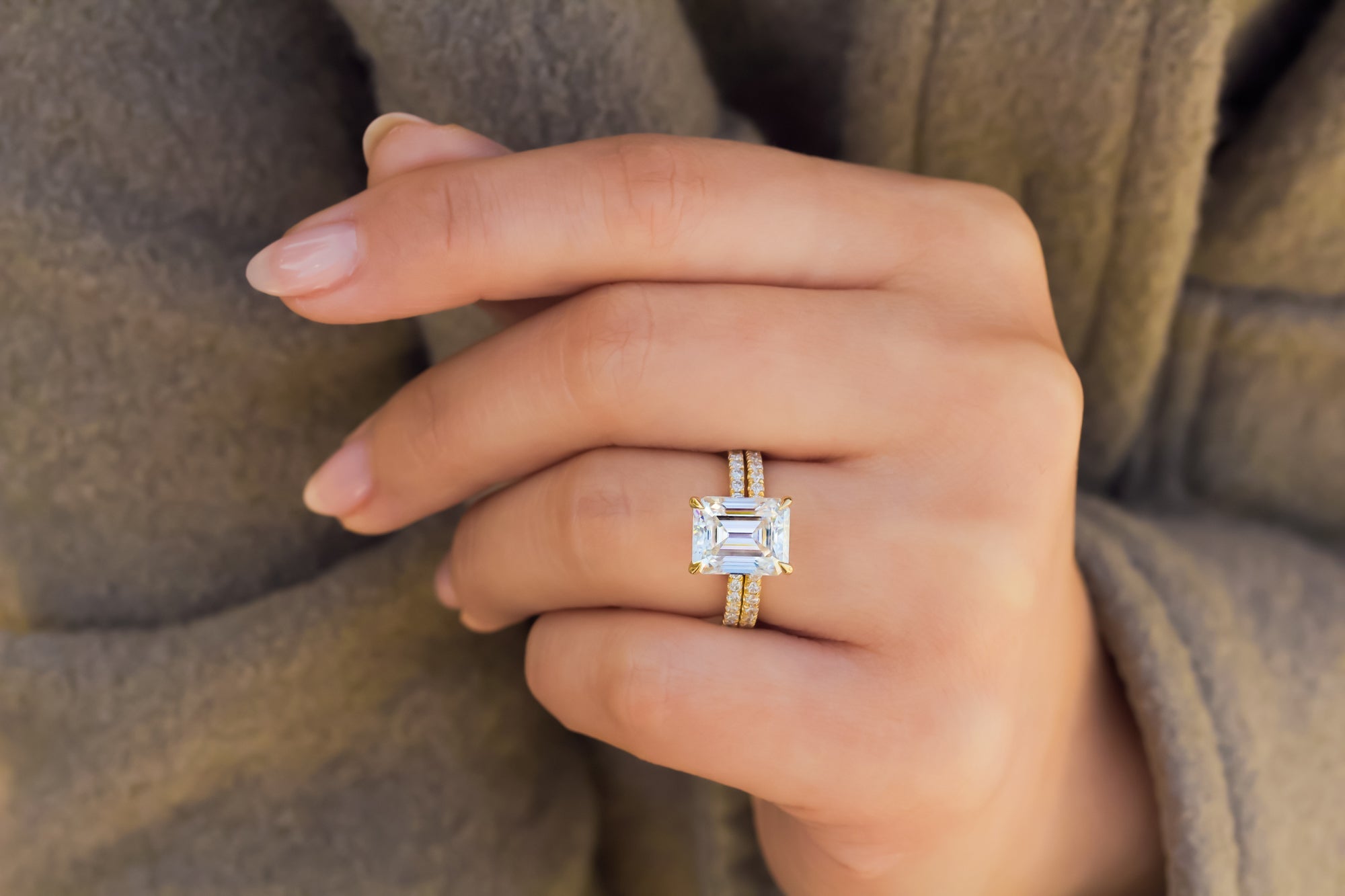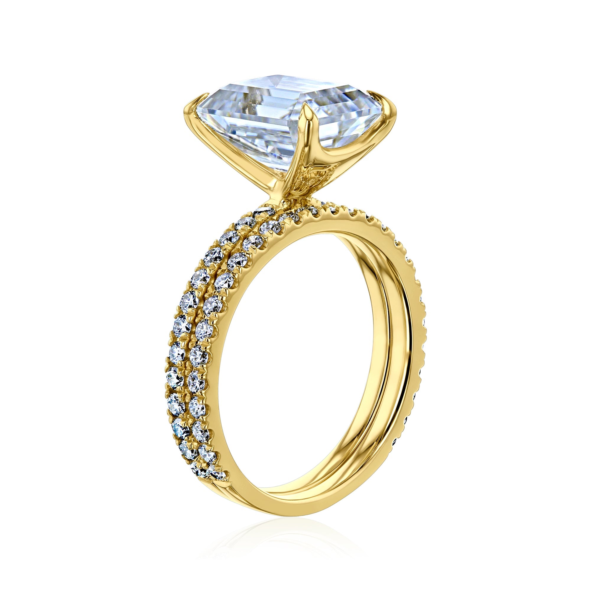 A large 10x8 mm emerald-cut moissanite is set in a clean and sleek butterfly silhouette setting sitting atop of a shimmering pavé of diamonds along the shank, while 28 round lab-grown diamonds are pavé set in this slim matching band crafted in solid 14k gold.