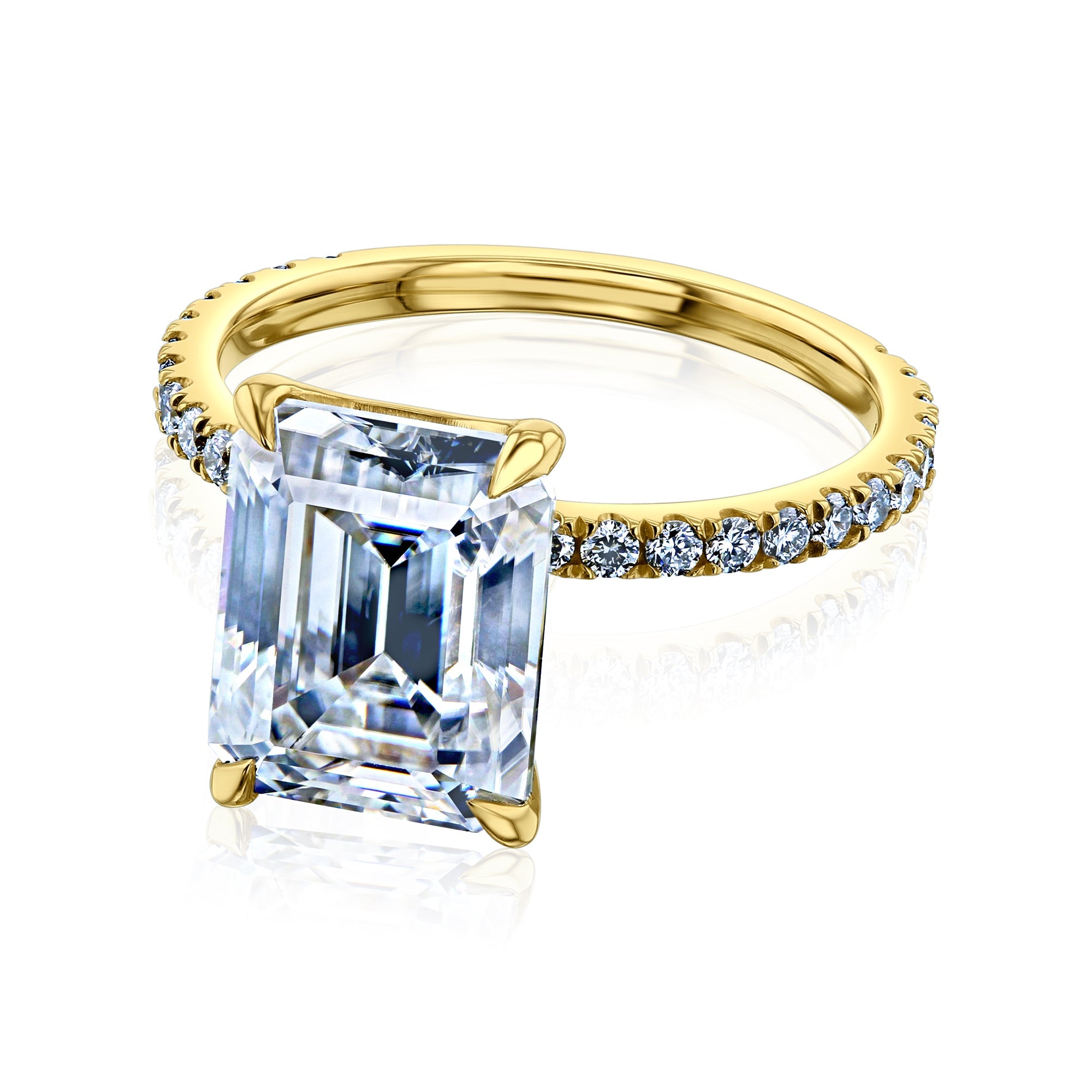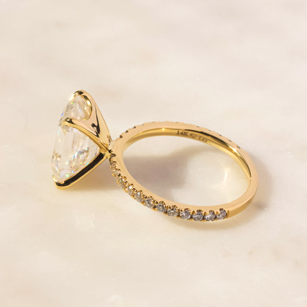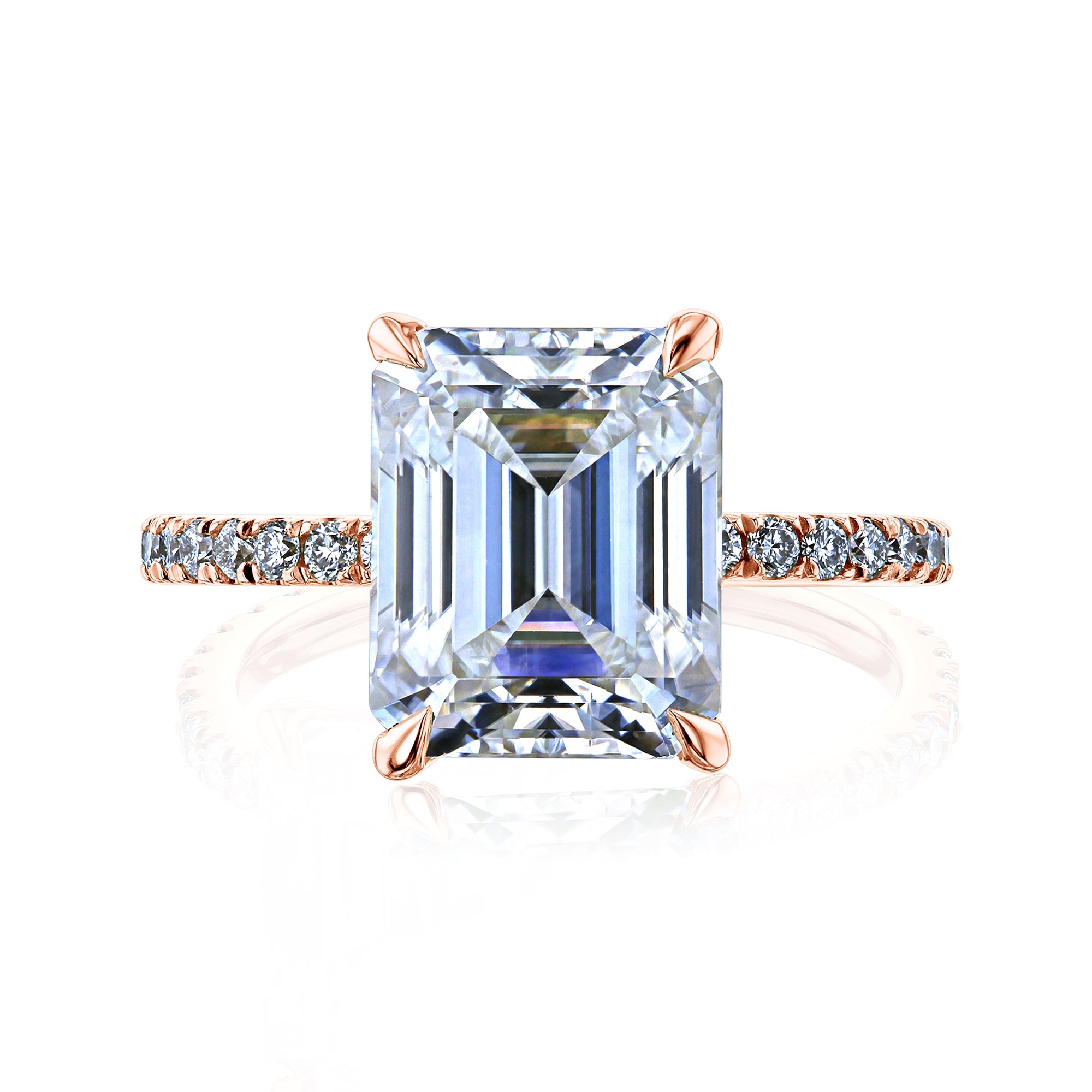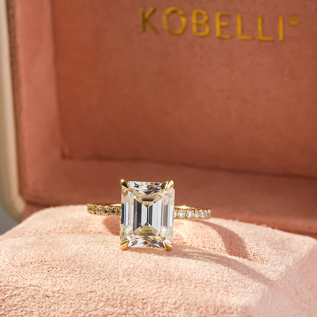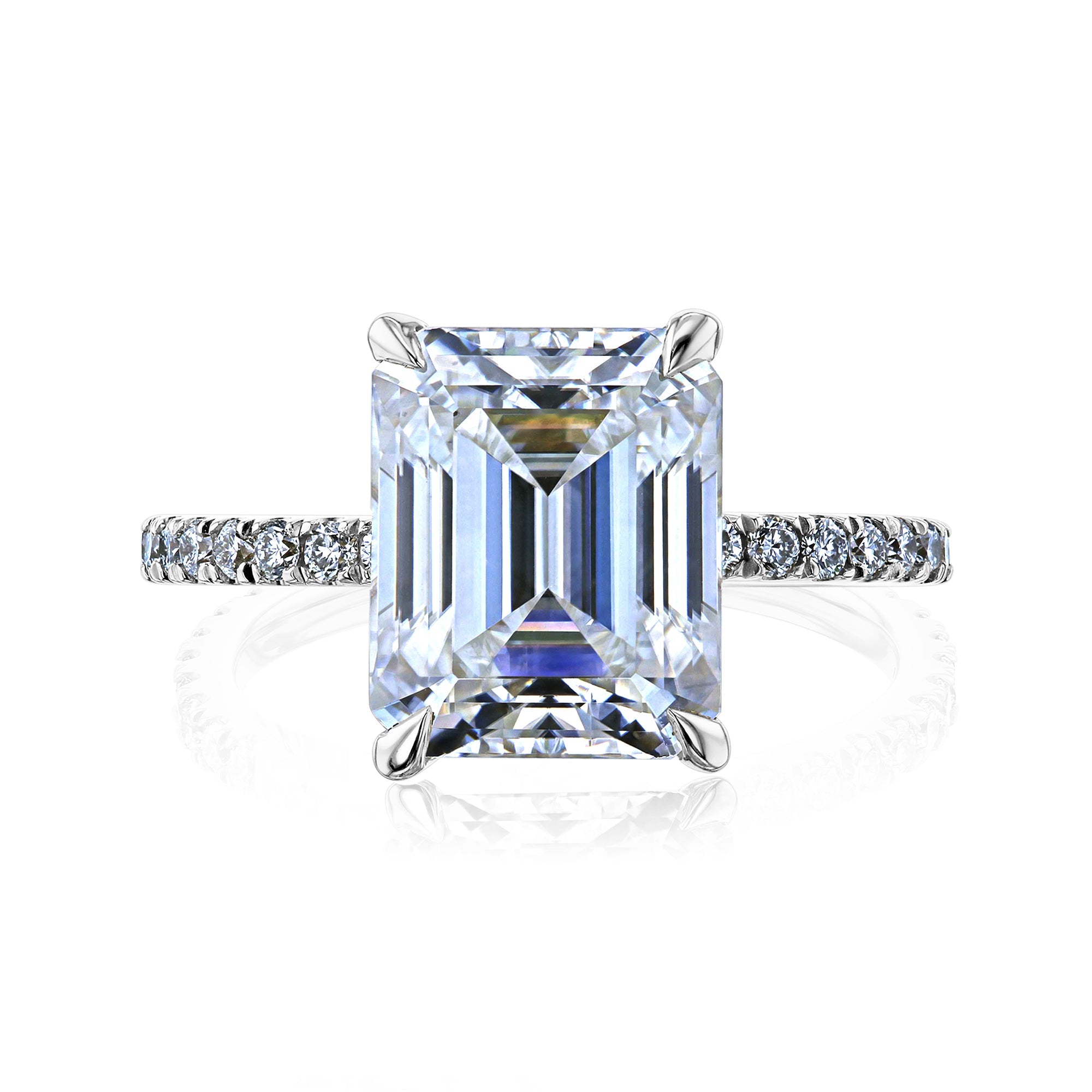 A large 10x8 mm emerald-cut moissanite is set in a clean and sleek butterfly silhouette setting sitting atop of a shimmering pavé of diamonds along the shank.