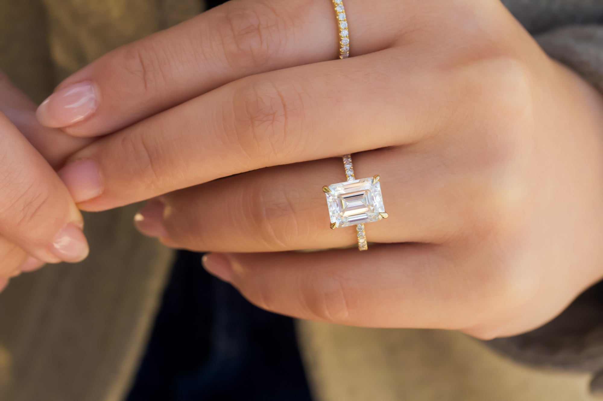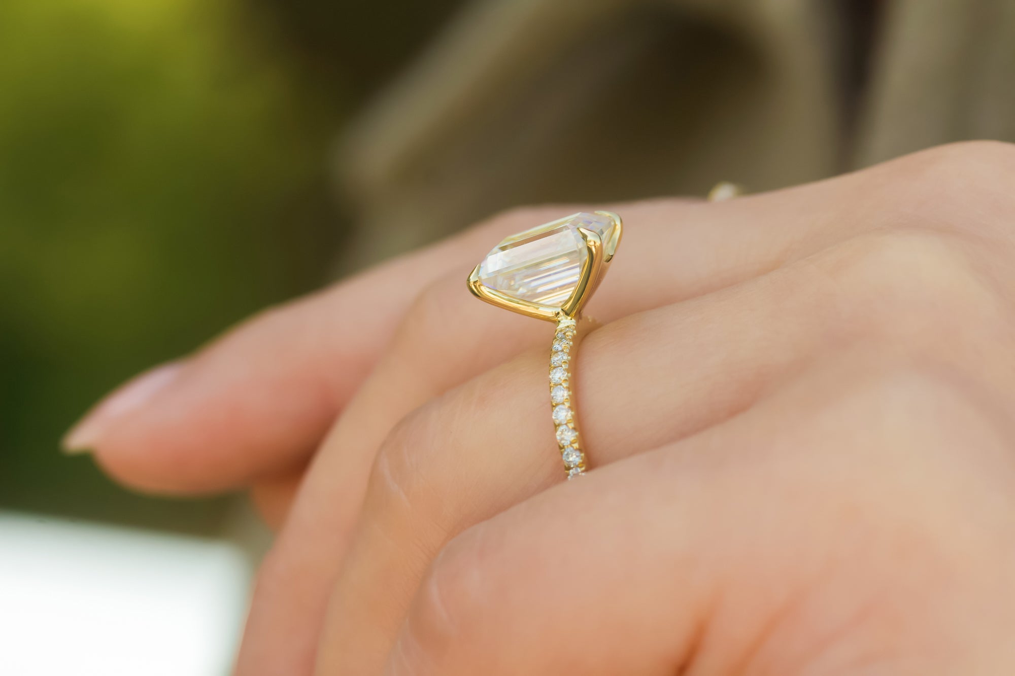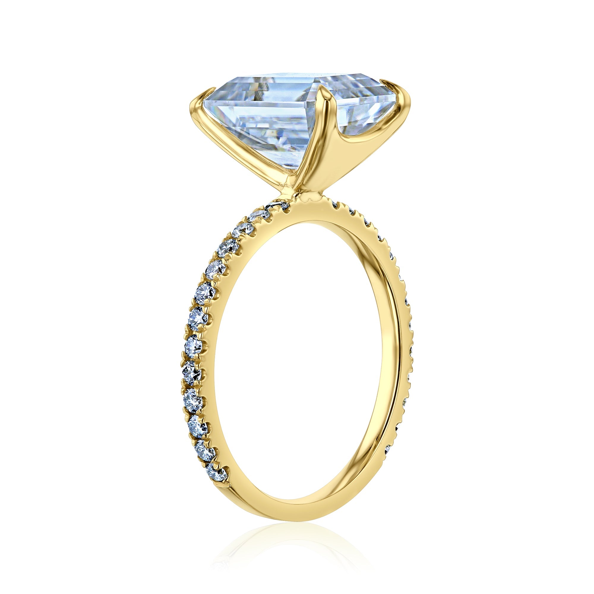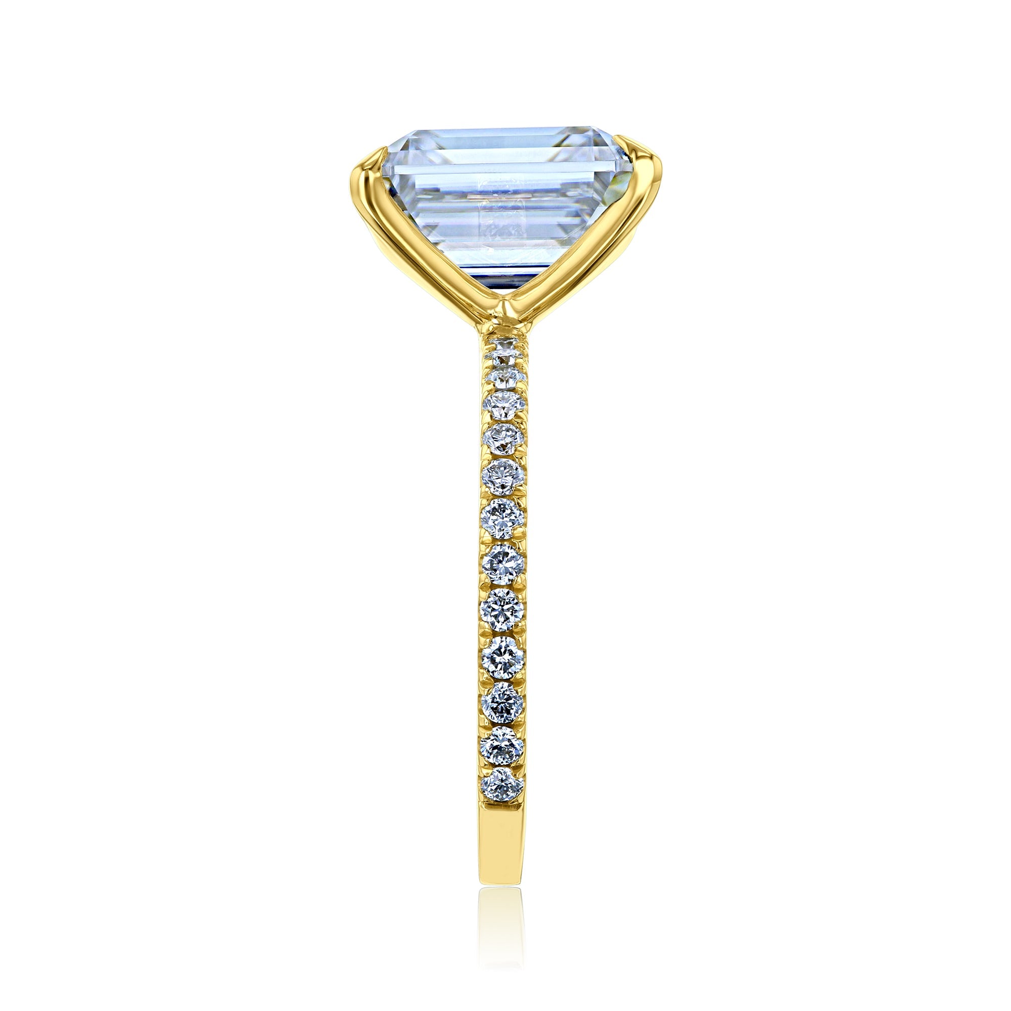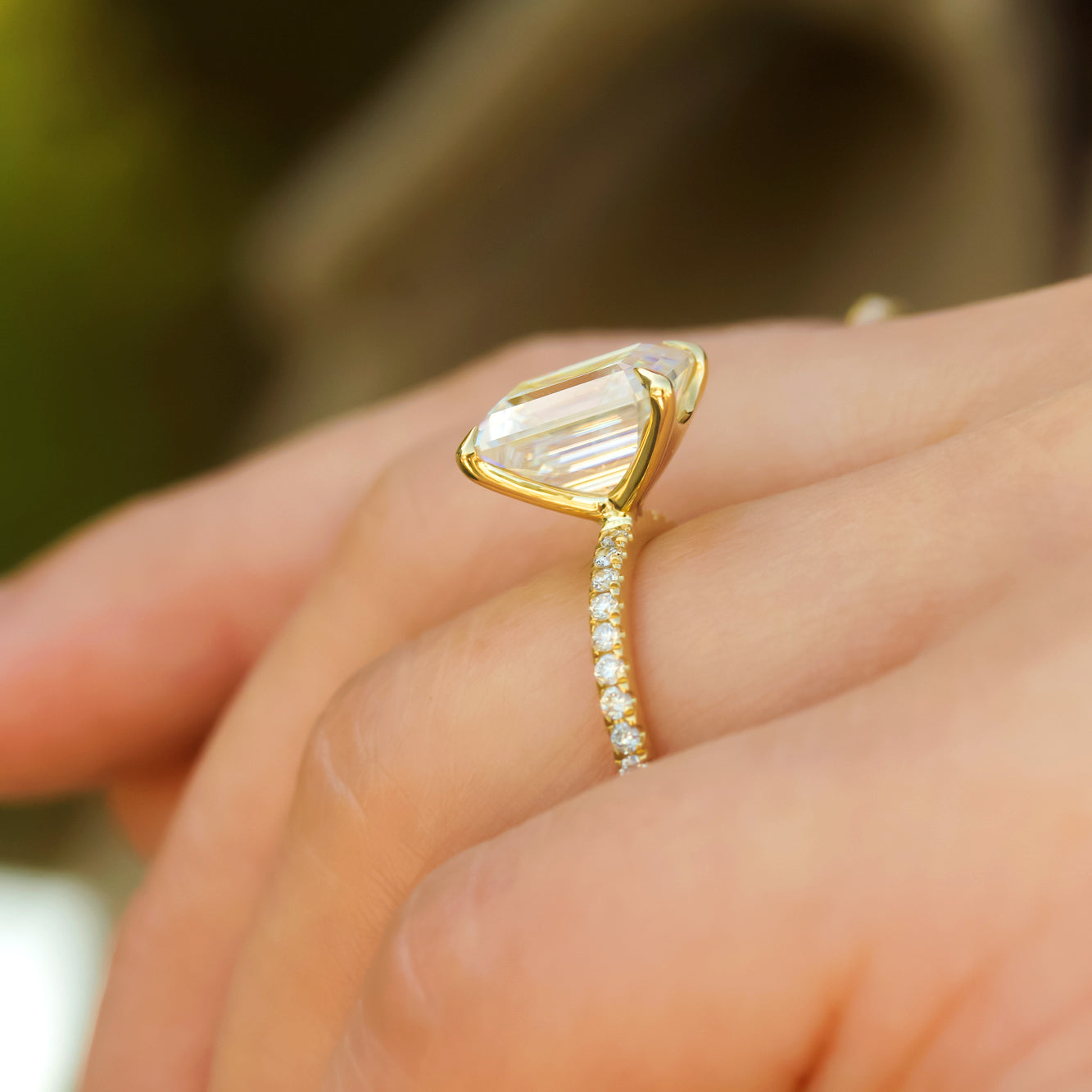 A large 10x8 mm emerald-cut moissanite is set in a clean and sleek butterfly silhouette setting sitting atop of a shimmering pavé of diamonds along the shank.