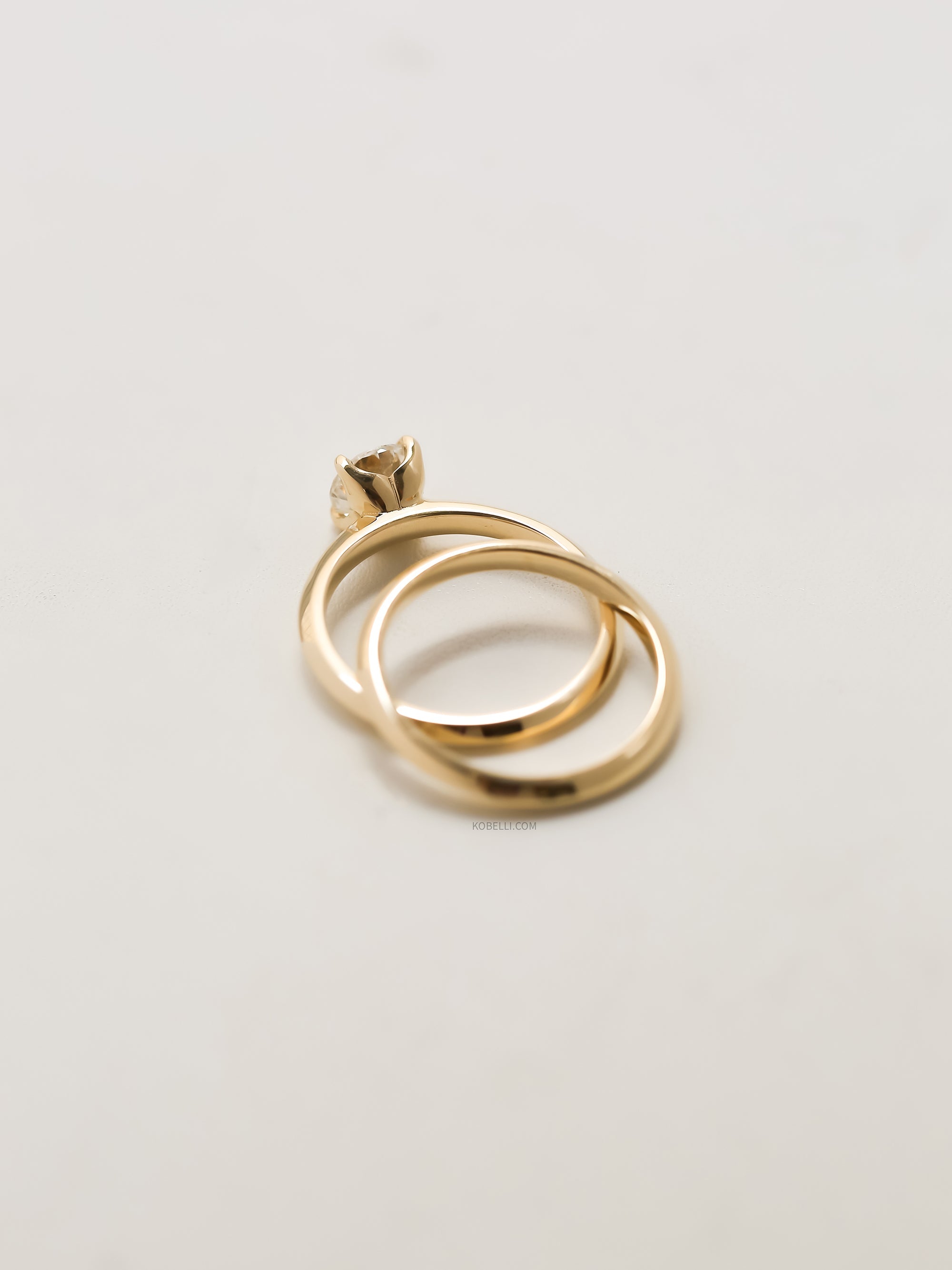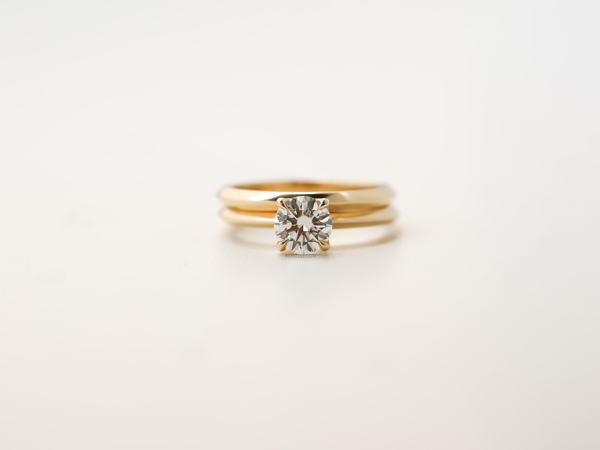Louise designed this ring romancing the idea of a budding flower motif for the prongs. With Kobi's approval, she completed her design with a sleek knife-edged 2mm band in solid 14k gold metal (no crevices or hollowed areas). This durable and feminine design features a single round-brilliant center diamond, available exclusively in lab-grown diamonds, and found only on Kobelli.com.