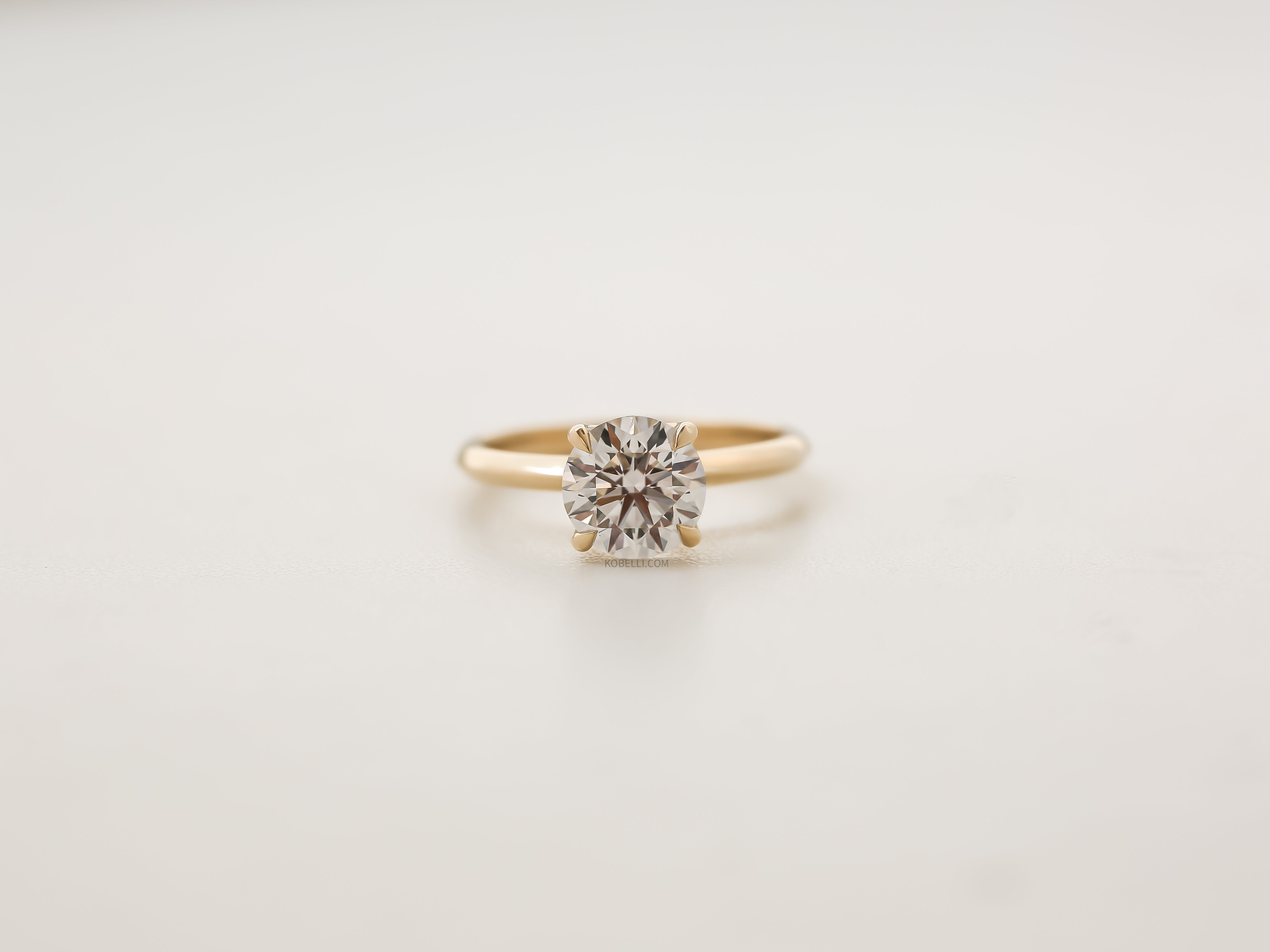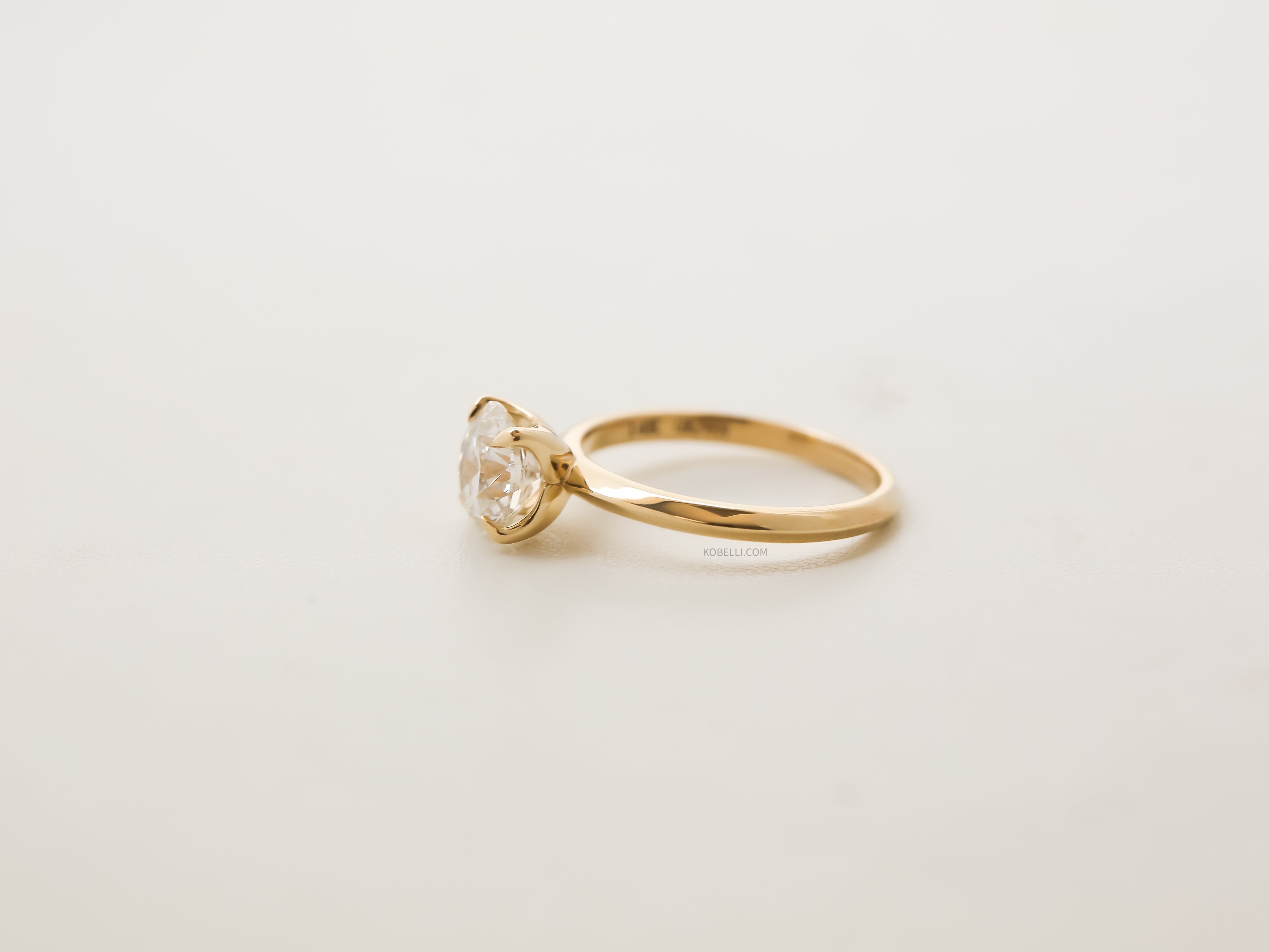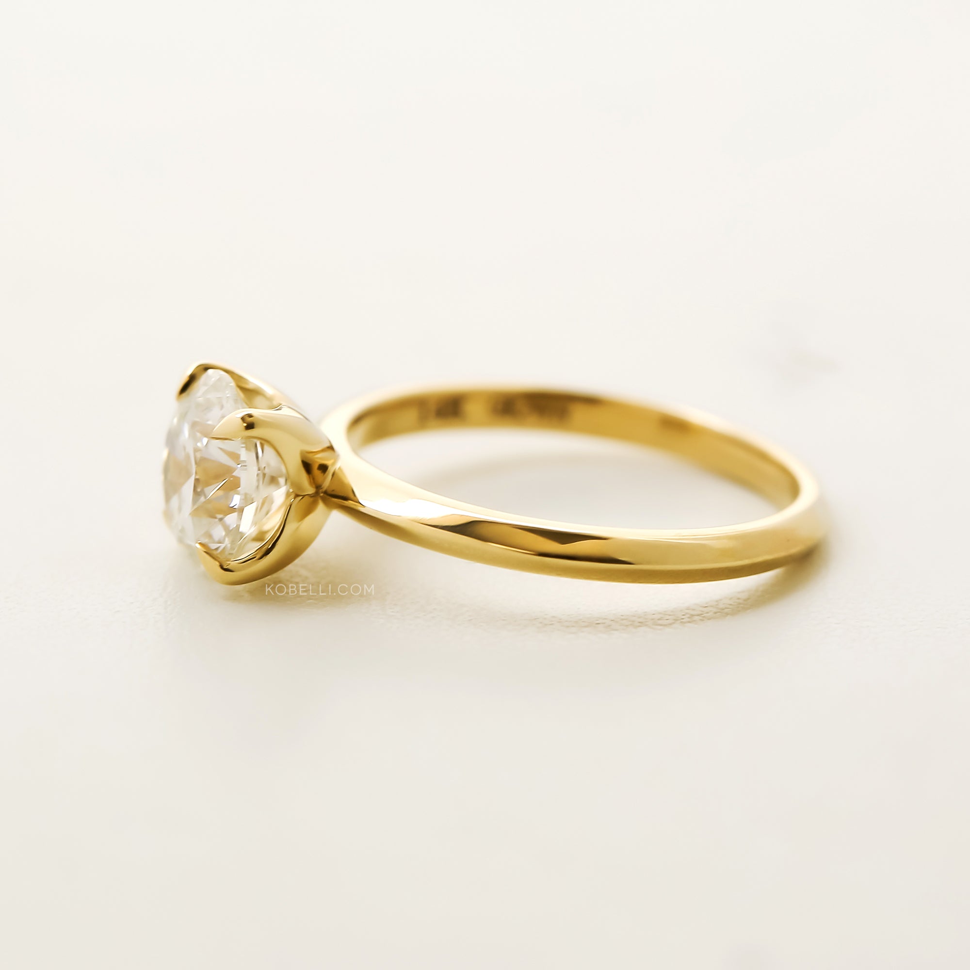 Louise designed this ring romancing the idea of a budding flower motif for the prongs. With Kobi's approval, she completed her design with a sleek knife-edged 2mm band in solid 14k gold metal (no crevices or hollowed areas). This durable and feminine design features a single round-brilliant center diamond, available exclusively in lab-grown diamonds.
