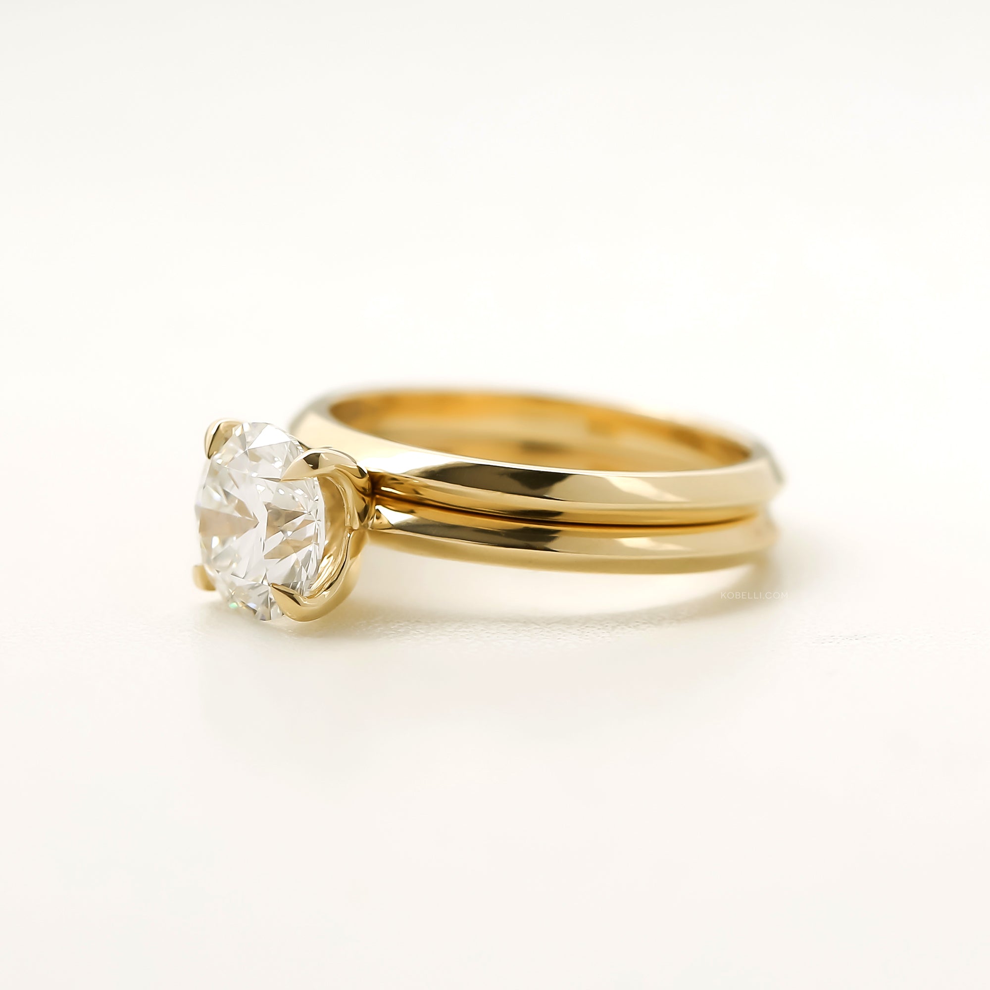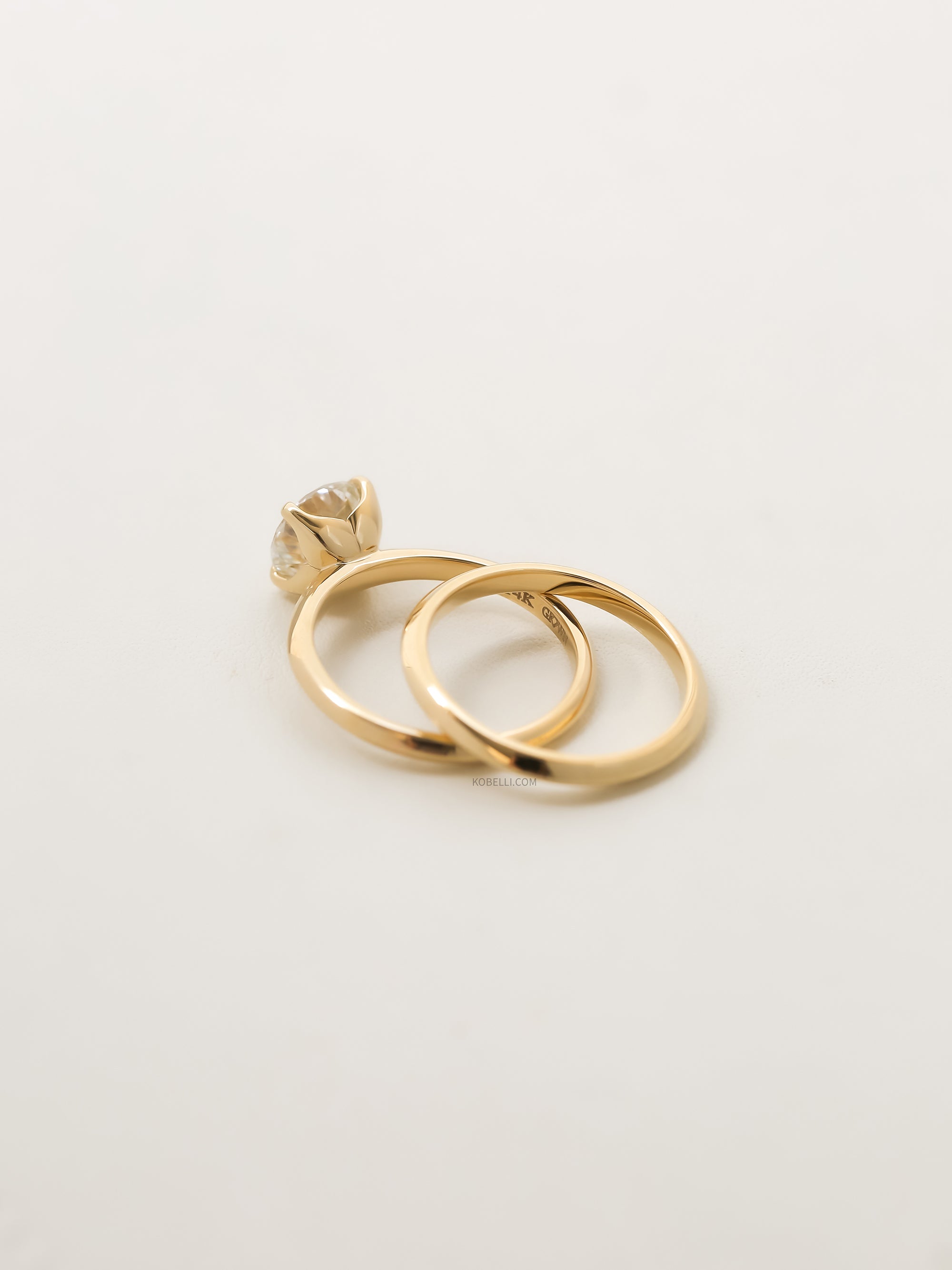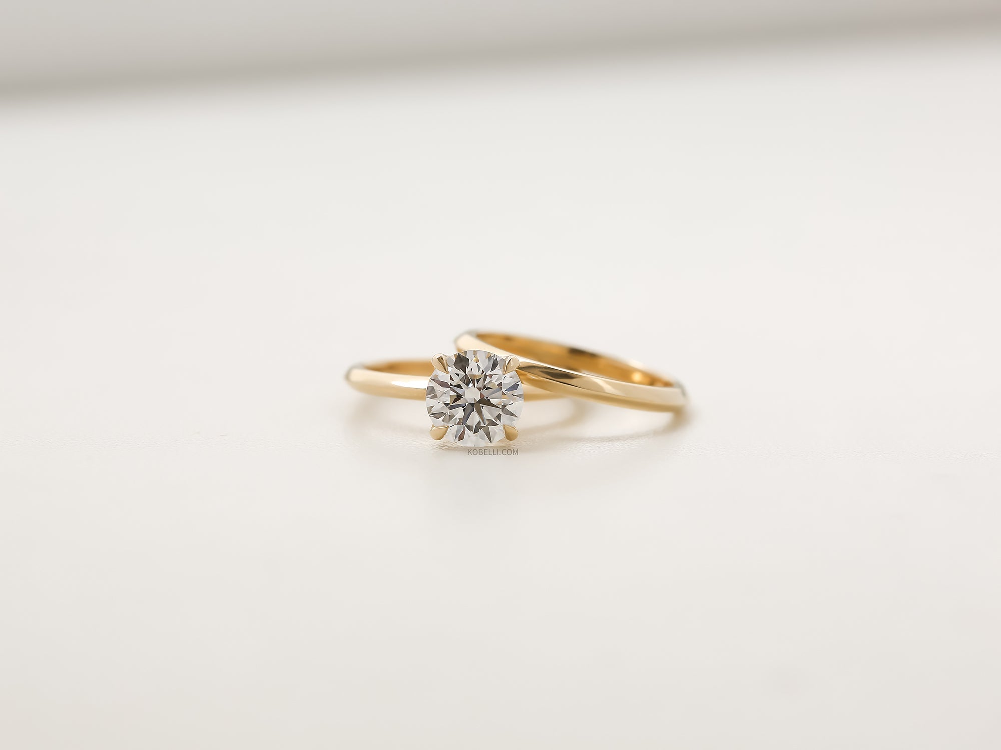 Louise designed this ring romancing the idea of a budding flower motif for the prongs. With Kobi's approval, she completed her design with a sleek knife-edged 2mm band in solid 14k gold metal (no crevices or hollowed areas). This durable and feminine design features a single round-brilliant center diamond.