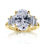 Five eye-catching elongated diamonds are carried over a solid gold band. The center oval diamond brings a brilliance of sparkles while the emerald diamonds and baguette diamonds bring flashy glimmers with their straight step facets.