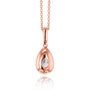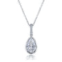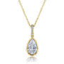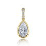 A stunning pear shape diamond sits within a thick solid gold setting. Additional white lab grown diamond line the bail. The large opening on the bail is designed to allow for a wide variety of chains to string easily onto this pendant.