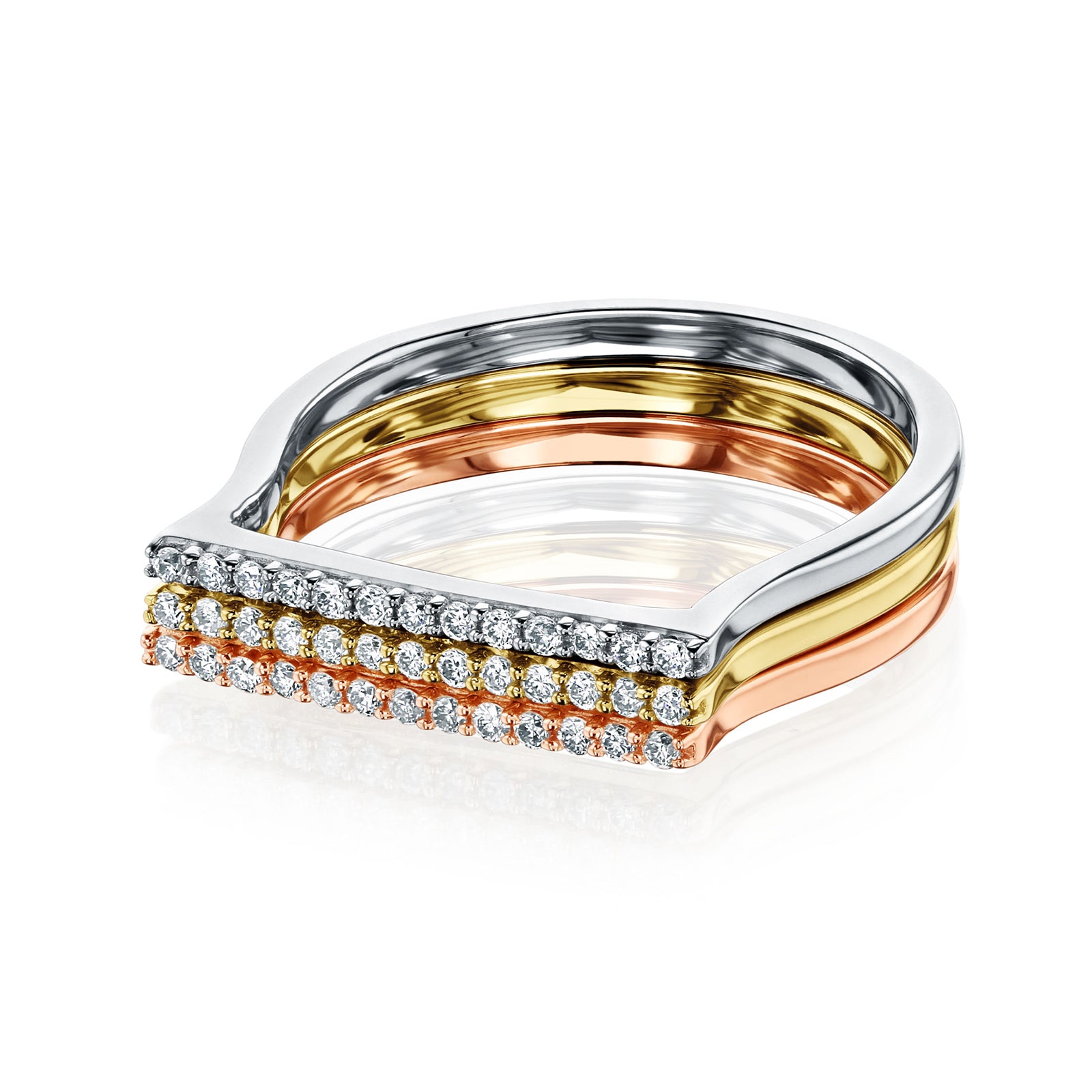 This tri-color set of minimally clean lines of round lab-grown diamonds is an excellent way to make a stylish new addition to your everyday wear. The three metal colors - white, rose, and yellow gold - together convey a fun and colorful vibe whilst keeping the overall look simple and chic!