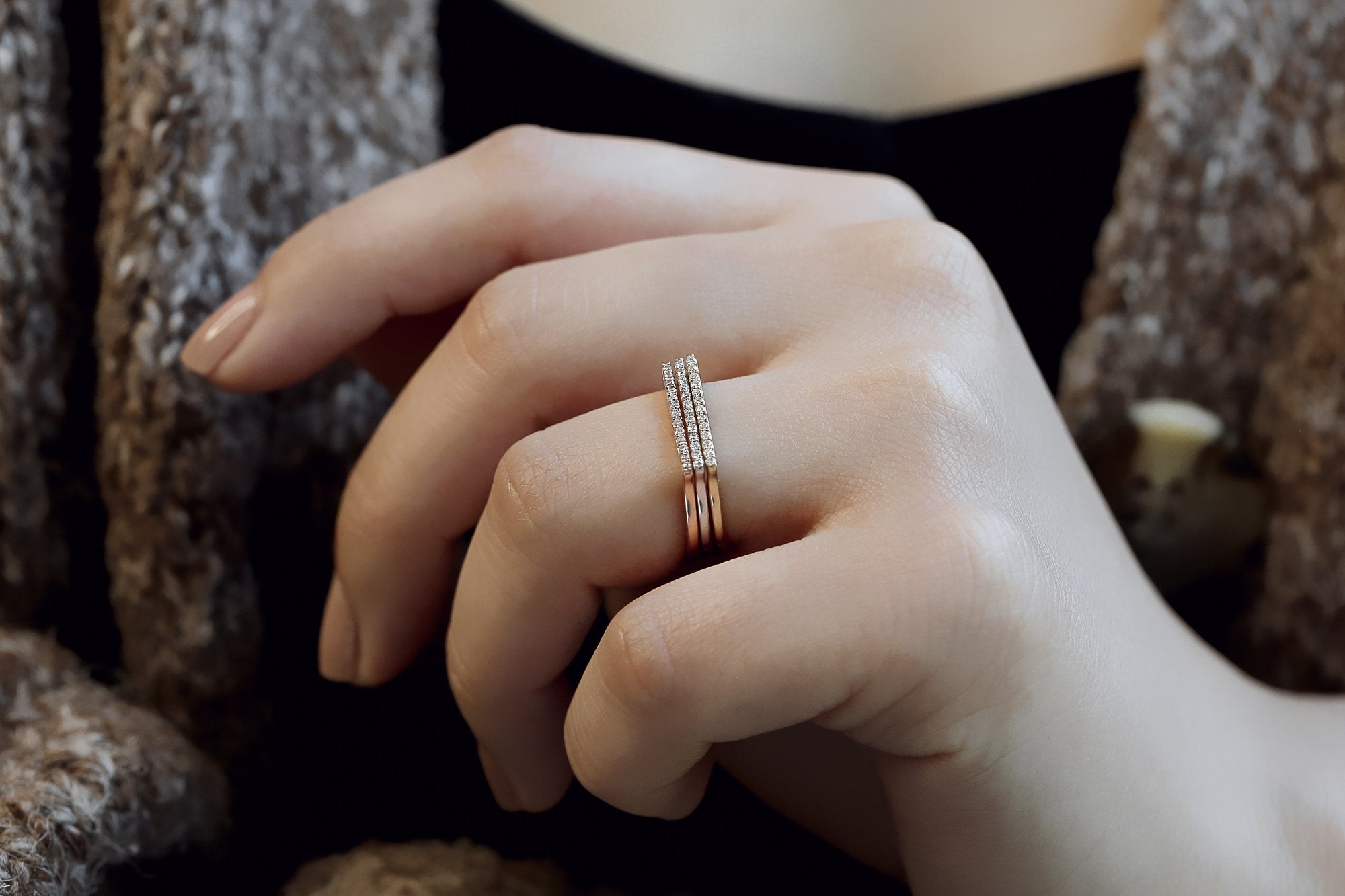 - Remember that the wider the width of the band is, the tighter it will fit. We recommend going up in size between 1/4 and 1/2 for rings with a wider design. This may also apply when wearing bridal sets and stackable rings.