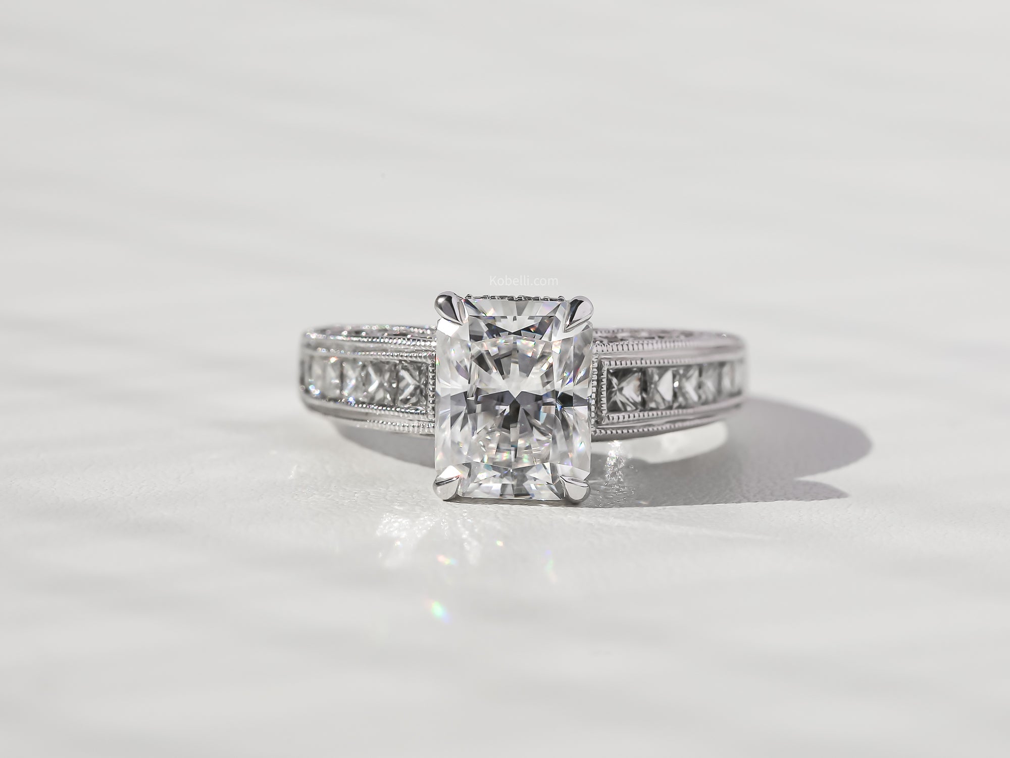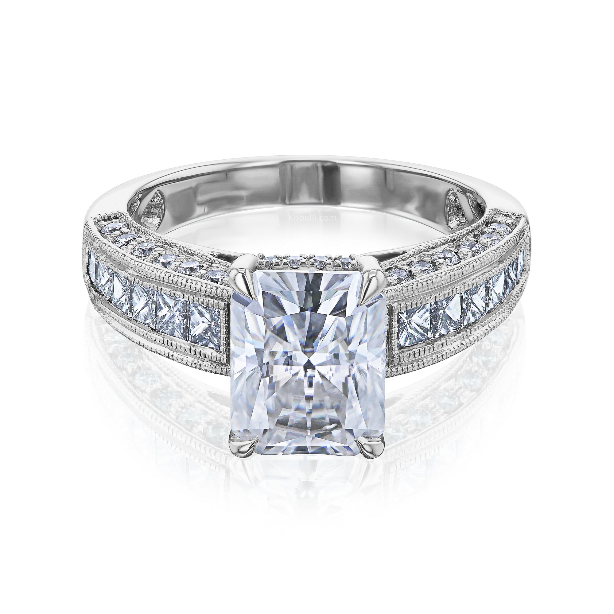 A radiant (i.e. rectangular) brilliant-cut moissanite centers itself atop this diamond lined white gold ring in a stunning display.