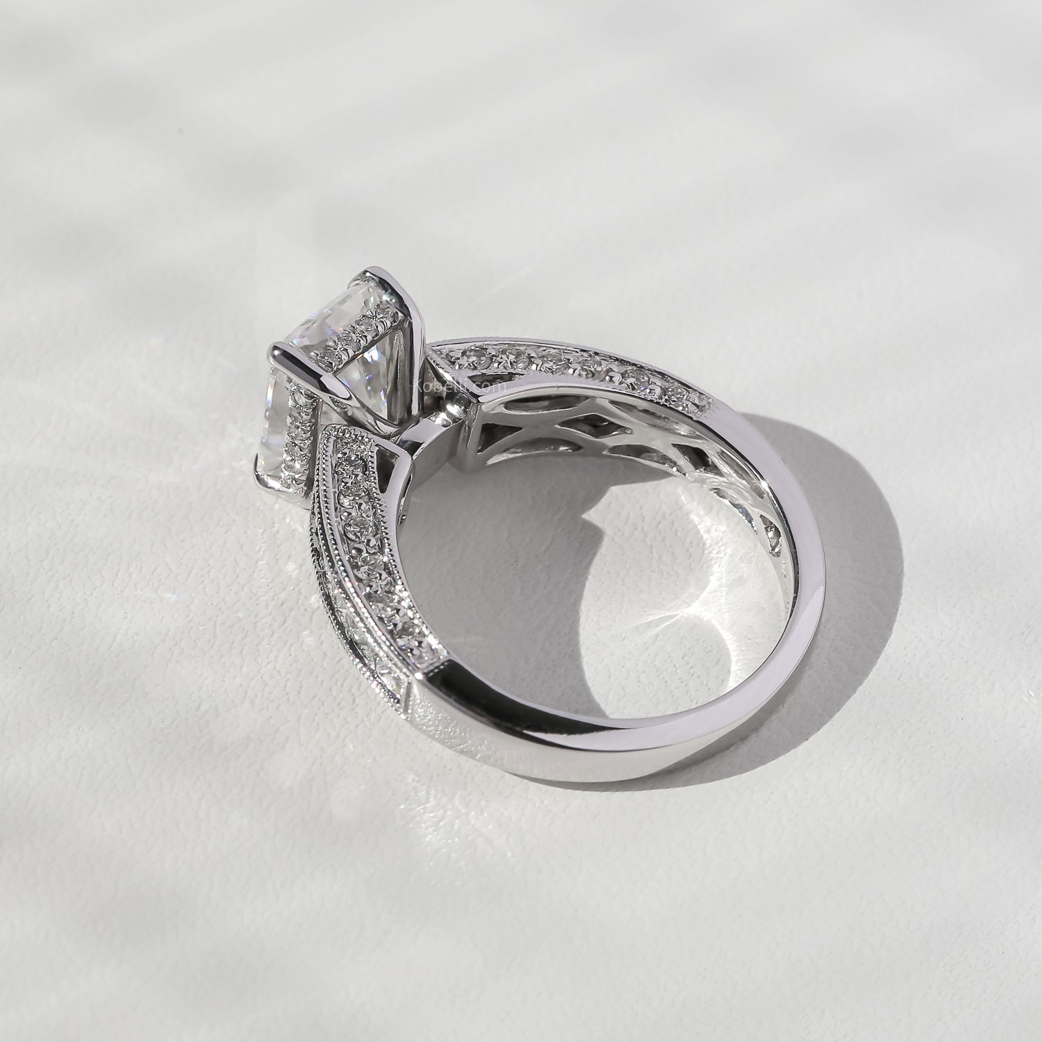 The top surface showcases princess-cut diamonds while the sides exhibit round accent-sized diamonds, each carefully crafted in place to a leveled setting.