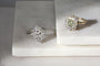 The opulent graduating halo of round lab-grown diamonds takes inspiration from the popular frocks adorned with frills and ruffles that conquered the royal court and beyond, with the setting of the rings emulating the gilded palace gates of Versailles.