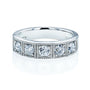 Five milgrain framed diamonds are individually set into its own square design on this eye-catching wedding band. The diamonds are recessed into the band for a flat leveled surface to protect the stones. Each diamond is held with four prongs. The band is 5.4mm wide tapering delicately to 3.35mm along the bottom of the ring. Made with solid 14-karat gold, not plated or filled, this robust diamond ring satisfies all the criteria of traditional bridal fashion with poise and sophistication.