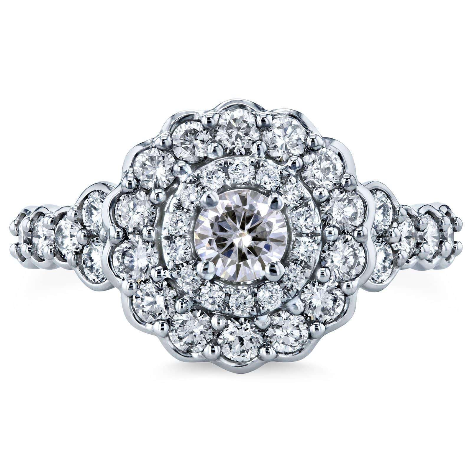 Genuine round white diamonds and a pristine lab created moissanite decorate this cute ring in a flowery design. The stones are set into 14-karat white gold for an all-white finish of symbolic clarity. The ornate style brings unique character while maintaining refinement from the luxury materials.