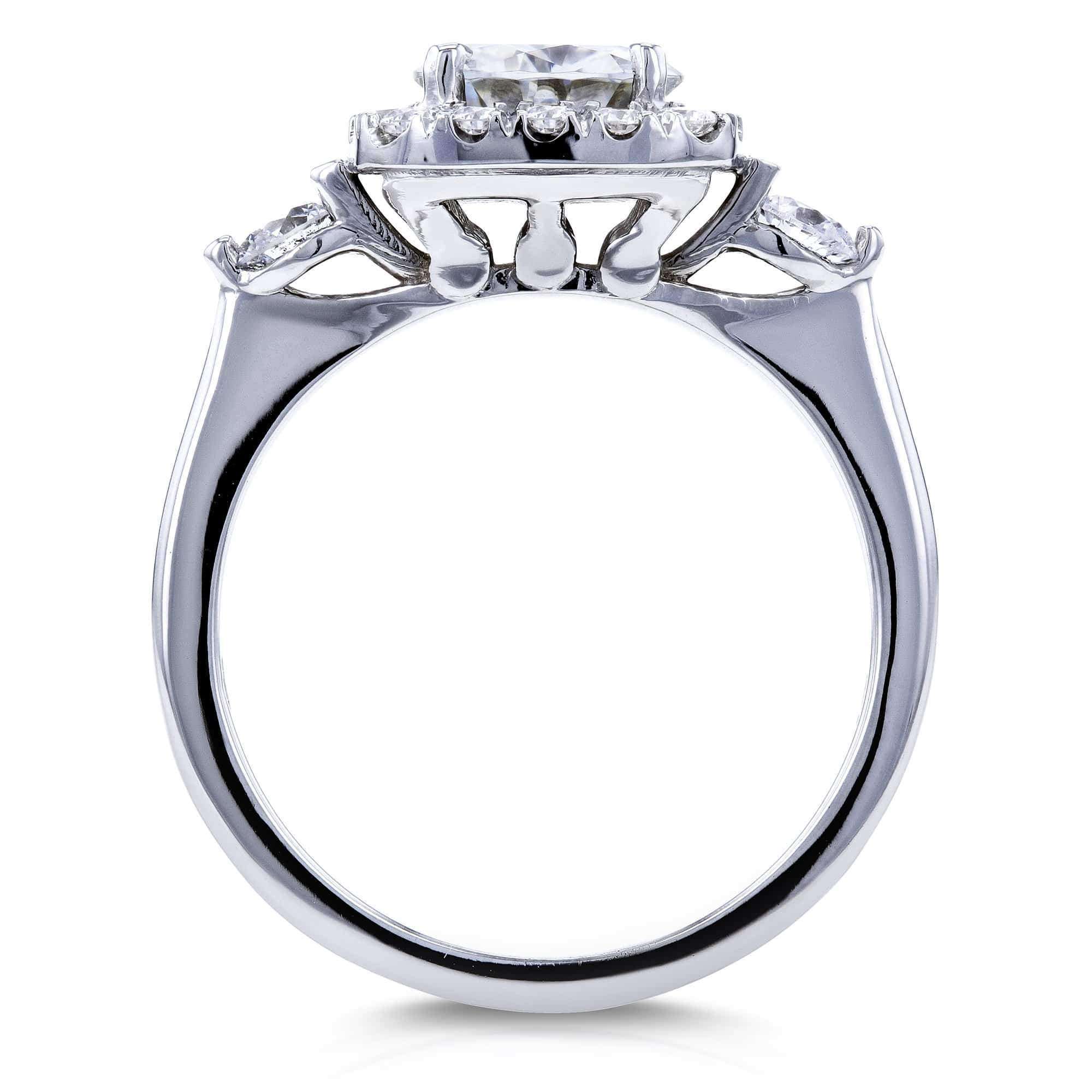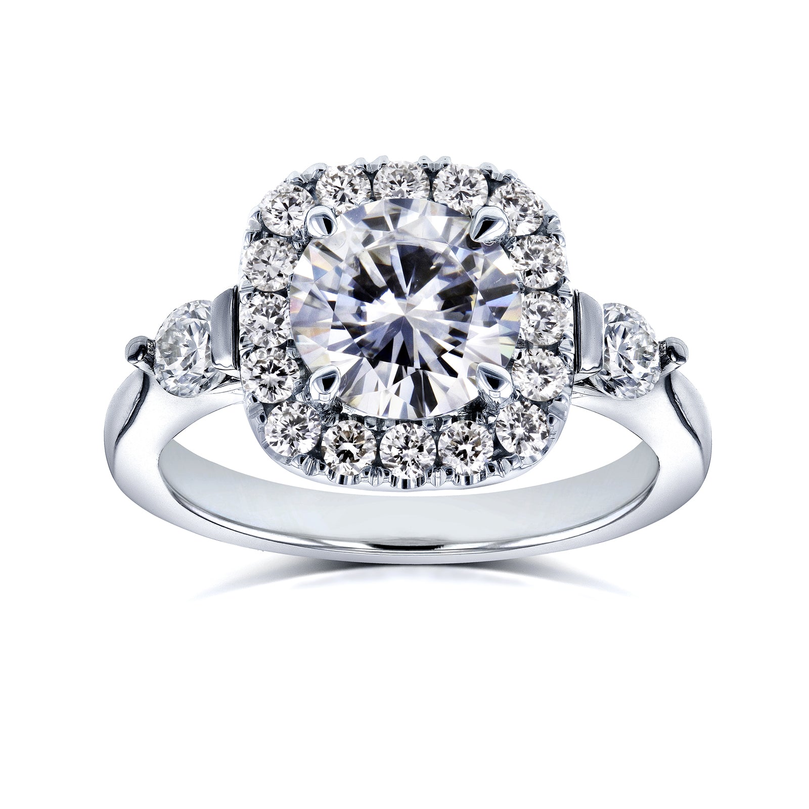 A one carat round cut moissanite is placed inside a halo of real diamonds on solid 14-karat highly polished white gold.