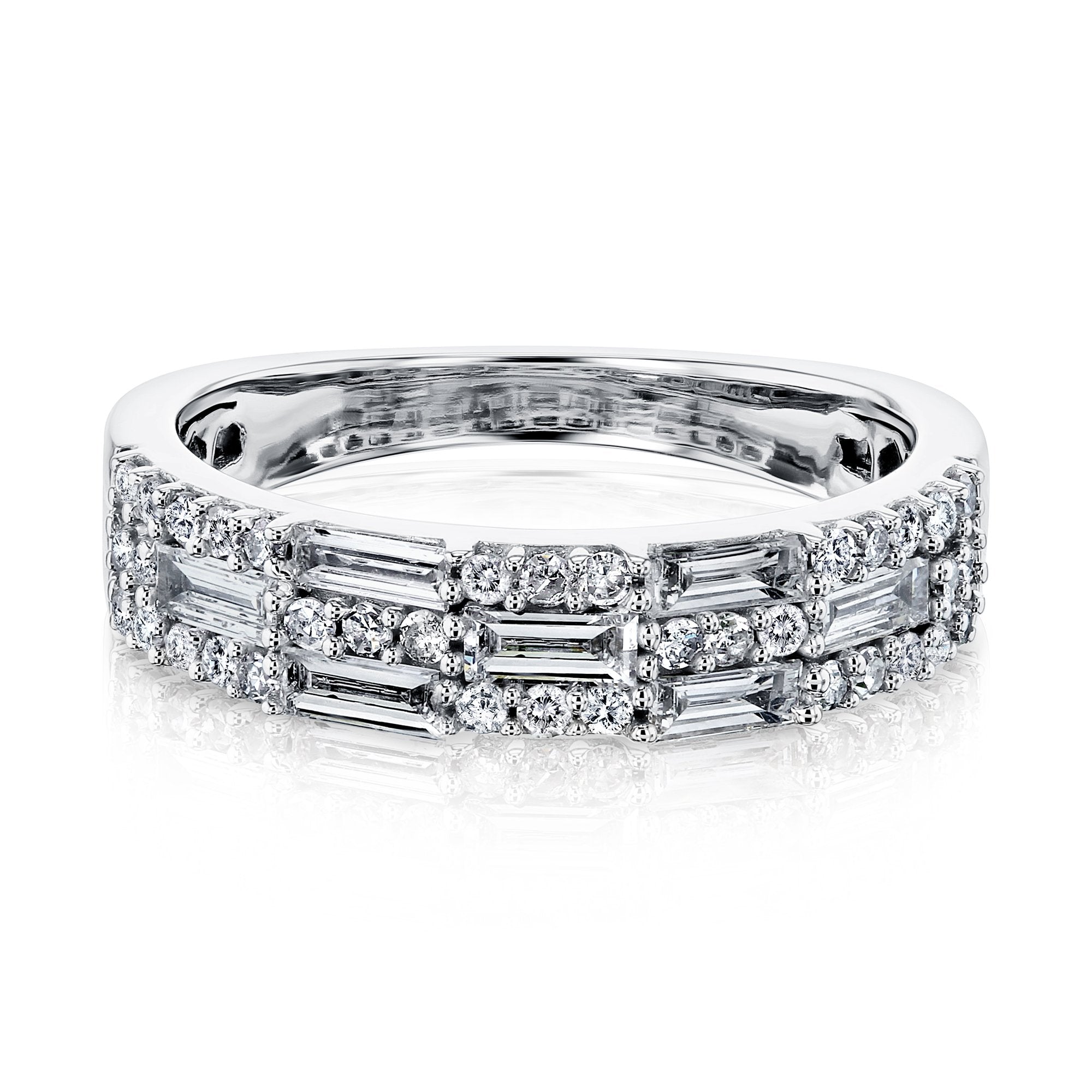 Beaded surface prongs carry over 40 diamonds across this white gold wedding band. An assortment of elongated baguette and round diamonds culminate into an eye catching pattern. The unique pattern brings both glimmer and sparkle. Baguette diamonds create a flashy effect while accent sized round diamonds absorbs and refracts light in randomized fashion resulting in a shimmer.