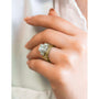 Each stone along the engagement ring is a lab-created moissanite. The centermost stone is 11x9 mm (4.9ct) while the secondary two stones are 5x3 mm (0.30ct each). The moissanites are each held in traditional 4-prong basket settings for a standard sophisticated look, ensuring this luxury statement ring is not an eccentric one.