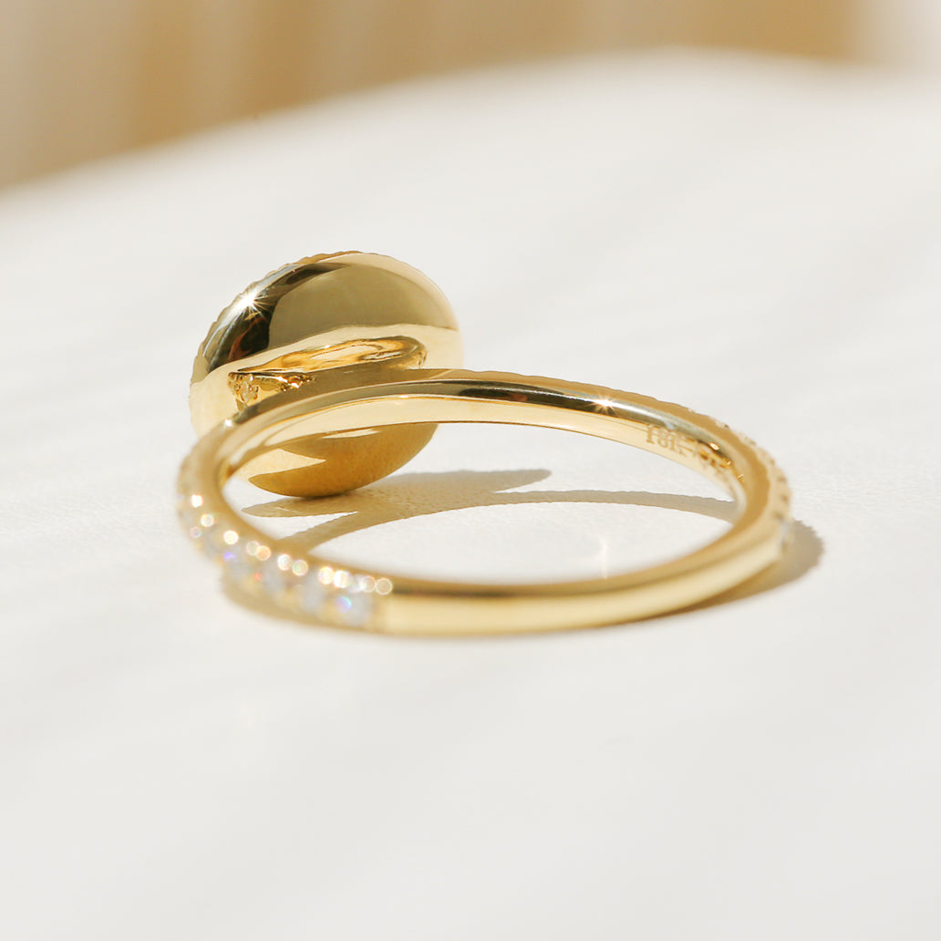 The diamonds are held atop a smooth golden oblong plate, over a perfectly circular diamond-lined gold band.