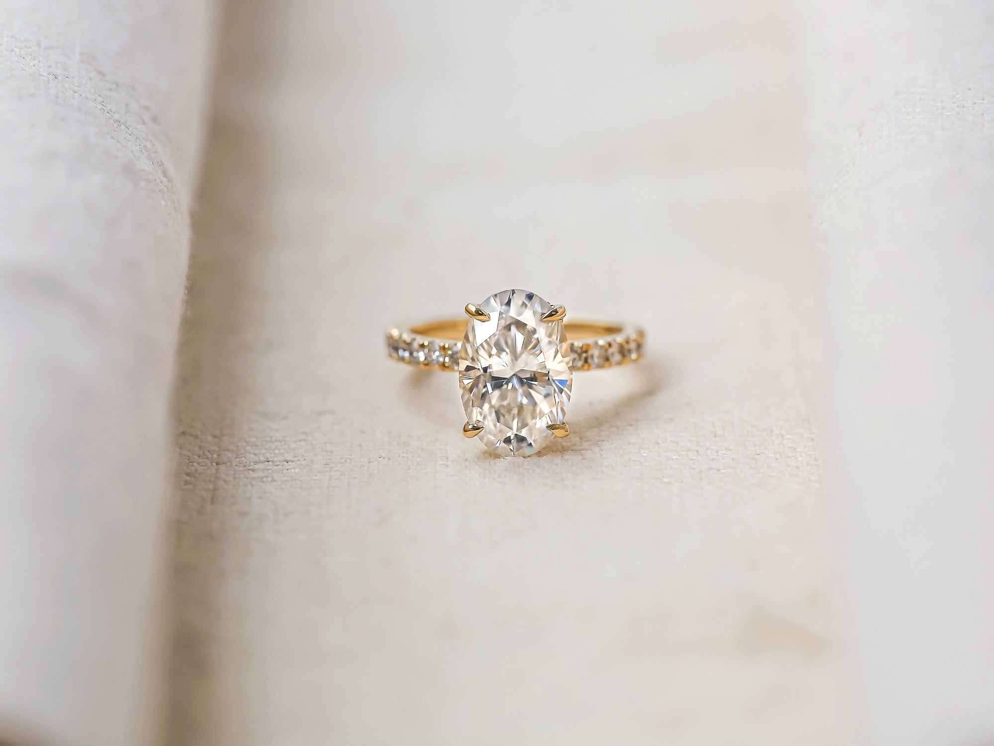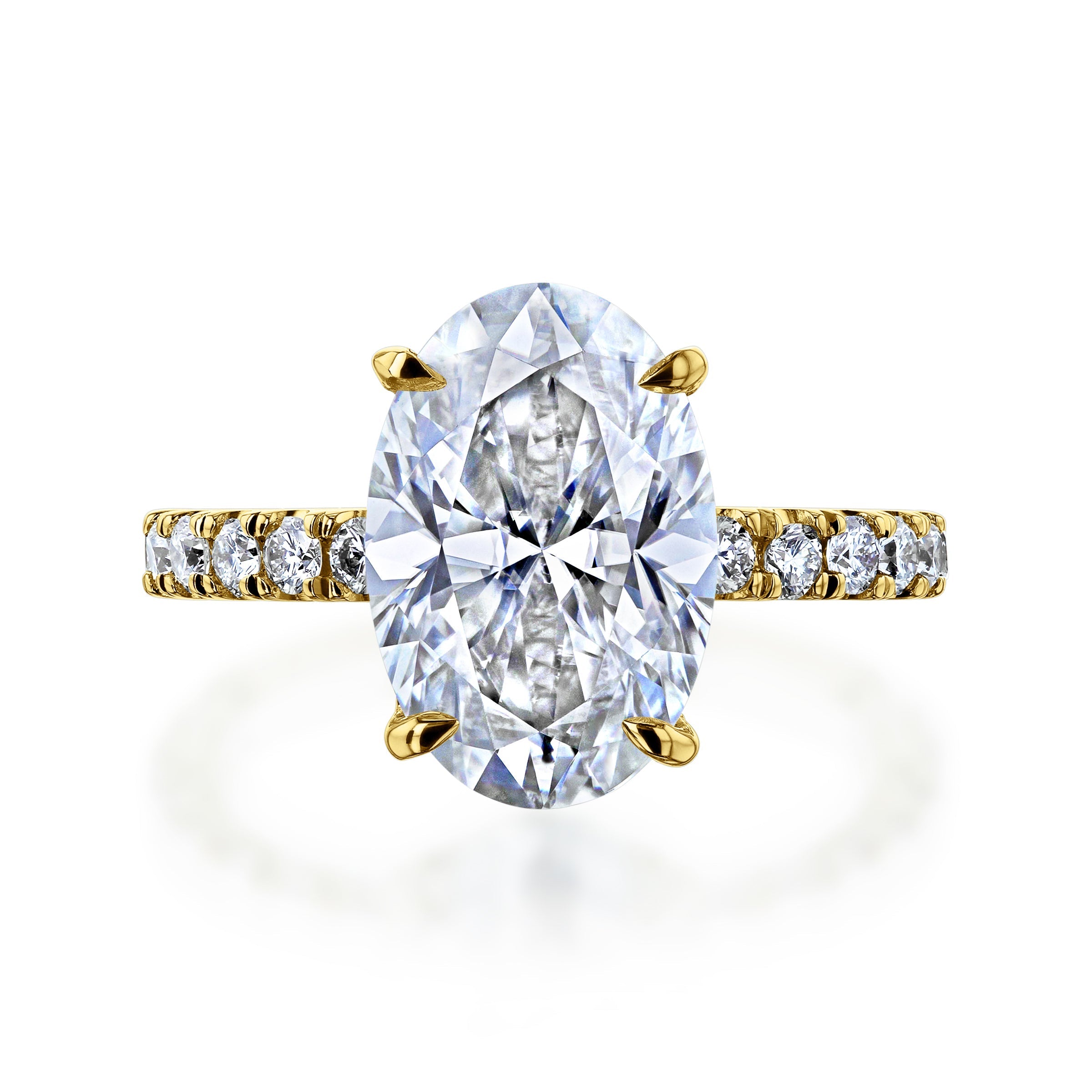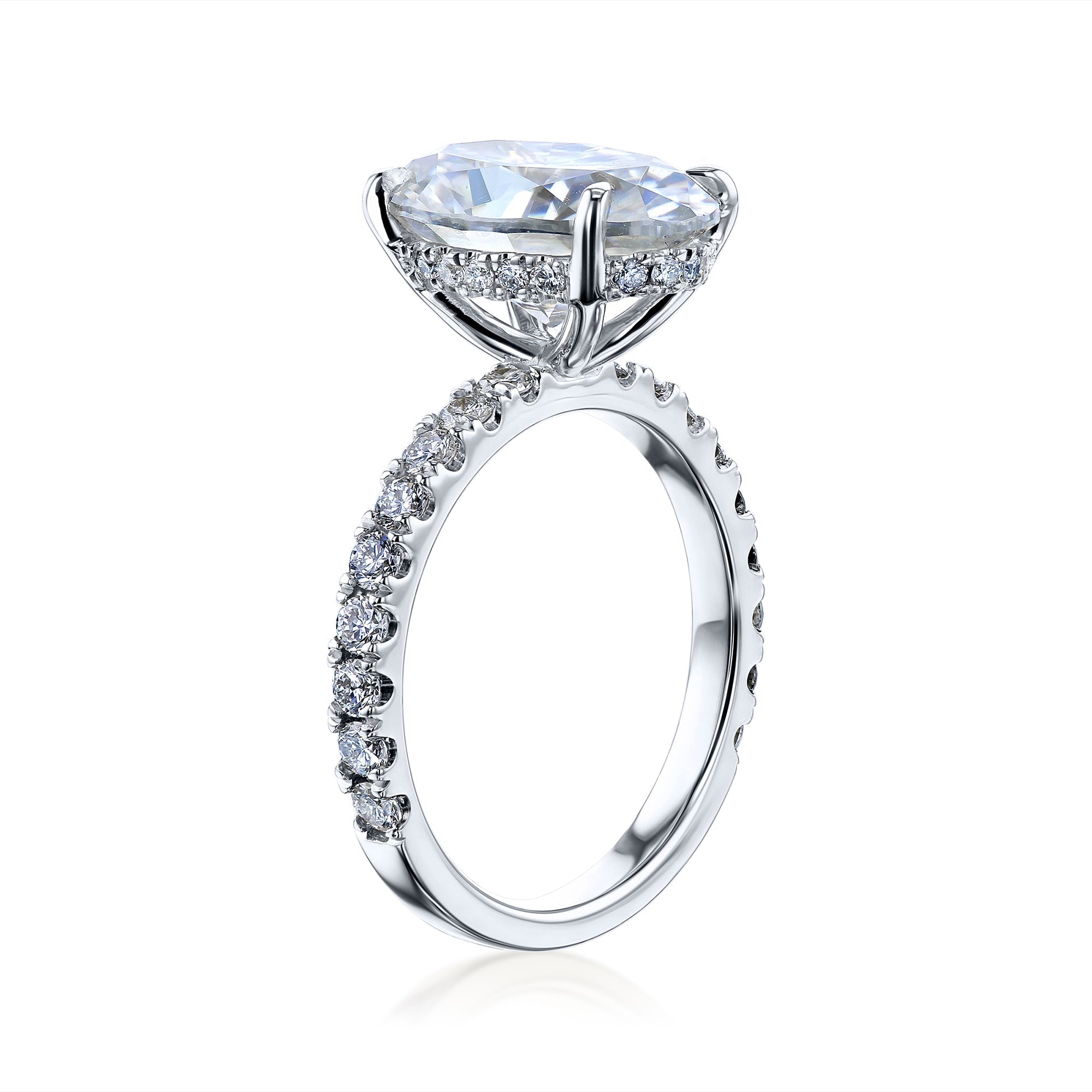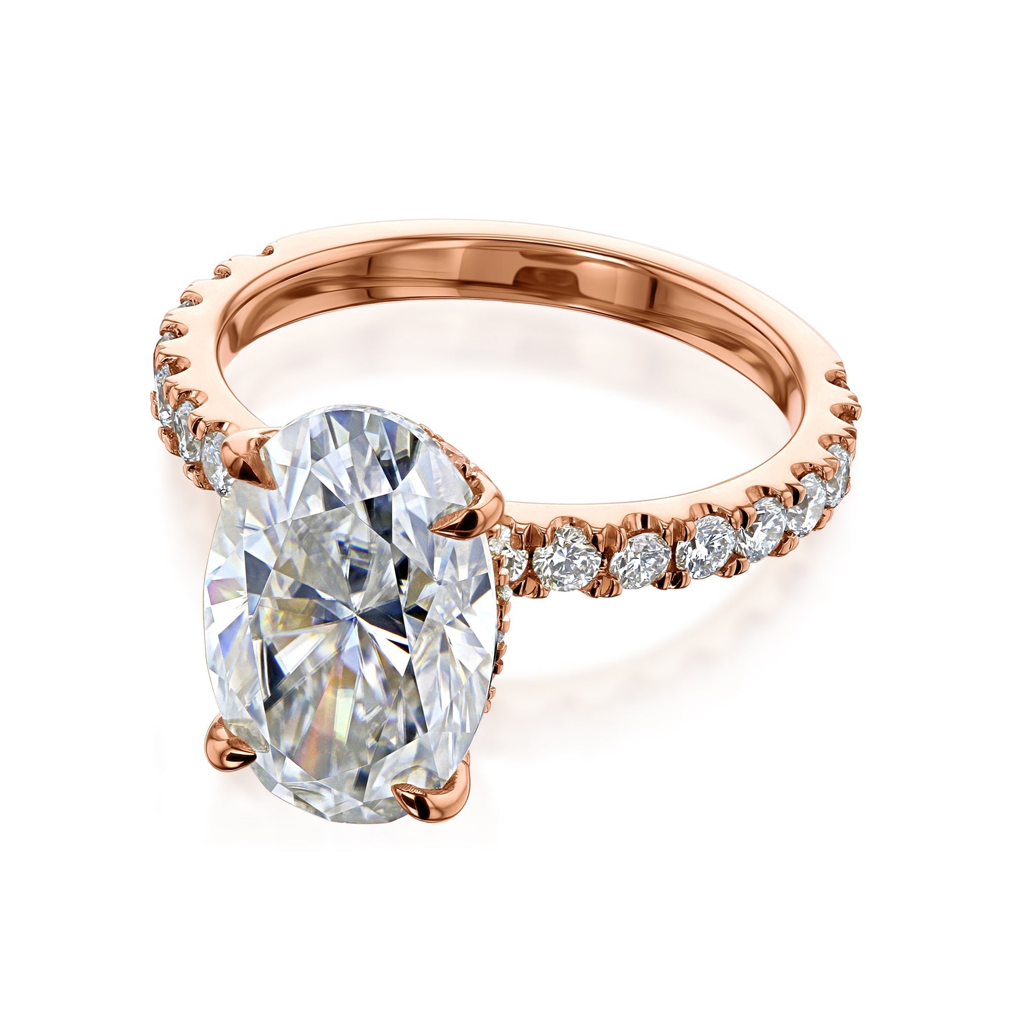 The Odette Bold Series Engagement Ring features a 3.00* Carat Oval Diamond center stone with a hidden halo of additional lab-grown diamonds in a slim floating basket setting.