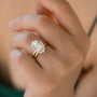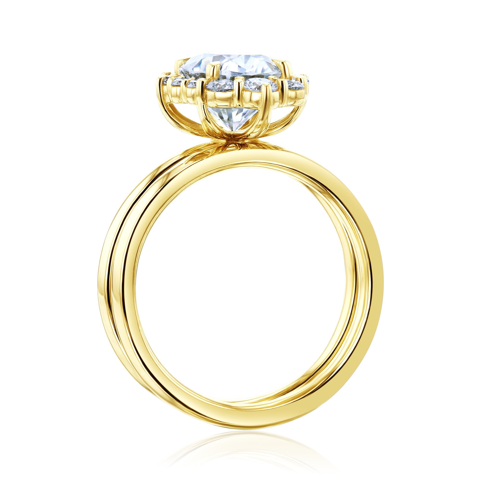 The opulent graduating halo of round lab-grown diamonds takes inspiration from the popular frocks adorned with frills and ruffles that conquered the royal court and beyond, with the setting of the rings emulating the gilded palace gates of Versailles.