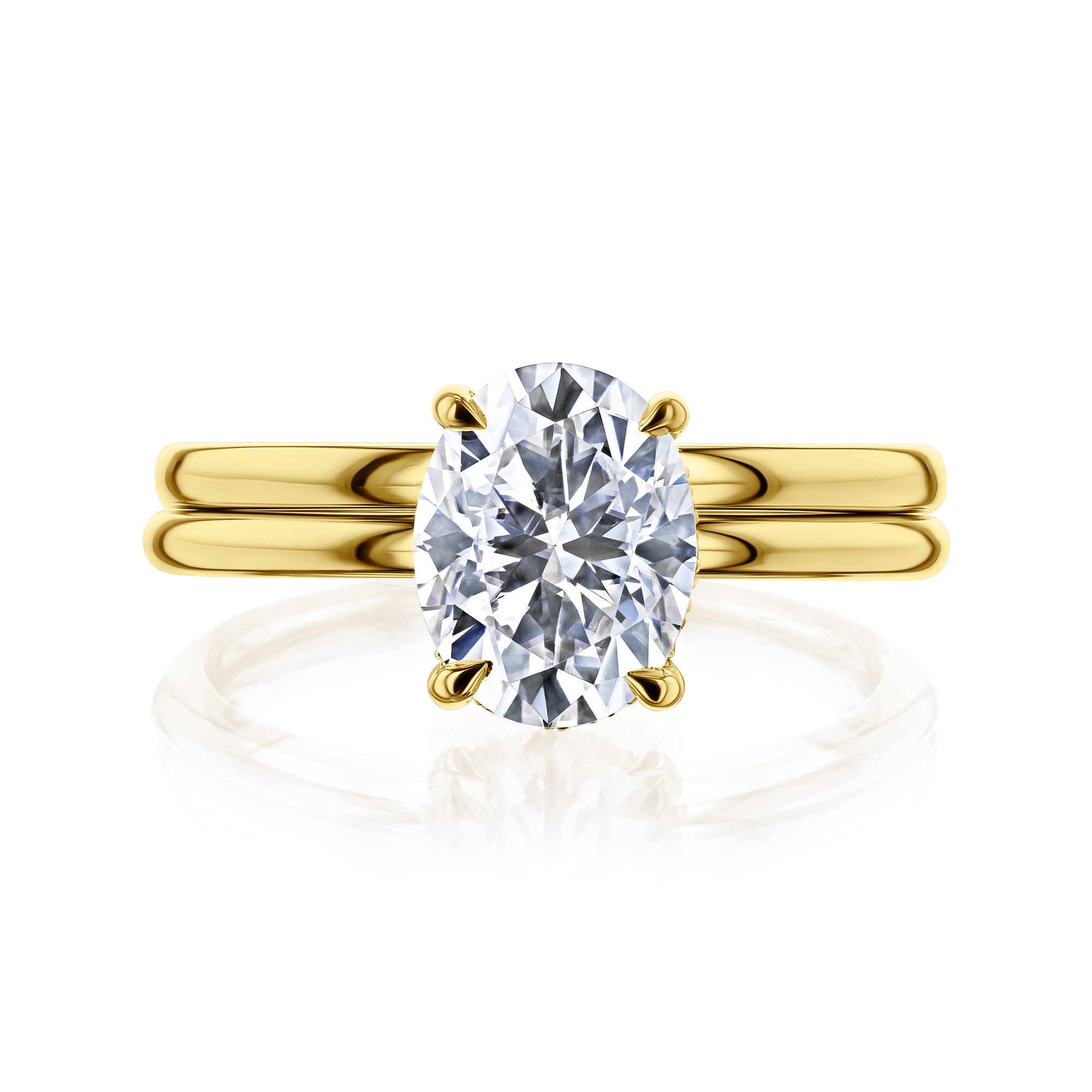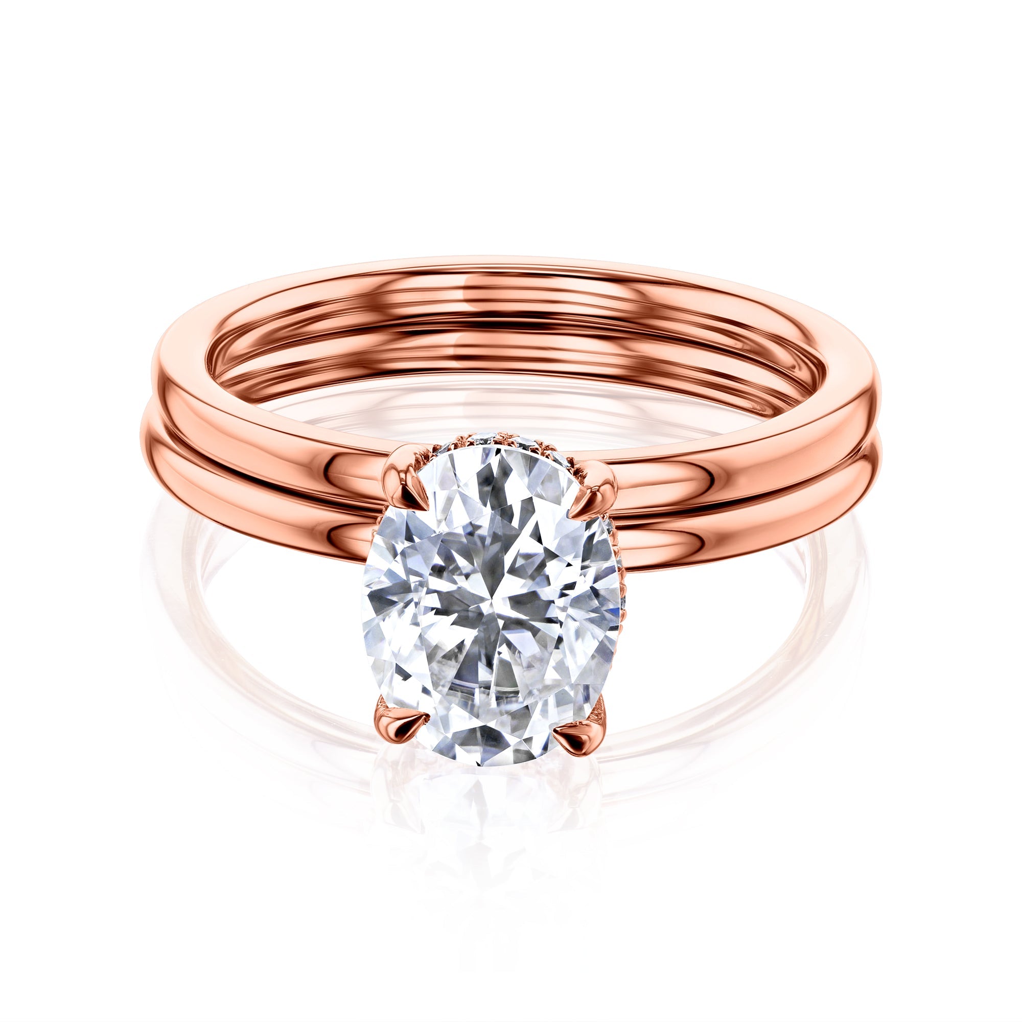 The Orah 9x7 engagement ring features a 9x7 mm (2.1ct) oval moissanite center stone with a hidden halo of lab-grown diamonds in a slim basket setting. The shank is a comfort-fit solid gold band crafted in 14-karat gold.