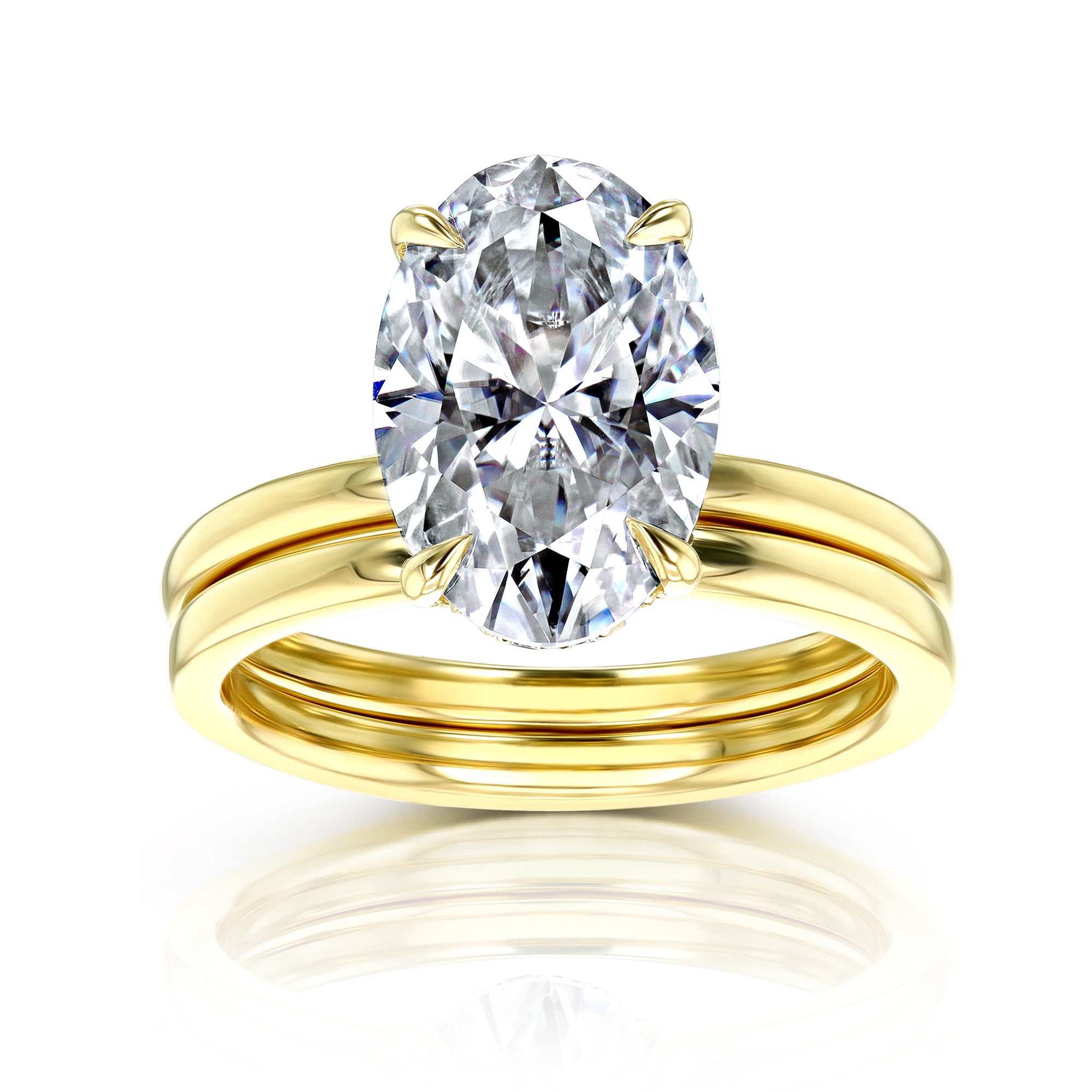 The Orah 12x8 Two-Piece Bridal Set features an engagement ring with a 12x8 mm (4 carats diamond equivalent weight) oval moissanite center stone with a hidden halo of lab-grown diamonds in a slim basket setting. The shank of both rings is a comfort-fit solid gold band crafted in 14-karat gold in high polish finish.