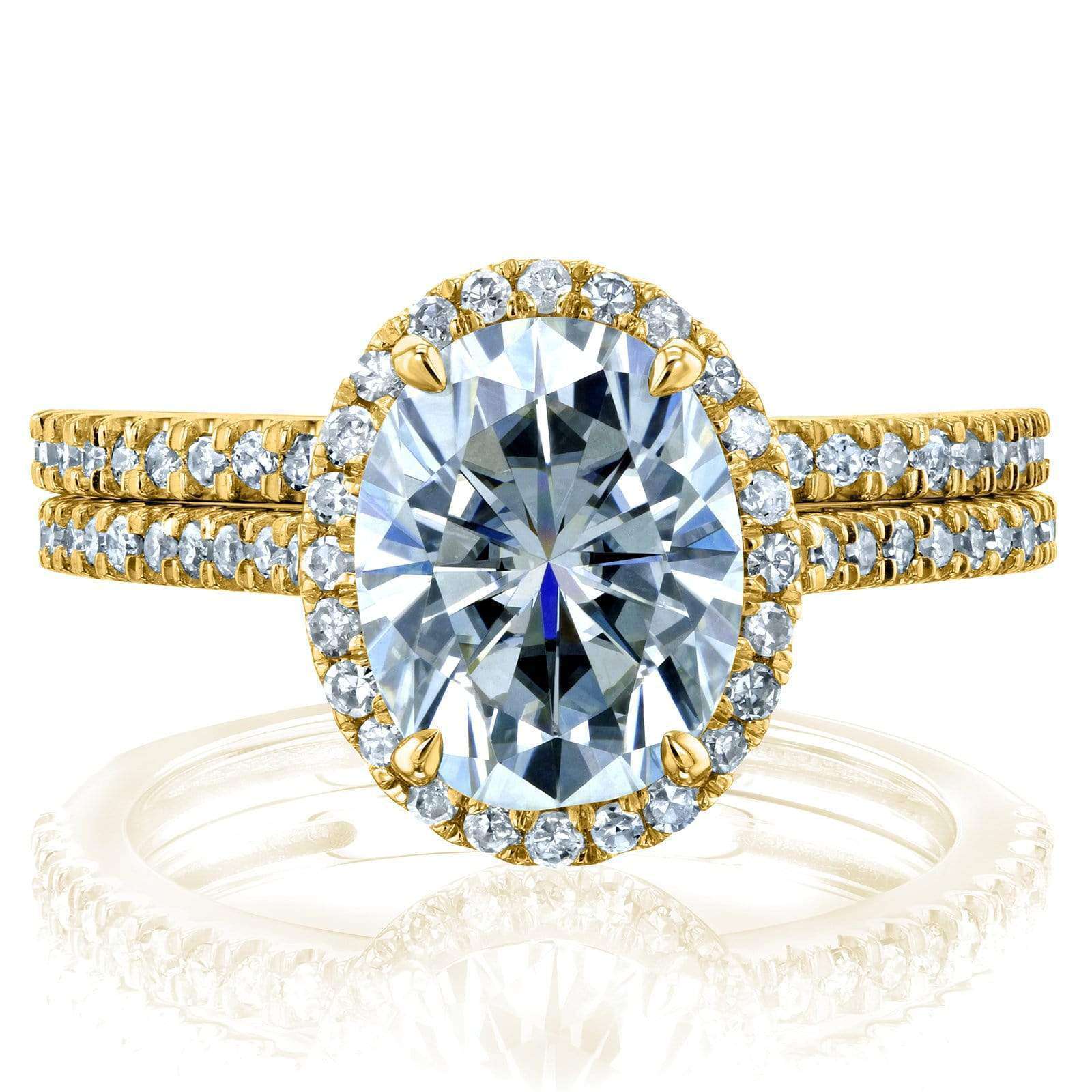 A two carat oval-cut moissanite captures the most brilliant of sparkles over this diamond and gold bridal set. Decorating this moissanite center stone are entirely natural earth mined diamonds for a perfect mix of contemporary and tradition. The moissanite showcases pristine clarity whereas the diamonds showcase shimmering luxury. The rings are made with 14-karat yellow gold and are finished with a beautiful high polish.