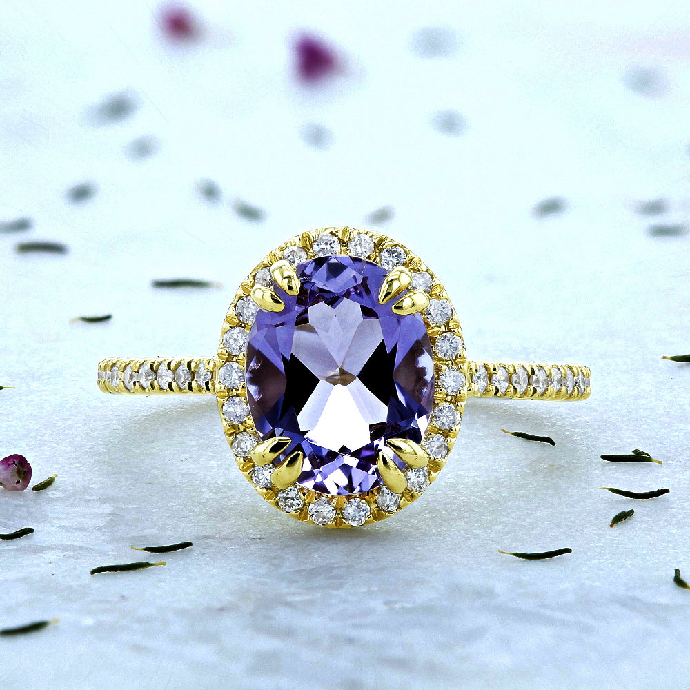 A 9x7 mm oval gemstone is surrounded by sparkling natural white diamonds on a halo style gold ring. The head is carried by a basket prong setting over a slender band. Slender bands offer contrasting widths from the shank to the top to best showcase the center stones in an attention grabbing design. The ring is made with highly polished 14-karat gold.