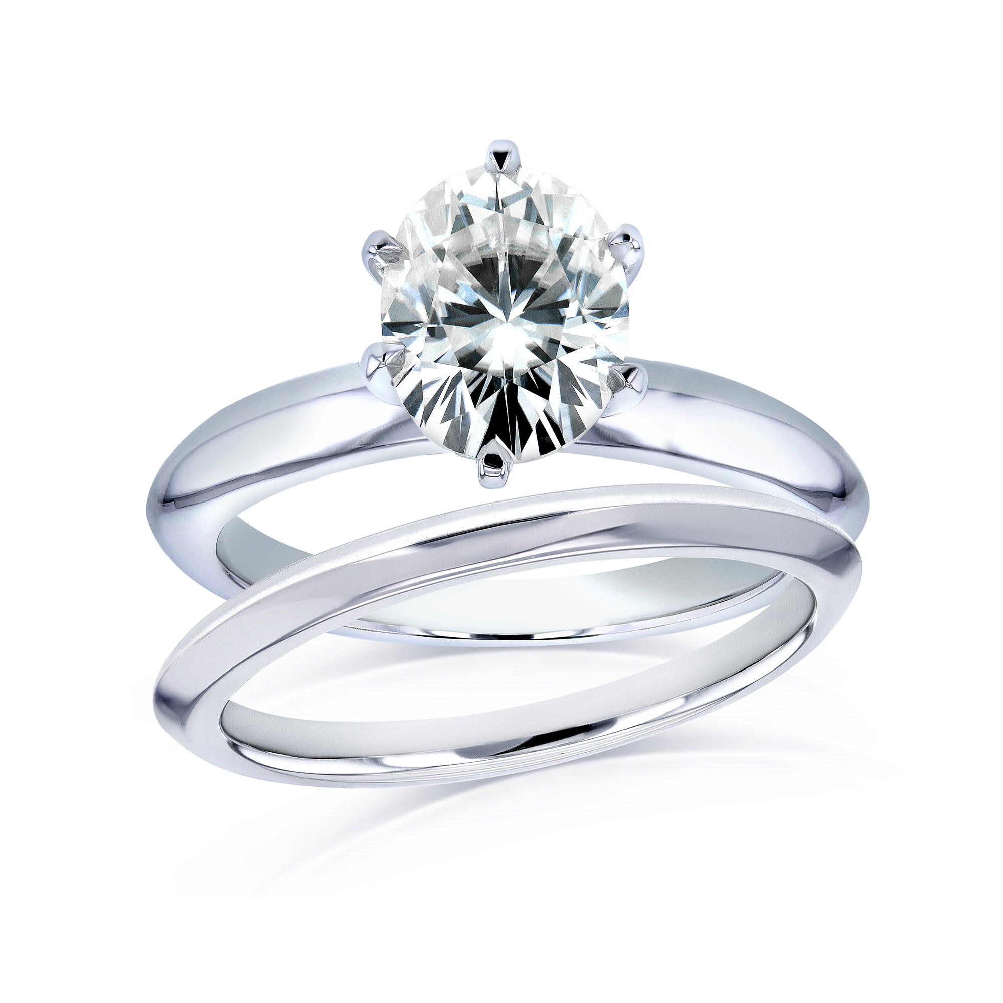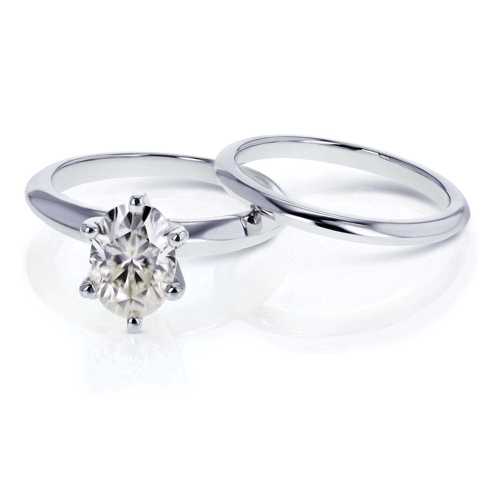 Six prongs carry an oval 8X6mm moissanite on this solid 14-karat gold engagement ring and is paired with a solid white gold wedding band. The rings are finished with a high polish creating a refined statement. Solitaire rings dedicate attention to a single stone for an iconic picturesque style of sophistication and endearment.