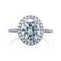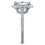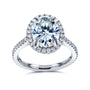 A whopping 3 carat moissanite center stone sits in a halo of sparkling white diamonds. The precious stones are set in fourteen karat gold. Moissanite has high refraction quality surpassing even diamonds which makes it the perfect center stone catching light at every little movement. The moissanite is a lab-created silicon carbide gem while the diamonds are naturally mined from conflict-free sources.