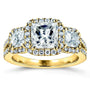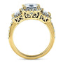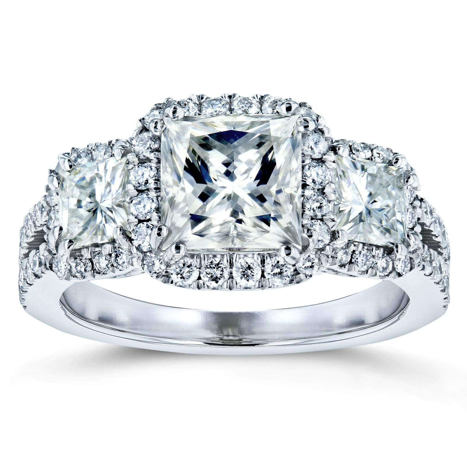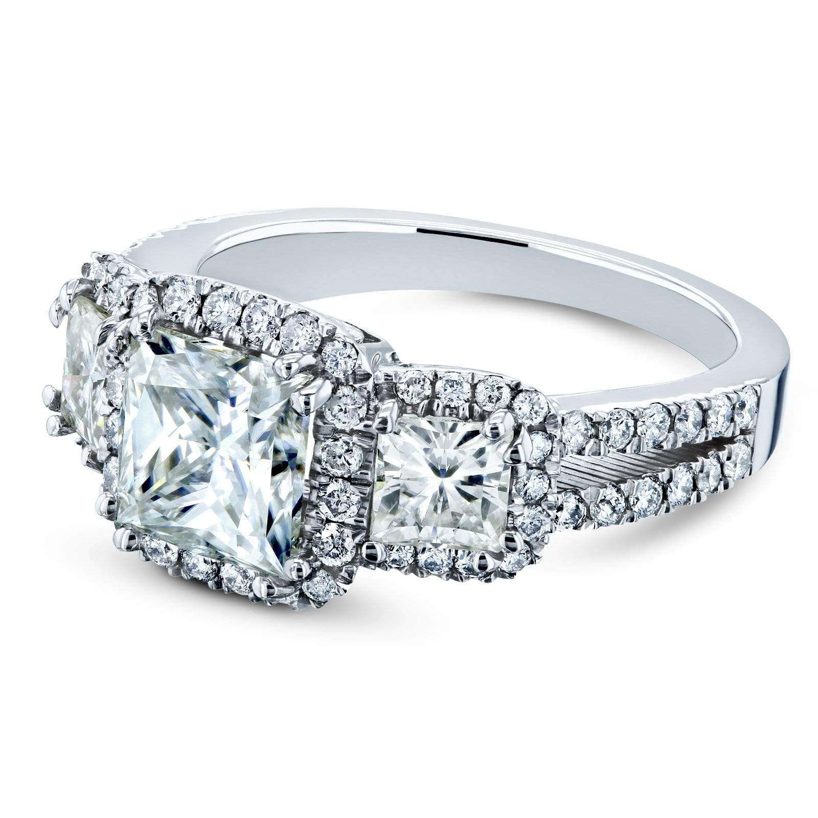 Three princess cut moissanites top this classic department-store style engagement ring in 14-karat gold surrounded by natural white diamond accents.