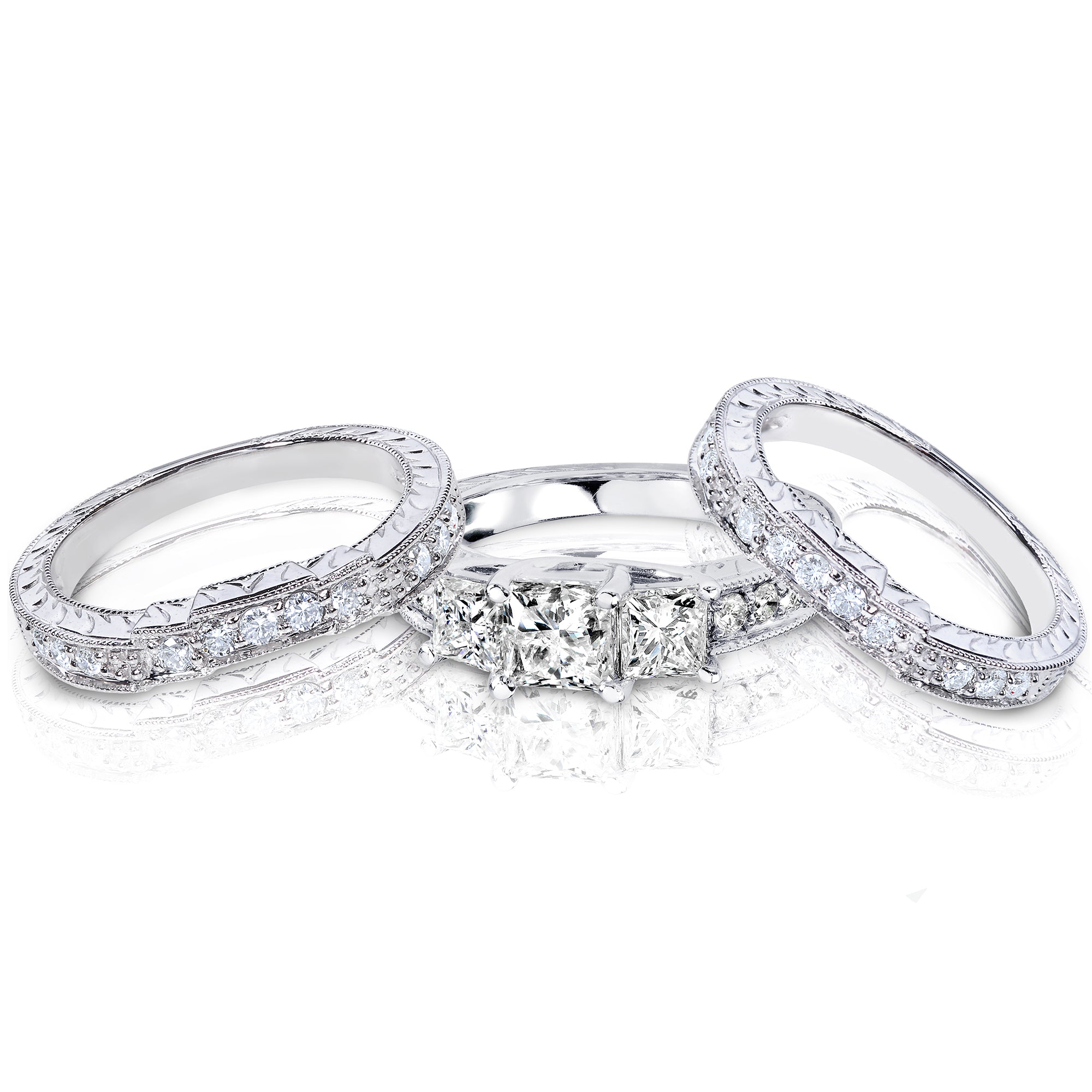 A lore of vintage fashion takes to this design for a sentiment of tradition. Etched patterns decorate the white gold metal while milgrain edges lace the rings for fanciful handiwork that offers optimal shimmers with the dynamic shapes. This set can be worn as one, two, or all three rings, depending on how much your want to dress up or down your style at any given event.